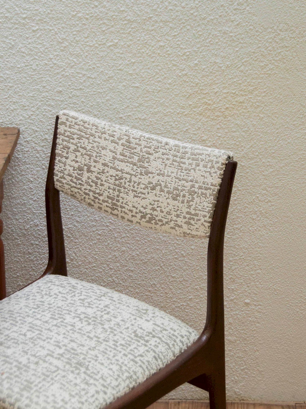 Adopt this pair of dark wood Scandinavian chairs with an airy design and balanced proportions. Their recently reupholstered seat in a two-tone textured fabric with a speckled pattern adds a contemporary and comfortable touch, ideal for a dining room, a workspace, or a cozy living room. The wood, re-lacquered to restore its shine, highlights the elegant simplicity of the set and fits into warm and refined atmospheres. Some signs of use preserve their authenticity. Length: 42 cm Width: 44 cm Height: 79 cm Seat height: 46 cm Condition: Used: Item that has been used. Item showing some signs of superficial wear... Used: Item that has been used. Item showing some signs of superficial wear, fully operational and working correctly. It may be a display model or an item returned to the store after a short period of use. Any imperfections. Color: Multicolor Height: Wood, Fabric Width: Chairs Brand: Debongout Type: Vintage product Material: Wood, Fabric Style: Contemporary
