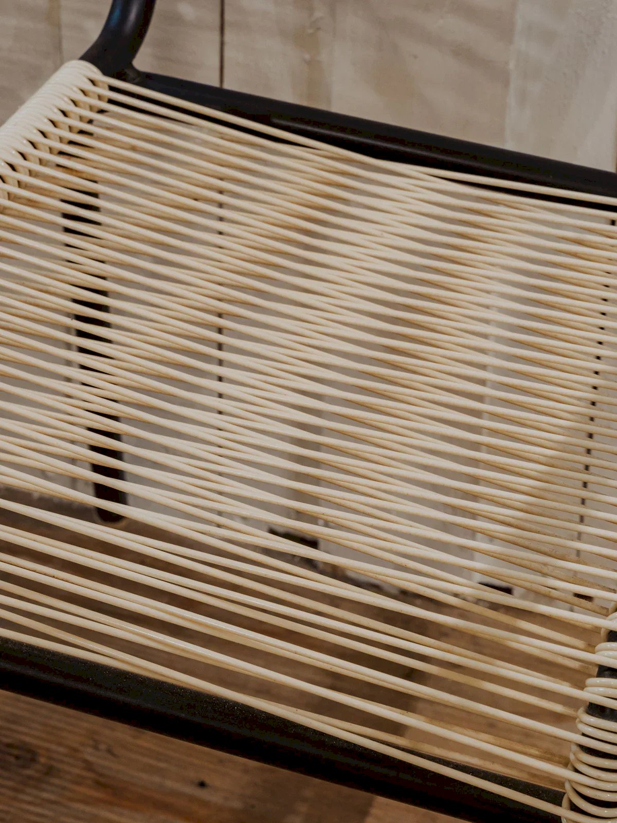 Adopt this pair of 1950s chairs with a graphic charm: a seat and backrest made of woven white "scoubidou" resting on a black metal frame. The contrast of materials adds a retro signature, while their profile and standard-height seat ensure comfort suitable for a dining table or a compact dining area. Ideal in pairs for a kitchen or bistro space, they create a warm atmosphere. Length: 54 cm Width: 38 cm Height: 82 cm Seat height: 40 cm Condition: Used: Item has been used. Item showing some superficial signs of wear, fully operational and functioning correctly. It may be a demonstration model or an item returned to the store after a short period of use. any imperfections. Color: Multicolor Height: Scoubidou, Metal Width: Chairs Brand: Debongout Type: Thrifted product Material: Scoubidou, Metal Style: Contemporary
