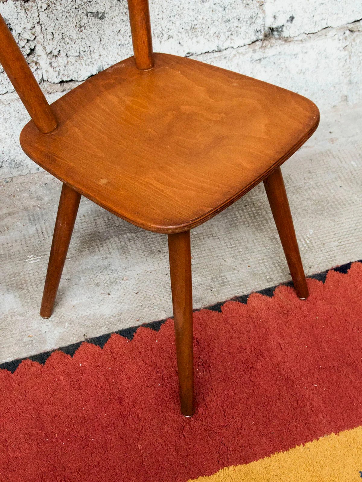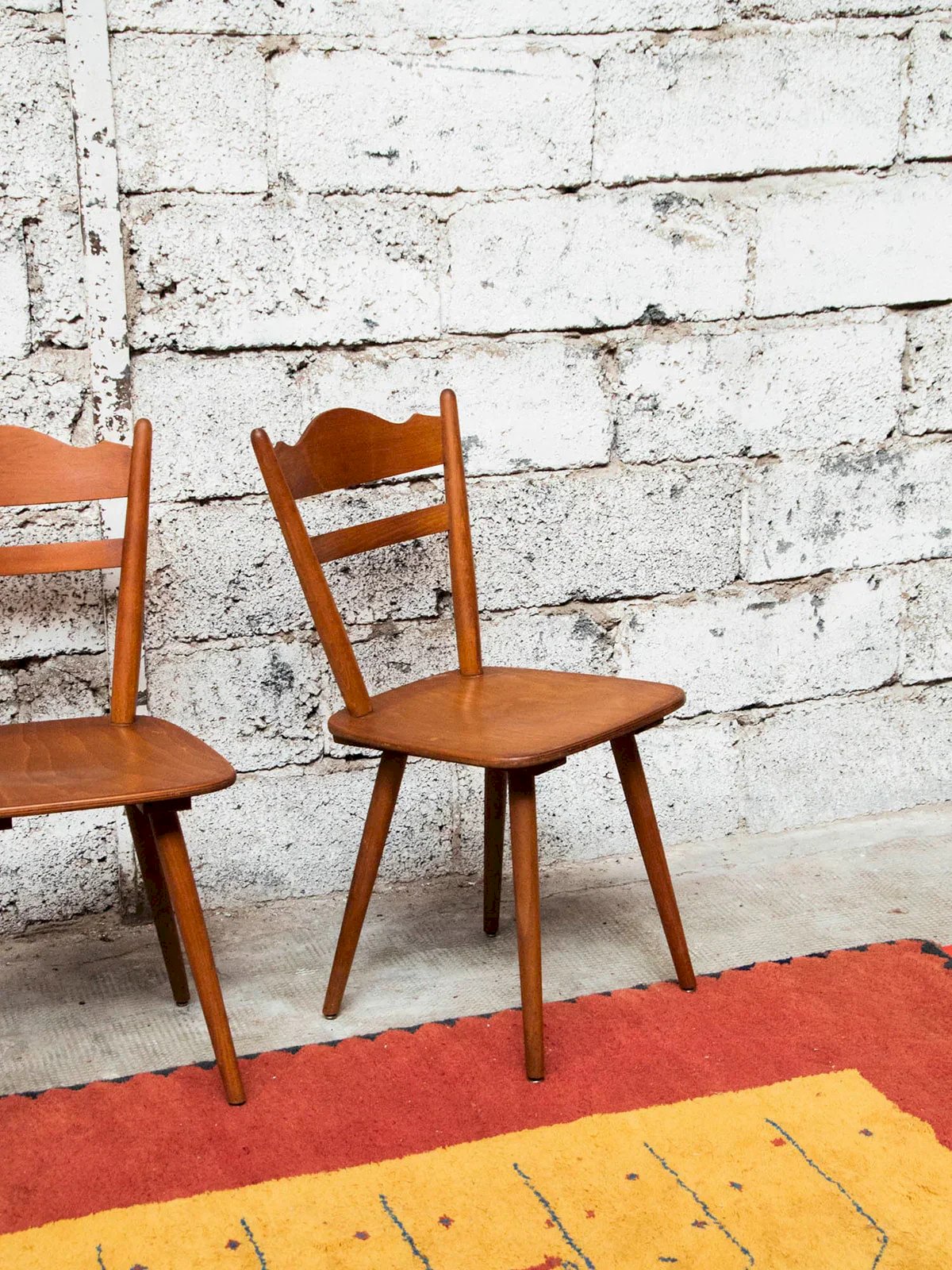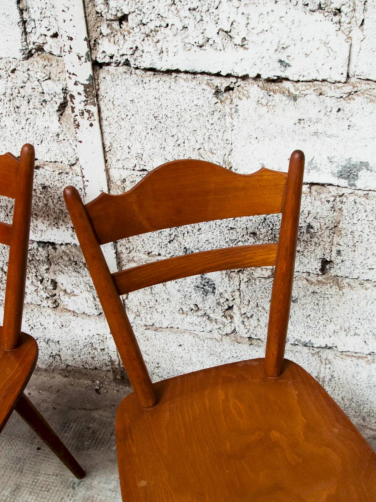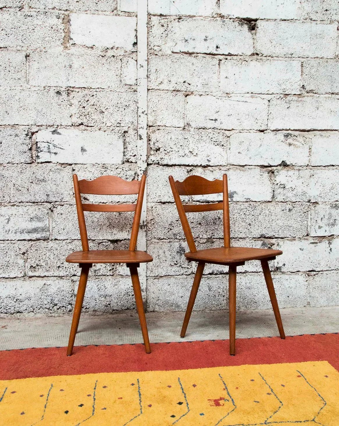 Discover our pair of dark wood chairs, featuring a sleek and contemporary design. With their tapered legs and delicate curves in the backrest, these chairs will add a distinctive touch to your interior. Each pair showcases unique imperfections, highlighting the artisanal character of the collection. They are perfect for adding a note of authenticity to your decor while providing comfortable seating. 2 pairs are available, showing varying signs of wear depending on the pair. Length: 41 cm Width: 42 cm Height: 84 cm Seat Height: 45 cm Condition: Used: Item has been used. Item shows some superficial wear marks... Used: Item has been used. Item shows some superficial wear marks, fully operational and working properly. It may be a display model or an item returned to the store after a short period of use. possible imperfections. Color: Multicolor Height: Wood Width: Chairs Brand: Debongout Type: Vintage product Material: Wood Style: Contemporary