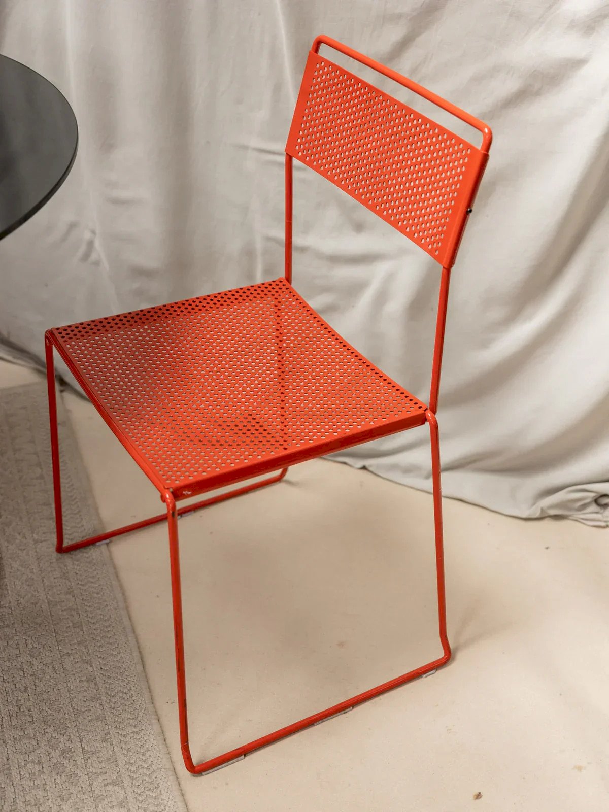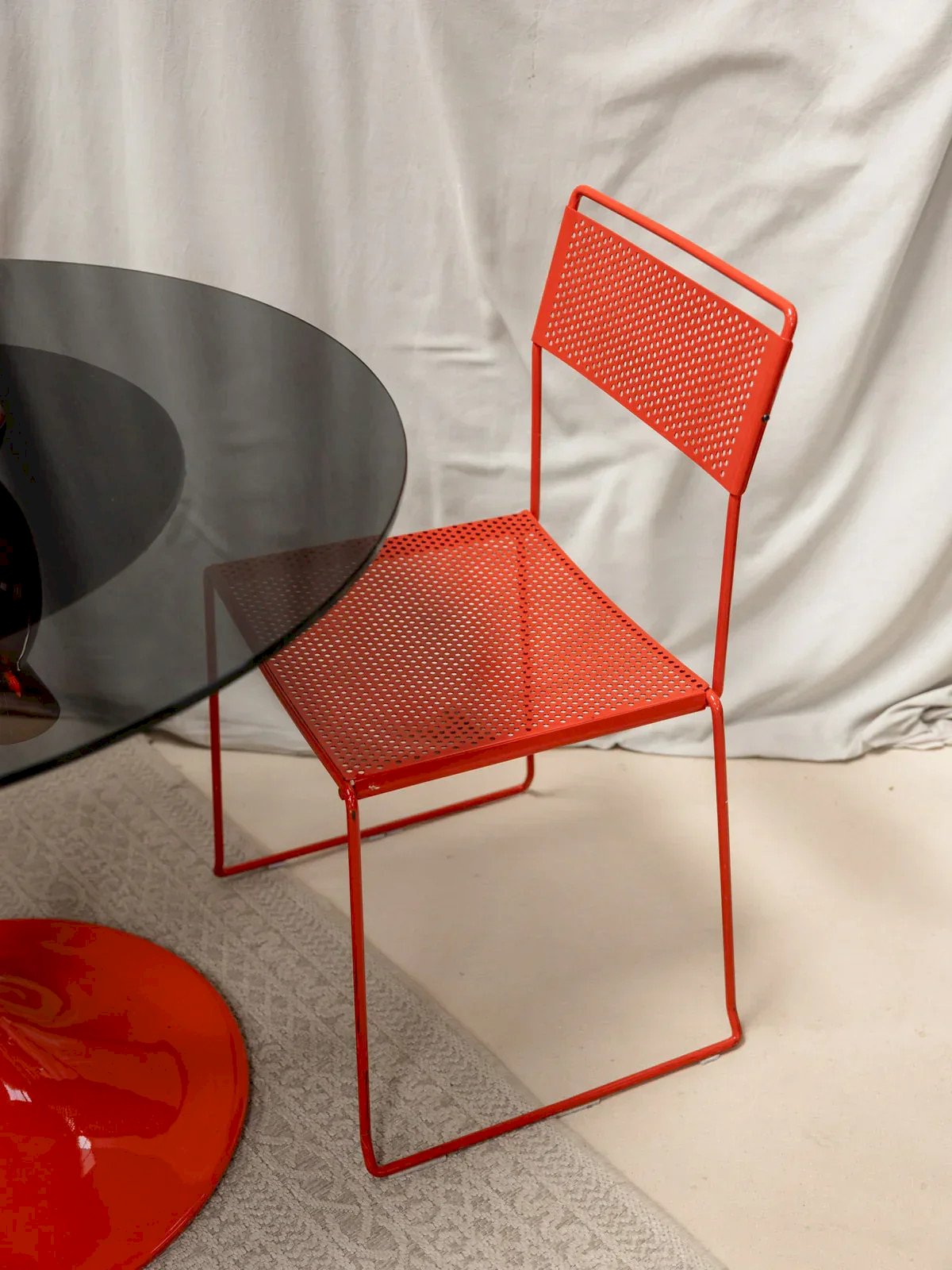This red metal chair adds a nice touch of modernity to your interior. Its perforated seat and matching backrest give it a characterful look, while its thin legs provide a beautiful visual lightness. It can be imagined both around a dining table and in a coffee corner, for seating that is as practical as it is stylish. Length: 45 cm Height: 84 cm Seat height: 47 cm Depth: 42 cm Seat depth: 40 cm Condition: Used: Item has been used. Item shows some superficial wear marks, fully operational and functioning correctly. It may be a demonstration model or an item returned to the store after a short period of use. Possible imperfections. Color: Multicolored Height: Metal Width: Chairs Brand: Debongout Type: Vintage product Material: Metal Style: Contemporary