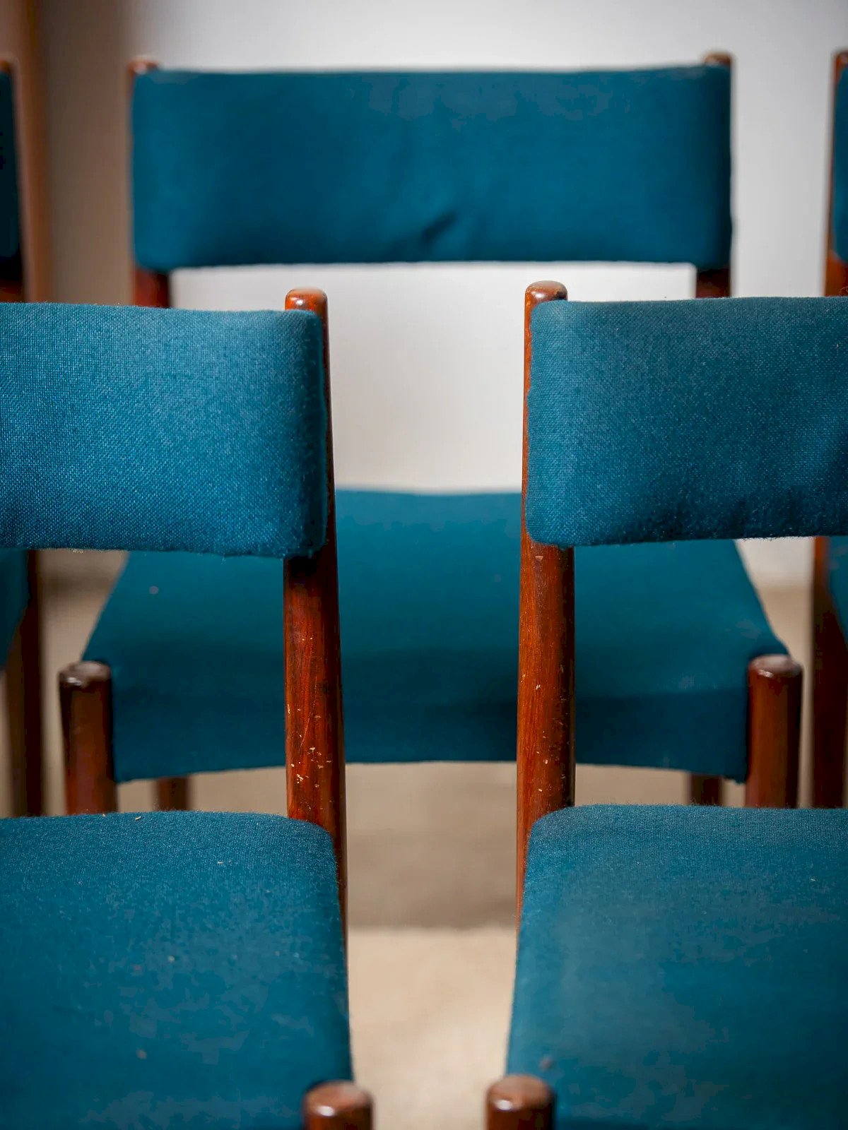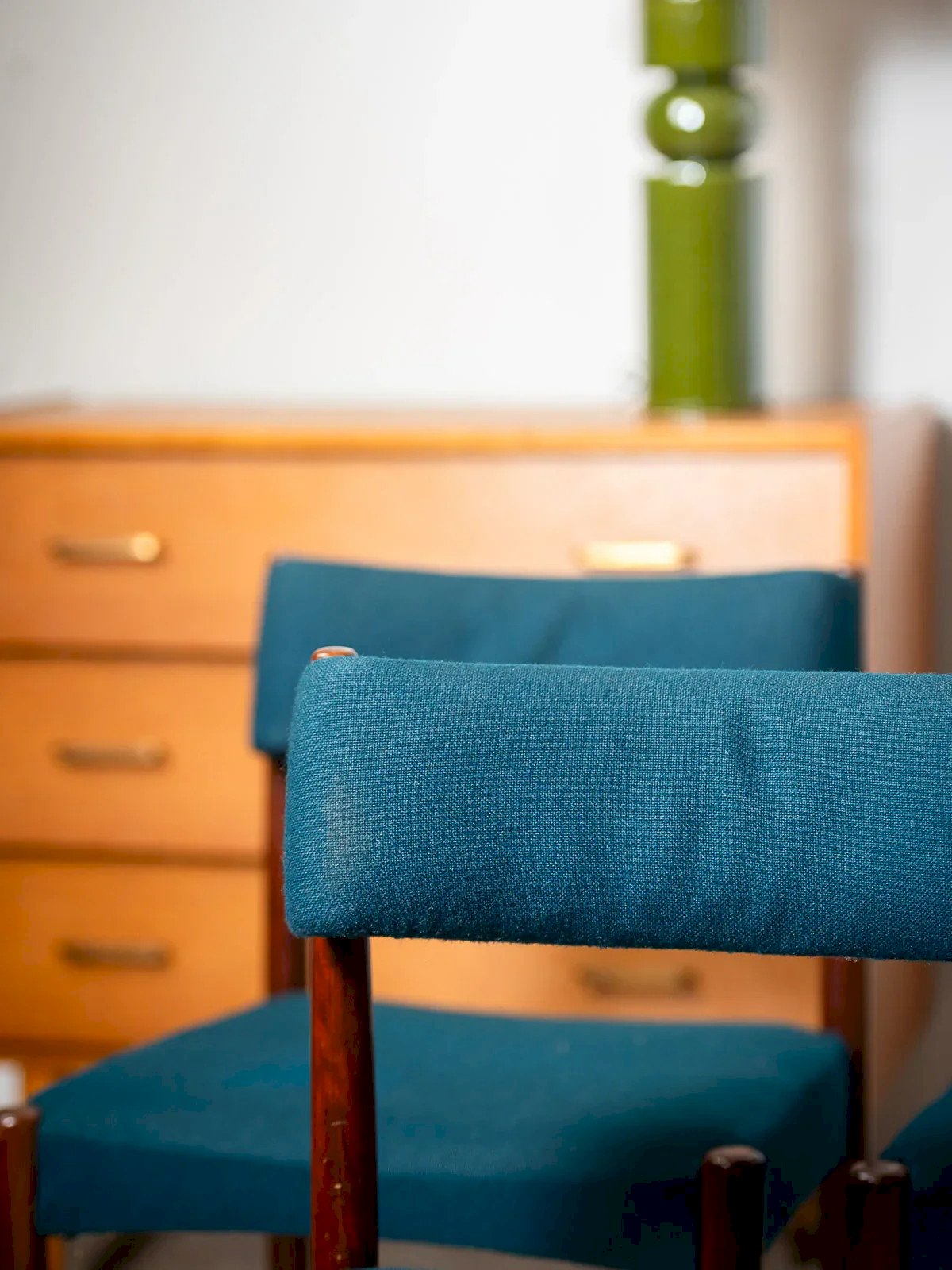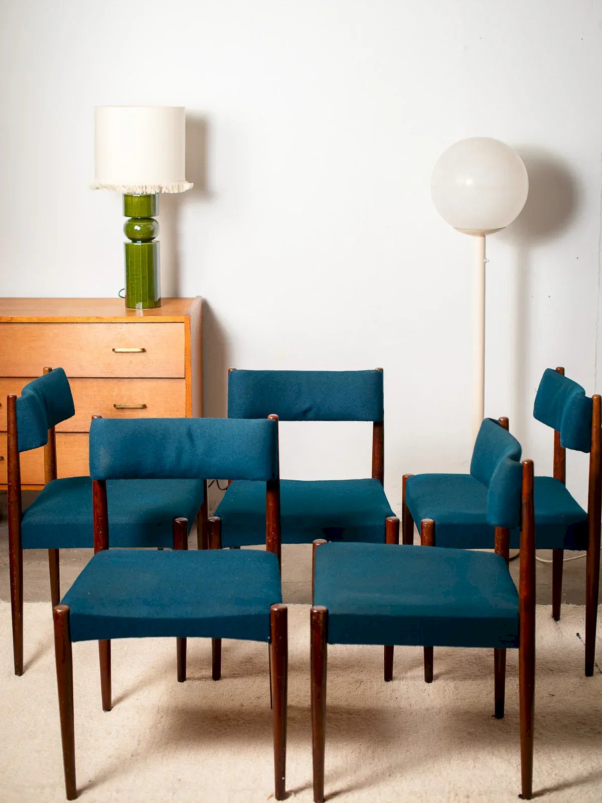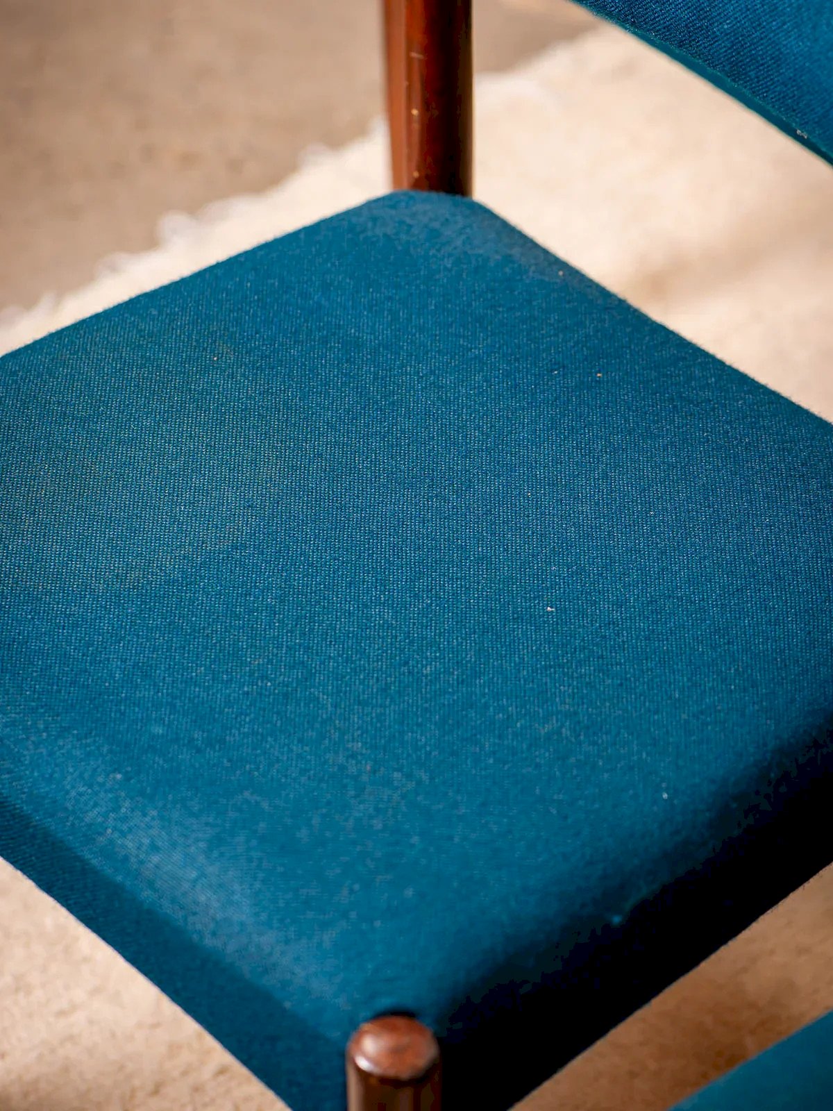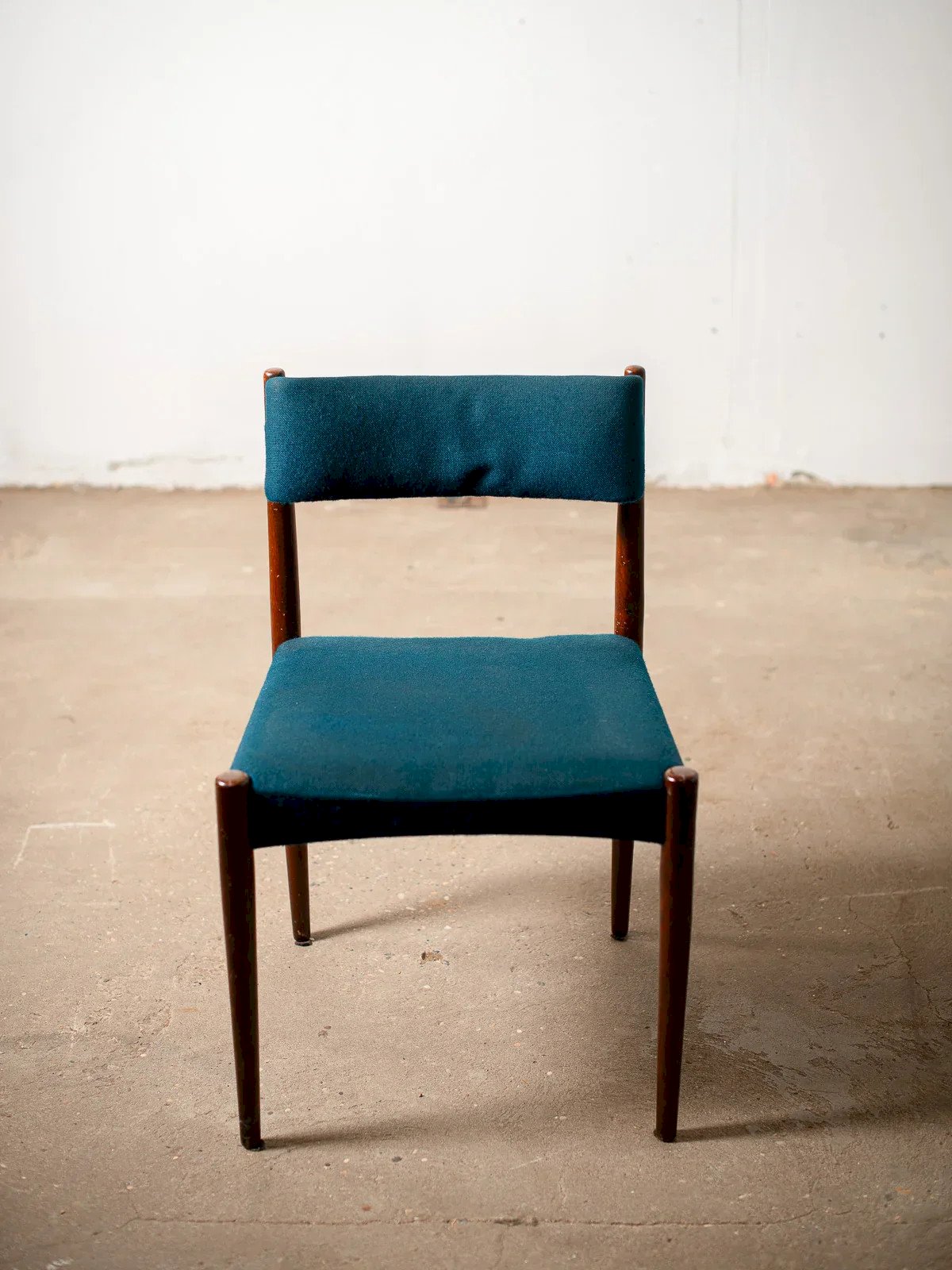 Discover this Scandinavian chair made of rosewood, which adds a retro and warm touch to your interior! With its vintage teal fabric seat, it stands out for its elegance and 60s style. Perfect for your dining room, it combines comfort and aesthetics. Note that it shows some signs of its past, visible in the photos, adding character to this unique piece. Sold individually, available in 5 units. Width: 49 cm Height: 76 cm Seat height: 45 cm Depth: 48 cm Condition: Second-hand: Item that has been used. Item showing some signs of superficial wear... Second-hand: Item that has been used. Item showing some signs of superficial wear, fully operational and functioning correctly. It may be a demonstration model or an item returned to the store after a short period of use. The possible imperfections. Color: Multicolor Height: Rosewood, Wood, Fabric Width: Chairs Brand: Debongout Type: Vintage product Material: Rosewood, Wood, Fabric Style: Contemporary