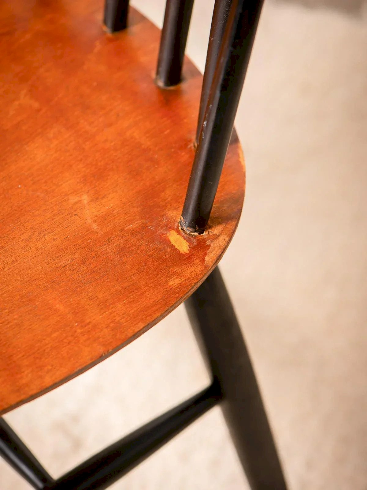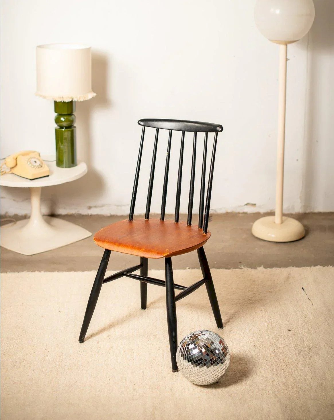 Discover this Tapiovaara chair with a Scandinavian style that adds a vintage touch to your interior! With wooden legs and a black slatted backrest, it offers a nice visual contrast. Perfect for the dining room or office, this chair combines comfort and elegance. Please note that it has some marks from its past, visible in the photos. Unfortunately, this product is not available in stores. Width: 42.5 cm Height: 86 cm Seat height: 44 cm Depth: 41 cm Condition: Used: Item that has been used. Item showing some superficial signs of wear... Used: Item that has been used. Item showing some superficial signs of wear, fully operational and functioning correctly. It may be a display model or an item returned to the store after a short period of use. Any potential imperfections. Color: Multicolor Height: Wood Width: Chairs Brand: Debongout Type: Vintage product Material: Wood Style: Contemporary