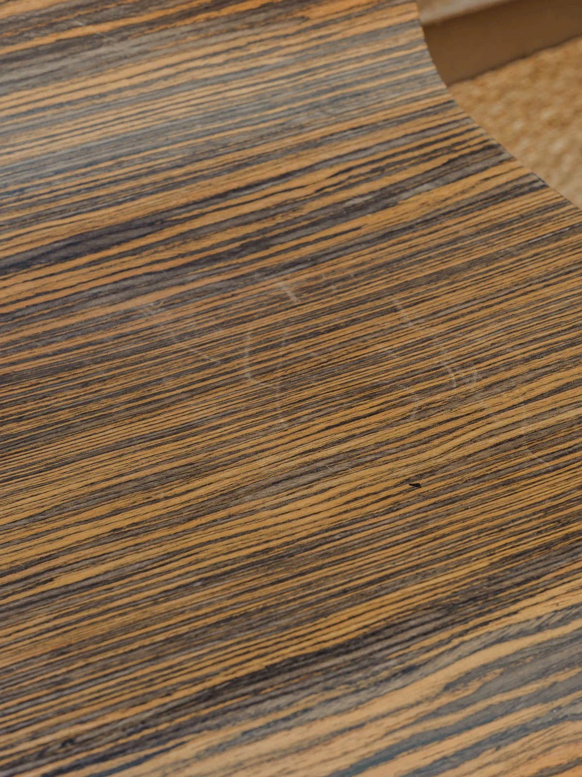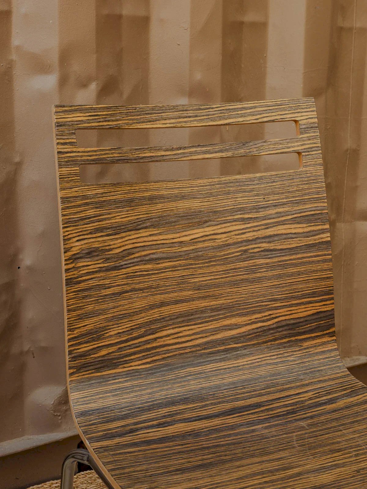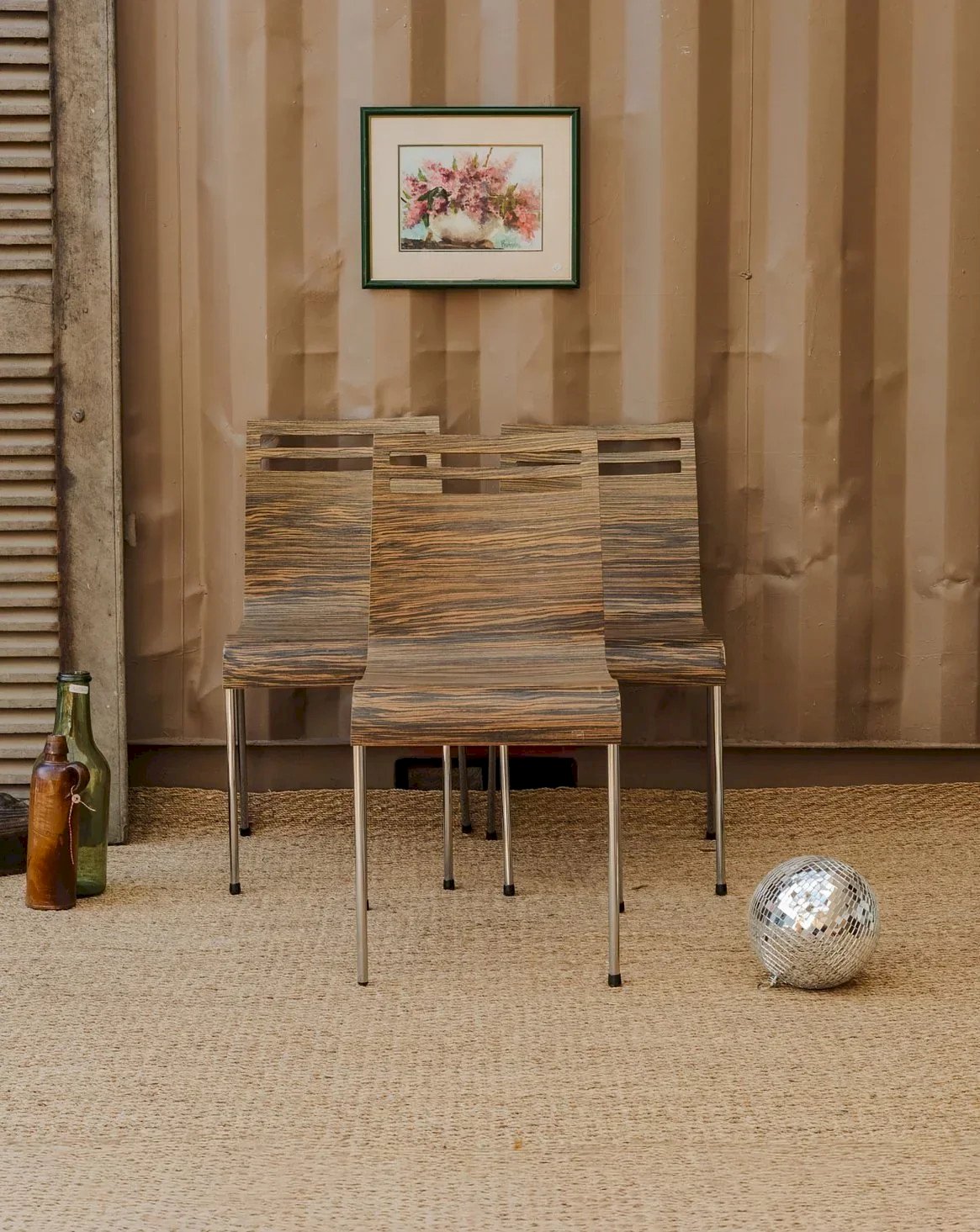 Adopt this set of three vintage-style zebra wood chairs, where the graphic grain of the wood adds a warm and refined visual signature to your dining room, kitchen, or office nook. Their seats provide daily comfort and easily fit with a family table or a small bistro space, while the natural patina gives them a welcoming appearance. Some signs of use are present. Height: 83 cm Seat height: 37 cm Seat depth: 38 cm Seat width: 39.5 cm Condition: Used: Item has been used. Item shows some superficial wear marks, ...Used: Item has been used. Item shows some superficial wear marks, fully operational and functioning correctly. It may be a demonstration model or an item returned to the store after a short period of use. the possible imperfections. Color: Multicolor Height: Formica, Metal Width: Chairs Brand: Debongout Type: Vintage Product Material: Formica, Metal Style: Contemporary