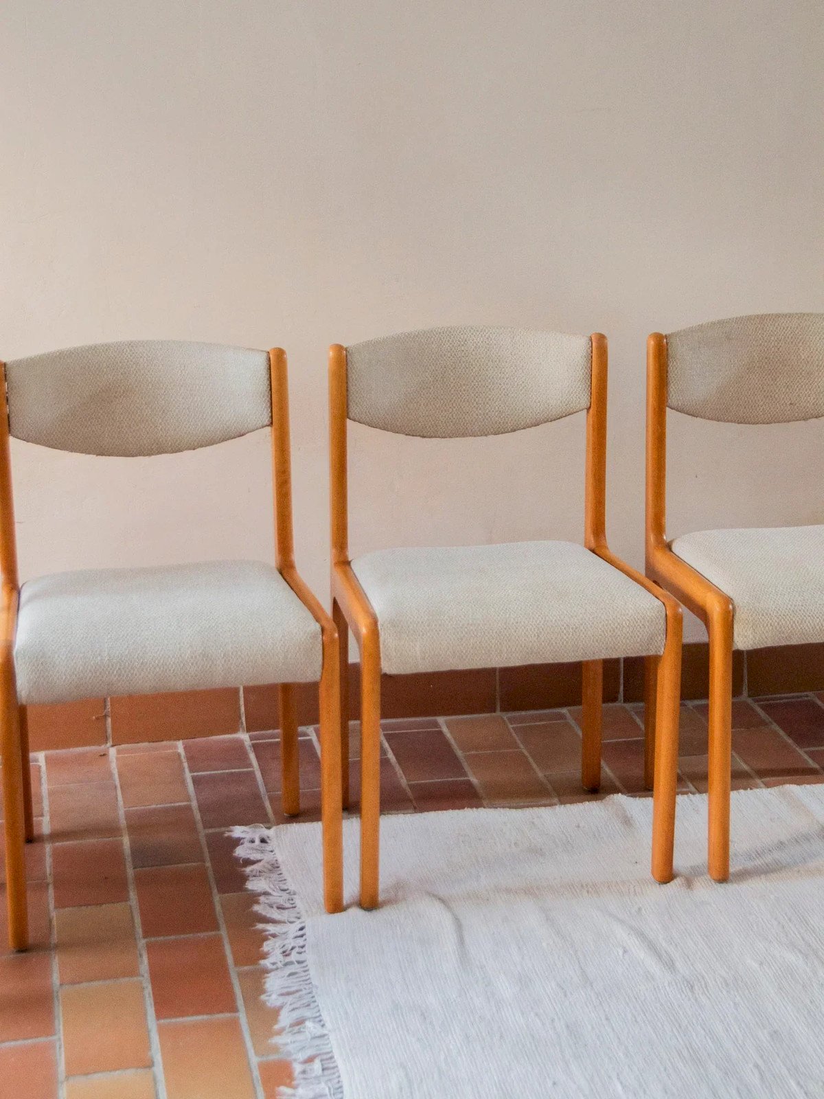Bring an authentic touch to your interior with this set of 4 vintage Scandinavian chairs in light beech. Their minimalist design, combined with a beige fabric seat, creates a perfect balance between comfort and elegance. Ideal for enhancing a dining room or kitchen, these chairs invite conviviality while adding a warm note to your decor. Although there are signs of wear on the fabric, they remain in very good overall condition and ready to beautify your space. Width: 49 cm Height: 81 cm Seat height: 46 cm Depth: 46 cm Condition: Used: Item that has been used. Item showing some superficial signs of wear, fully operational and functioning correctly. It may be a display model or an item returned to the store after a short period of use. Any imperfections may exist. Color: Multicolor Height: Beech, Fabric, Wood Width: Chairs Brand: Debongout Type: Vintage product Material: Beech, Fabric, Wood Style: Contemporary