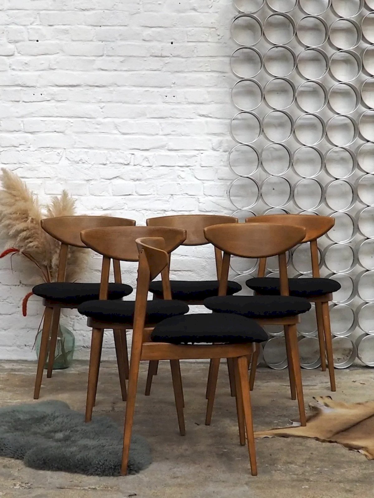 Adopt this set of 6 Fontania Baumann wooden chairs dressed in ribbed black velvet; the seats and backs have been restored to provide perfect comfort. Their wooden structure, with balanced proportions, fits well in a friendly dining room, an elegant office, or a reading nook, bringing a warm and understated presence. The ribbed velvet adds a refined texture and a subtle contrast that enhances both contemporary and retro decor. Wood is slightly lighter than in the photo of the lot. Length: 44 cm Width: 48 cm Height: 76 cm Seat height: 48 cm Seat depth: 41 cm Condition: Used: Item that has been used. Item showing some superficial signs of wear, fully operational and functioning correctly. It may be a demonstration model or an item returned to the store after a short period of use, with possible imperfections. Color: Multicolor Height: Contemporary Width: Wood, Velvet Length: Chairs Brand: Debongout Type: Thrifted product Material: Wood, Velvet Style: Contemporary Assembly required: No Assembly level: Fully assembled