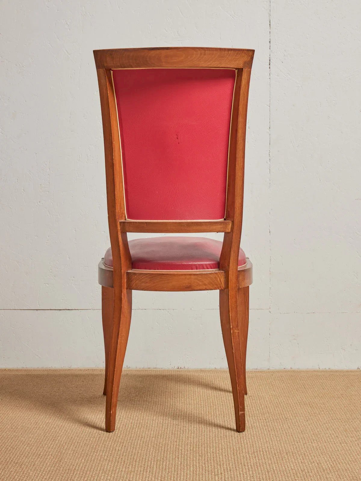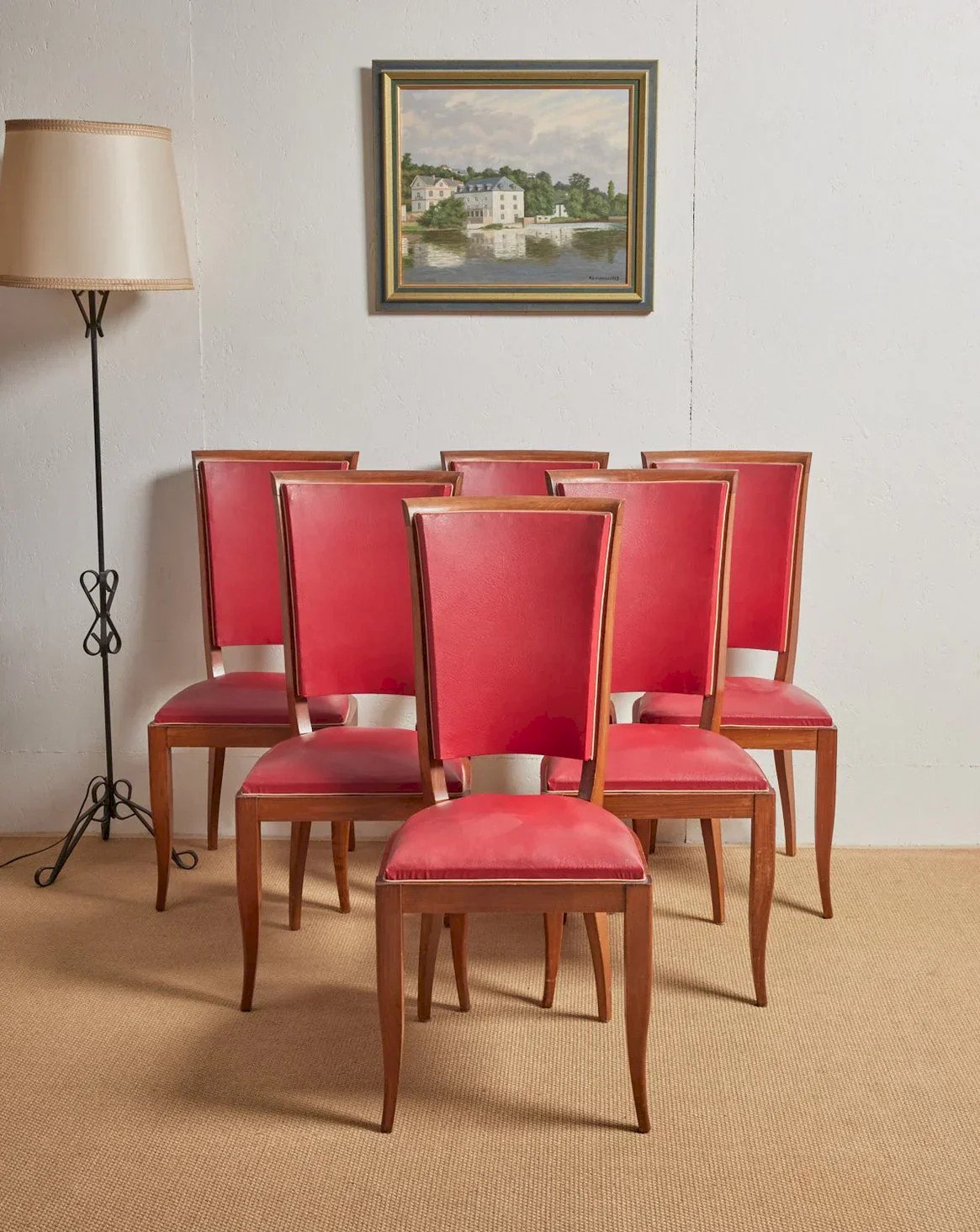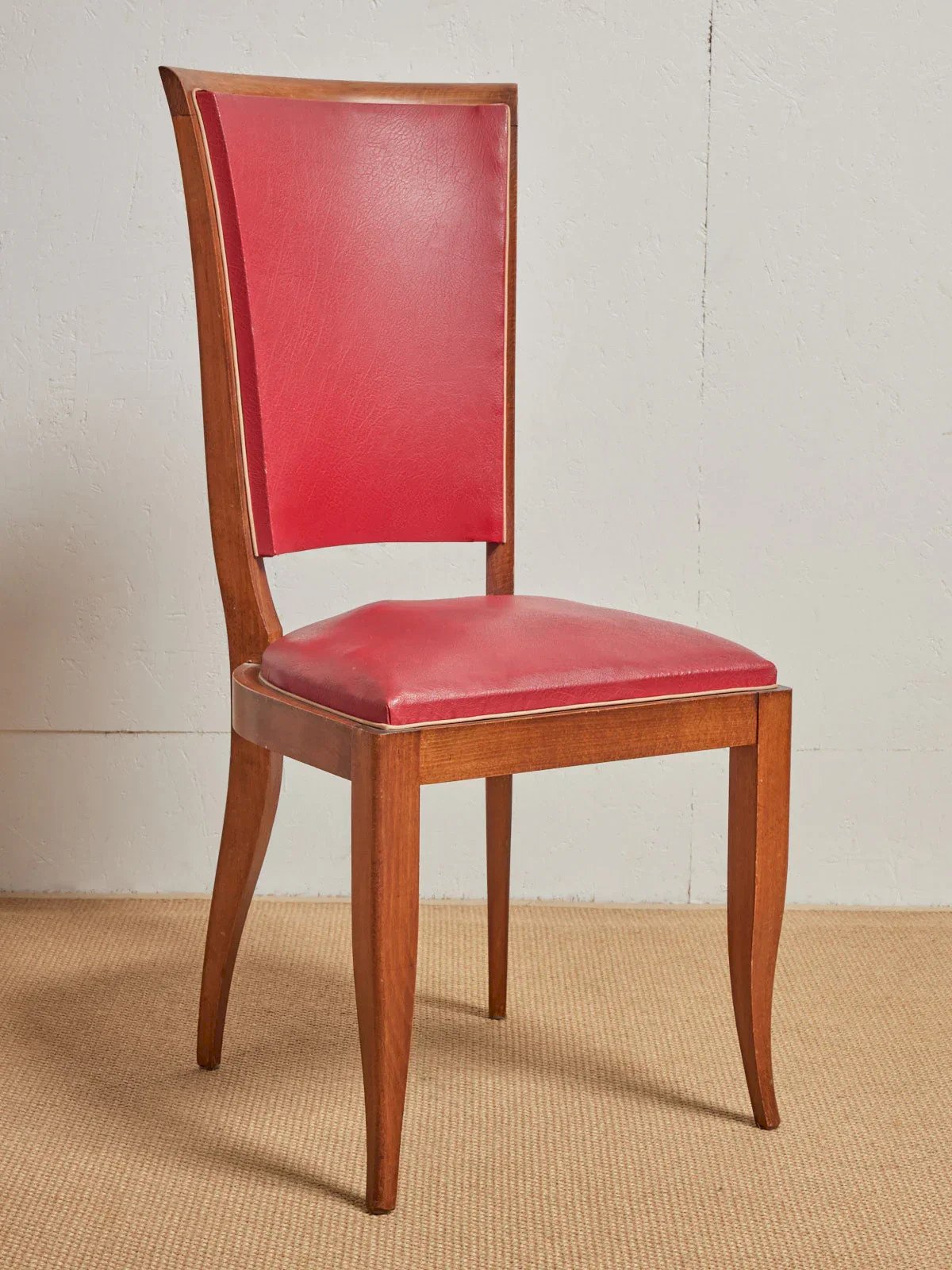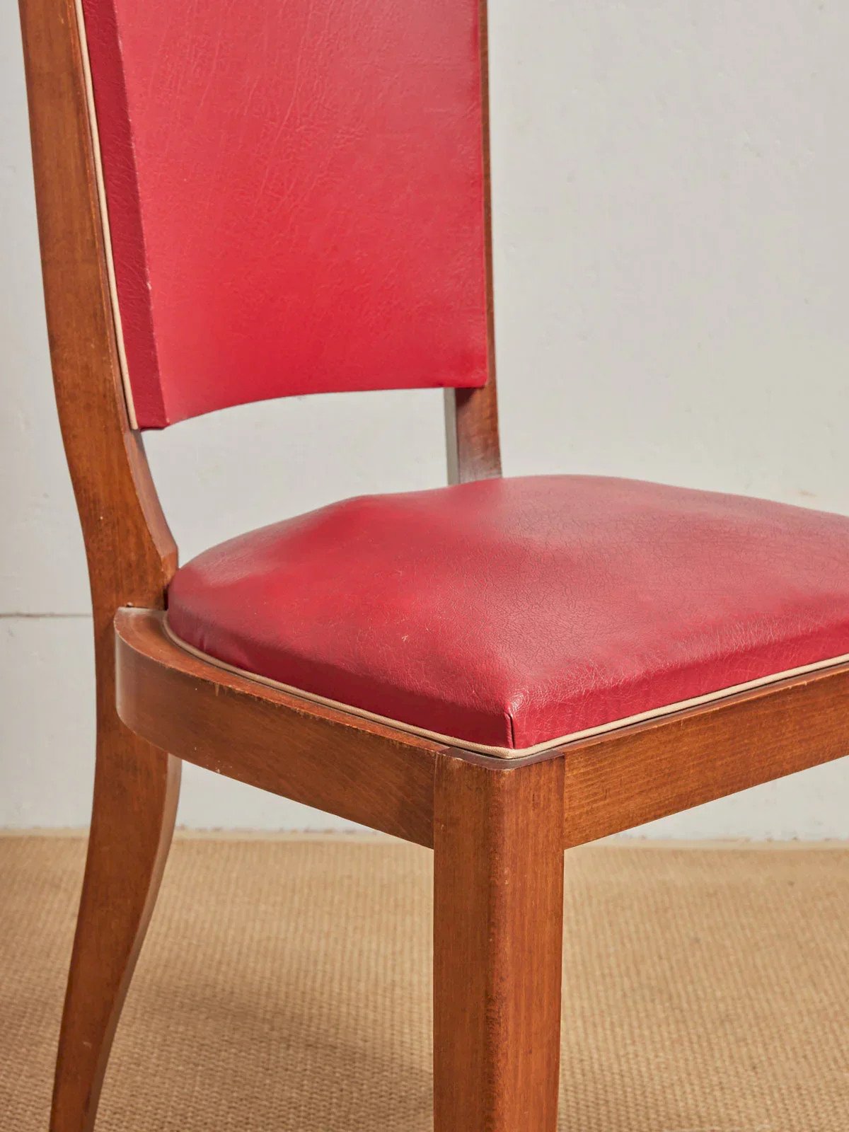 Invite a retro and colorful touch with this set of six red faux leather chairs on a wooden base, where the warm hue converses with the nobility of the wood. The faux leather seat offers easy maintenance while the wooden structure ensures stability and comfort for daily meals or evenings with friends. Compact and well-proportioned, they fit perfectly around a dining table as well as in a cozy kitchen, bringing a welcoming and graphic ambiance. Length: 45 cm Width: 45 cm Height: 88 cm Seat height: 46 cm Seat depth: 45 cm Seat width: 45 cm Condition: Used: Item that has been used. Item showing some signs of superficial wear... Used: Item that has been used. Item showing some signs of superficial wear, fully operational and working correctly. It may be a demonstration model or an item returned to the store after a short period of use, with possible imperfections. Color: Multicolor Height: Faux leather, Wood Width: Chairs Brand: Debongout Type: Vintage product Material: Faux leather, Wood Style: Contemporary