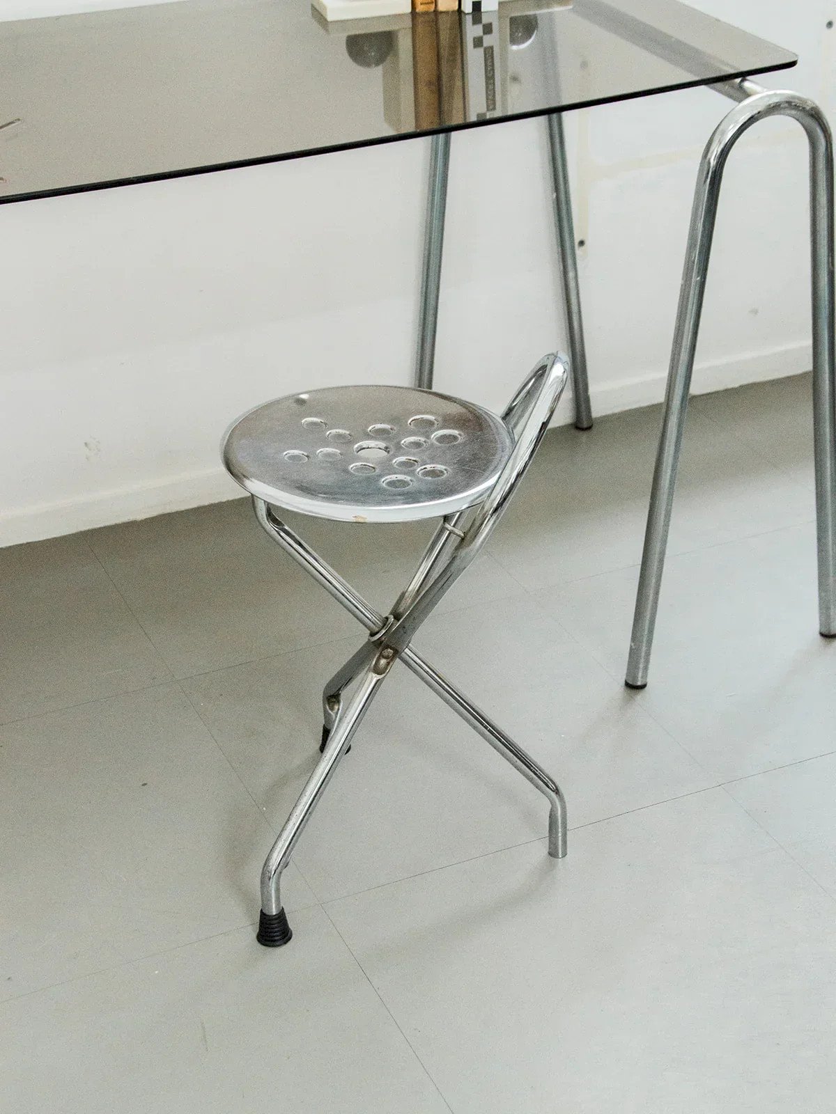 Discover this Tubecon folding chair of Greek origin, featuring a design that is both understated and unique. Its tubular metal structure provides strength and lightness. The crossed tripod legs bring an original touch while ensuring good stability. Easy to fold, it can be stored in the blink of an eye. Perfect as an extra seat or for a bold industrial ambiance. Sold individually, two quantities are available! Length: 31 cm Height: 59 cm Height (folded chair): 77 cm Depth: 35 cm Condition: Used: Item has been used. Item shows some signs of superficial wear... Used: Item has been used. Item shows some signs of superficial wear, fully operational and functioning correctly. It may be a demonstration model or an item returned to the store after a short period of use. Any potential imperfections. Color: Multicolor Height: Contemporary Width: Metal Length: Chairs Brand: Debongout Type: Thrifted product Material: Metal Style: Contemporary Assembly required: No Assembly level: Fully assembled.