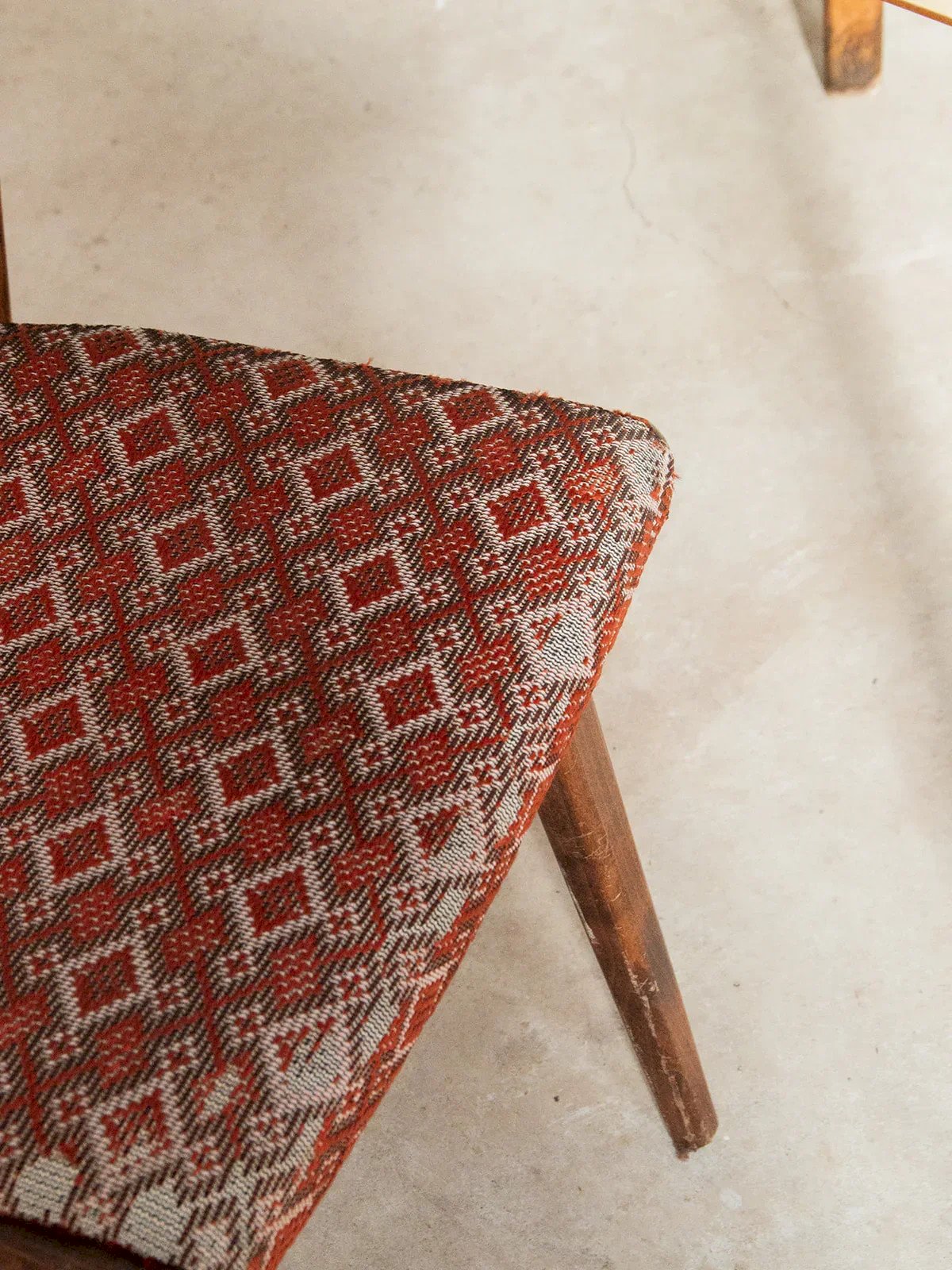 Treat yourself to this wooden chair, an elegant and modern piece for your interior. Its wooden backrest provides ergonomic support while the red-orange fabric seat adds a touch of warmth and conviviality to your decor. Ideal for family meals or relaxing moments, this chair combines comfort and style brilliantly. Add a splash of color to your space with this unique and welcoming model. The fabric is in used condition, as seen in the photos. Sold individually, 8 quantities are available. Web exclusive, the meeting will take place at your home! Length: 44 cm Width: 44 cm Height: 85 cm Seat height: 42 cm Condition: Used: Item has been used. Item shows some signs of superficial wear... Used: Item has been used. Item shows some signs of superficial wear, fully operational and functioning correctly. It may be a demonstration model or an item returned to the store after a short period of use. potential imperfections. Color: Multicolor Height: Wood, Fabric Width: Chairs Brand: Debongout Type: Vintage product Material: Wood, Fabric Style: Contemporary