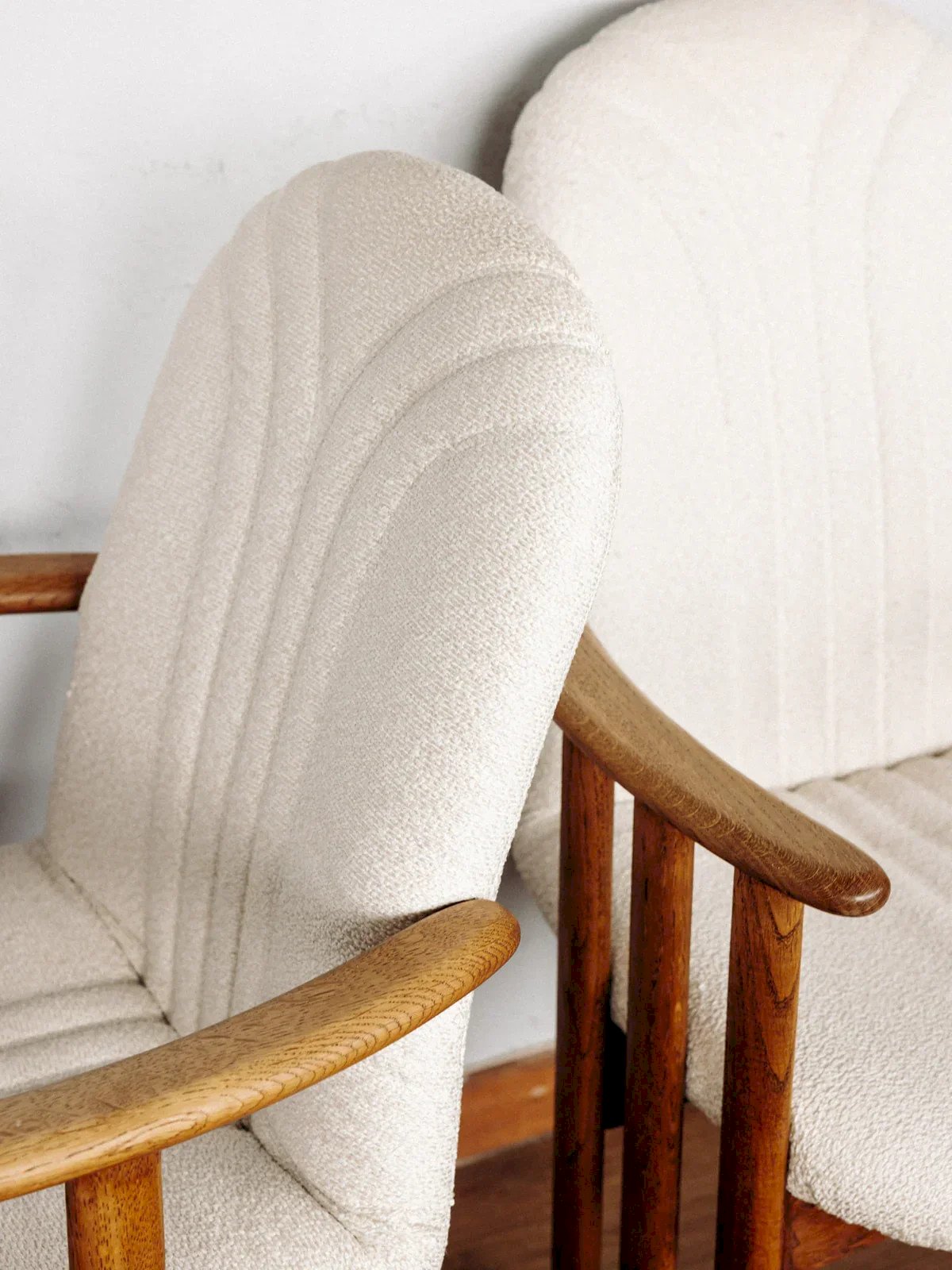 Alert nugget! These stunning 1960s oak wood chairs with white boucle fabric are a true homage to retro design. Their natural wood structure and boucle fabric seat offer both comfort and elegance. Perfect for adding a vintage and chic touch to your interior, they are ideal for those seeking the combination of style and comfort. Sold separately, 6 pieces available. Web exclusive, the meeting will take place at your home! Length: 61 cm Depth: 66 cm Height: 94 cm Seat height: 46 cm Seat depth: 47 cm Seat length: 53 cm Condition: Used: Item that has been used. Item showing some superficial wear marks, ...Used: Item that has been used. Item showing some superficial wear marks, fully operational and functioning properly. It may be a demonstration model or an item returned to the store after a short period of use. Possible imperfections. Color: Multicolor Height: Wood, Boucle Fabric Width: Chairs Brand: Debongout Type: Vintage product Material: Wood, Boucle Fabric Style: Contemporary
