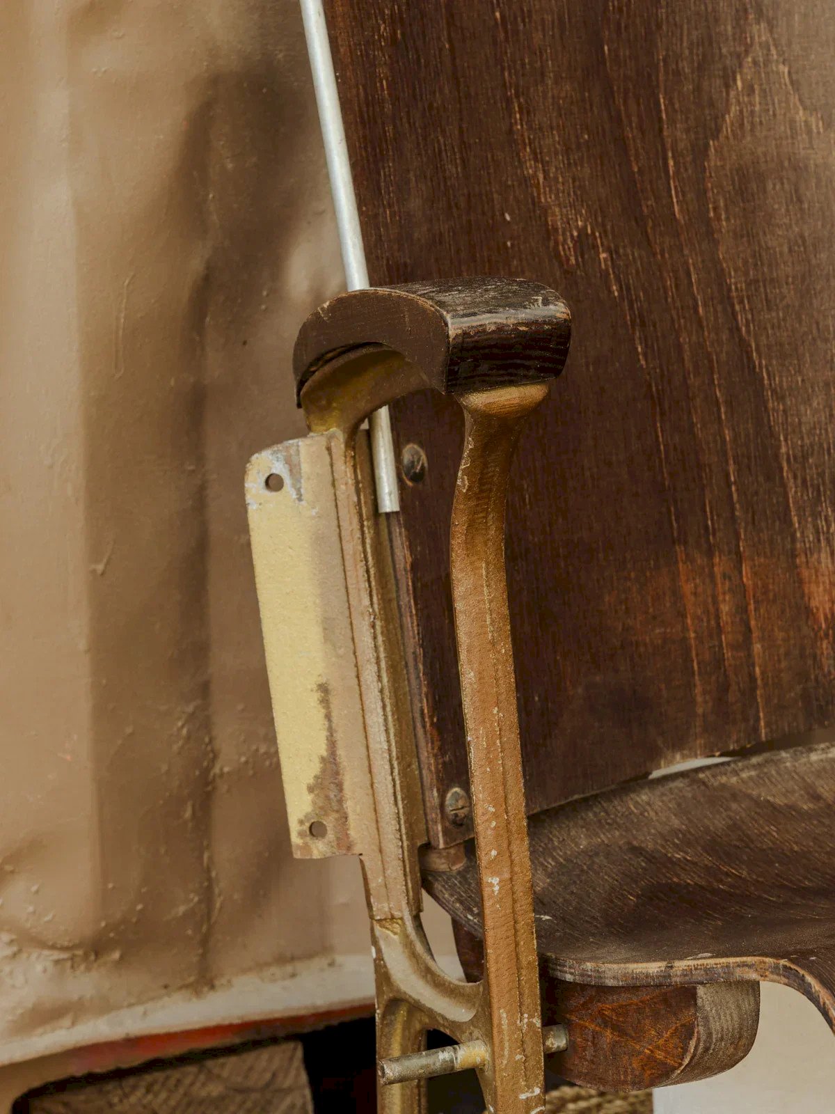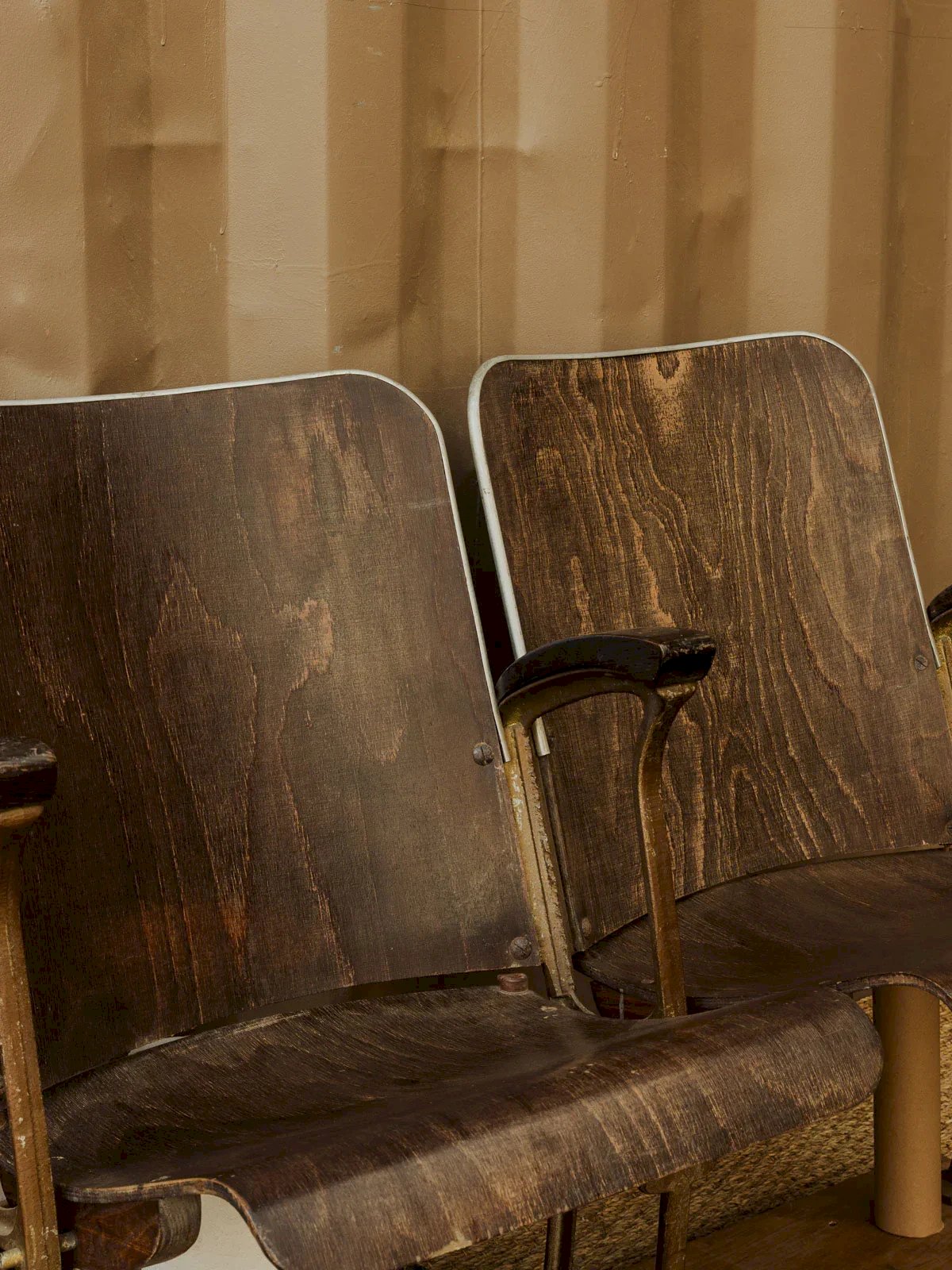 Invite these two original cinema folding seats, vintage dark wood, which bring an authentic vintage presence. Their compact size and practical seating allow them to fit easily into a hall, living room, or projection corner to create a modular and friendly space. Some signs of usage bear witness to their history. Length: 101 cm Width and seat width: 41 cm Height: 83 cm Condition: Used: Item that has been used. Item showing some superficial wear marks, fully operational and functioning correctly. It may be a demonstration model or an item returned to the store after a short period of use. Possible imperfections. Color: Multicolor Height: Wood Width: Chairs Brand: Debongout Type: Vintage product Material: Wood Style: Contemporary