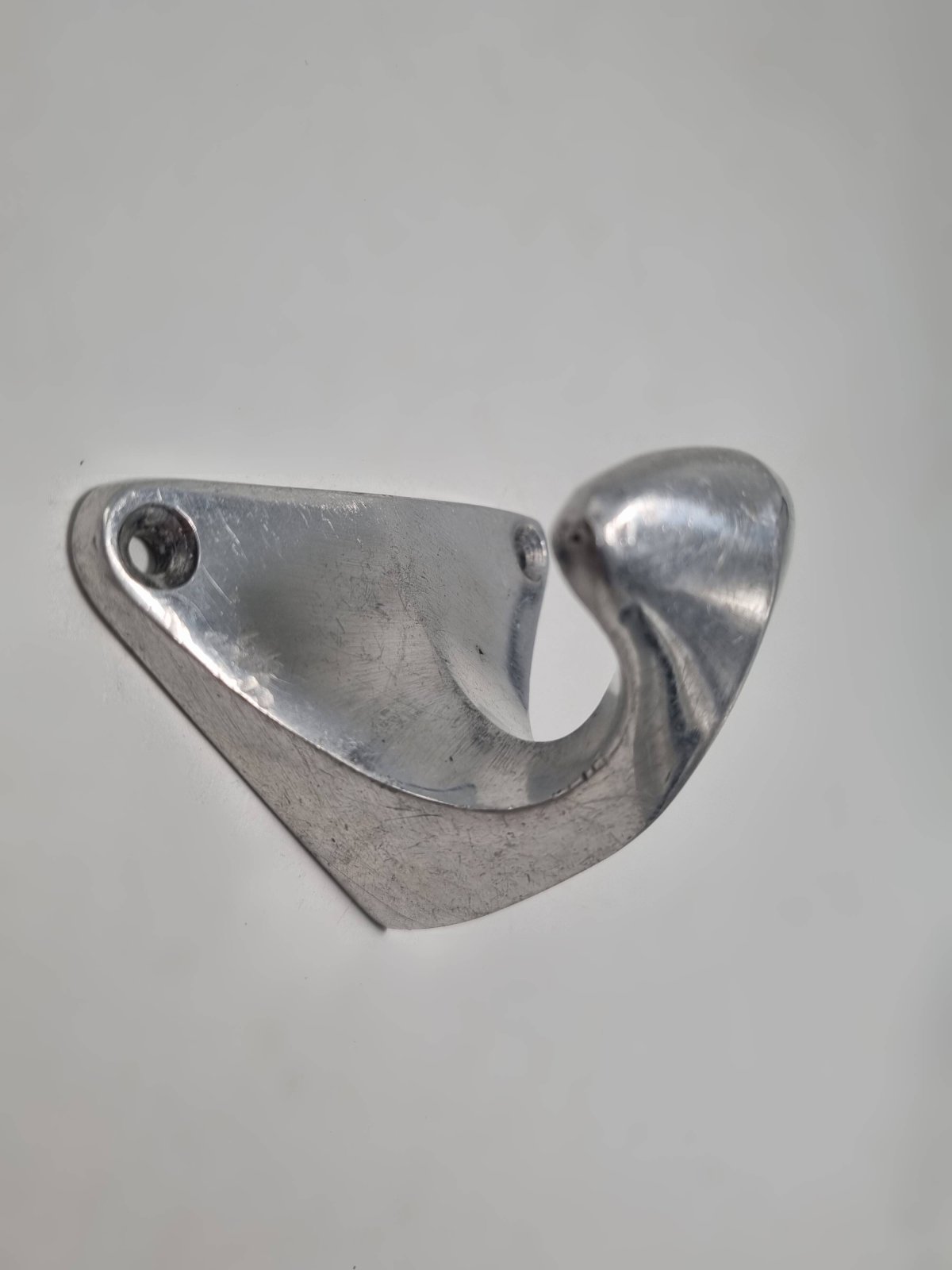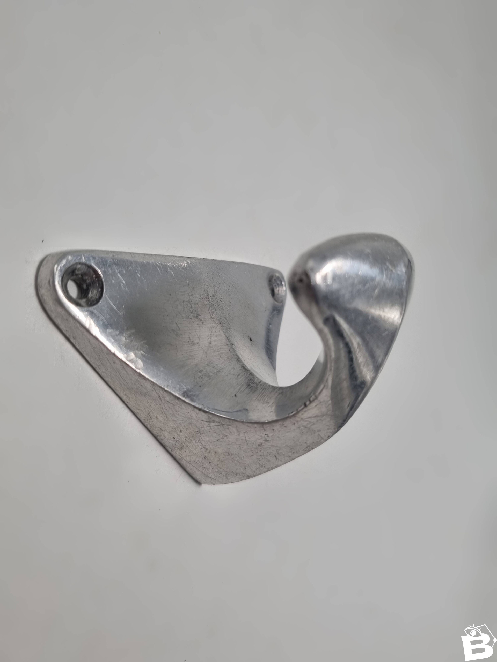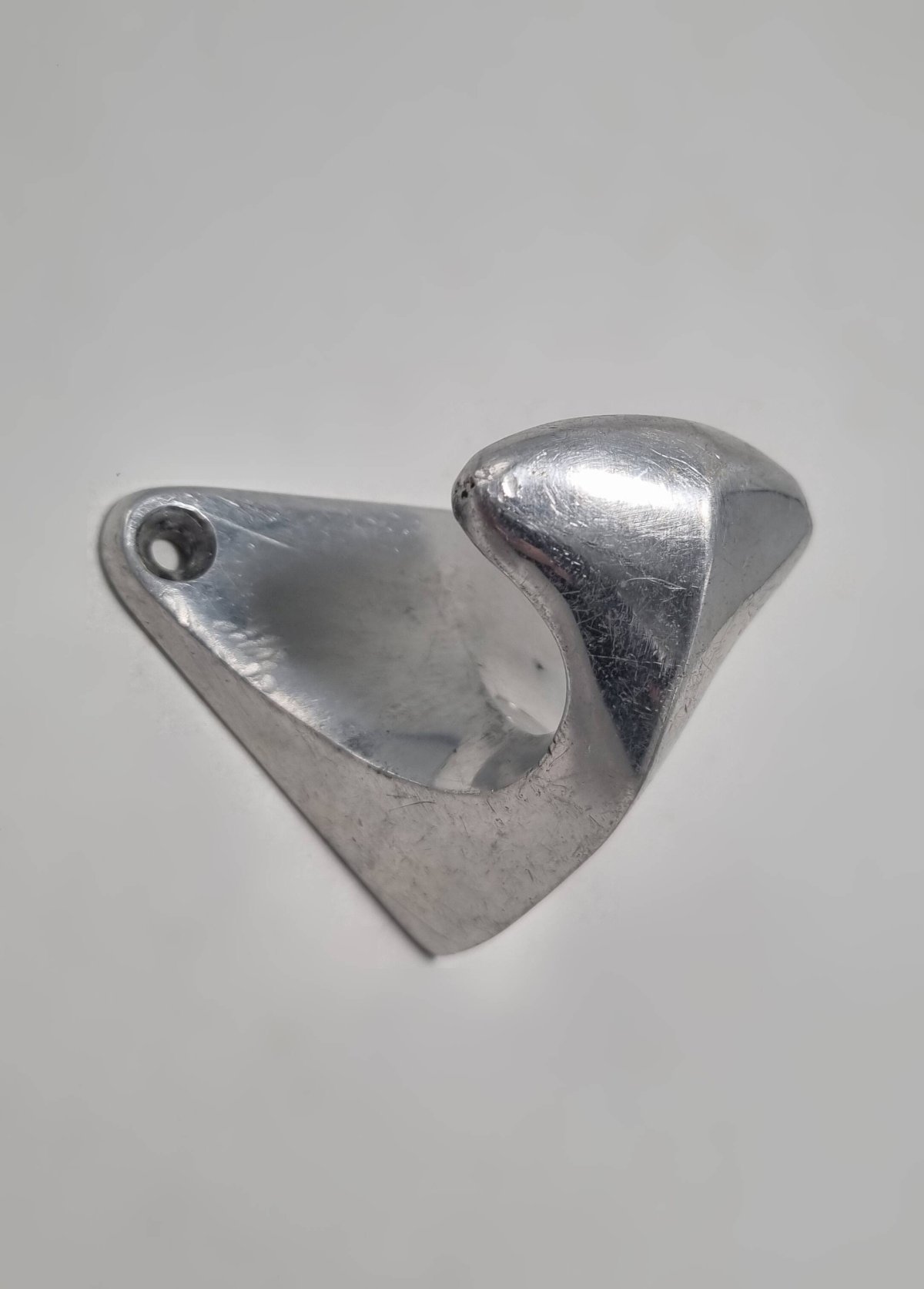Vintage aluminum coat hook, probably dating from the 1950s-1960s. Vintage piece showing scratches and signs of use, which attest to its authenticity. Dimensions: 8 x 5.5 x 5.5 cm Weight: 80 g L: 8 W: 5.5 H: 5.5