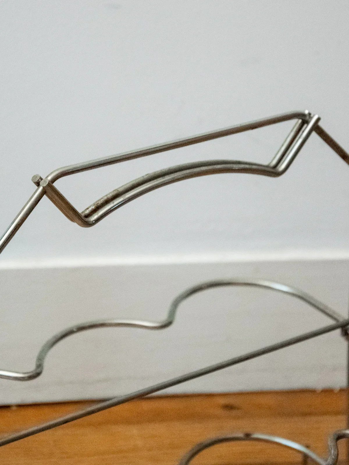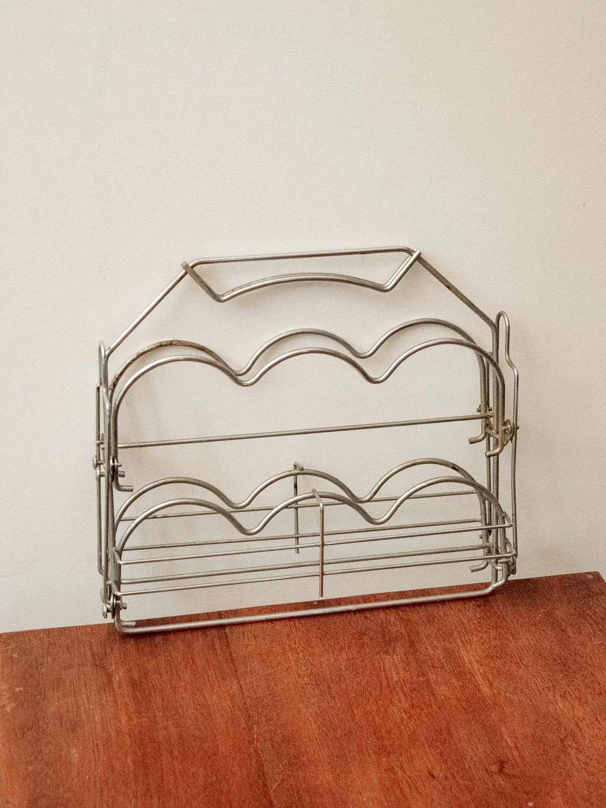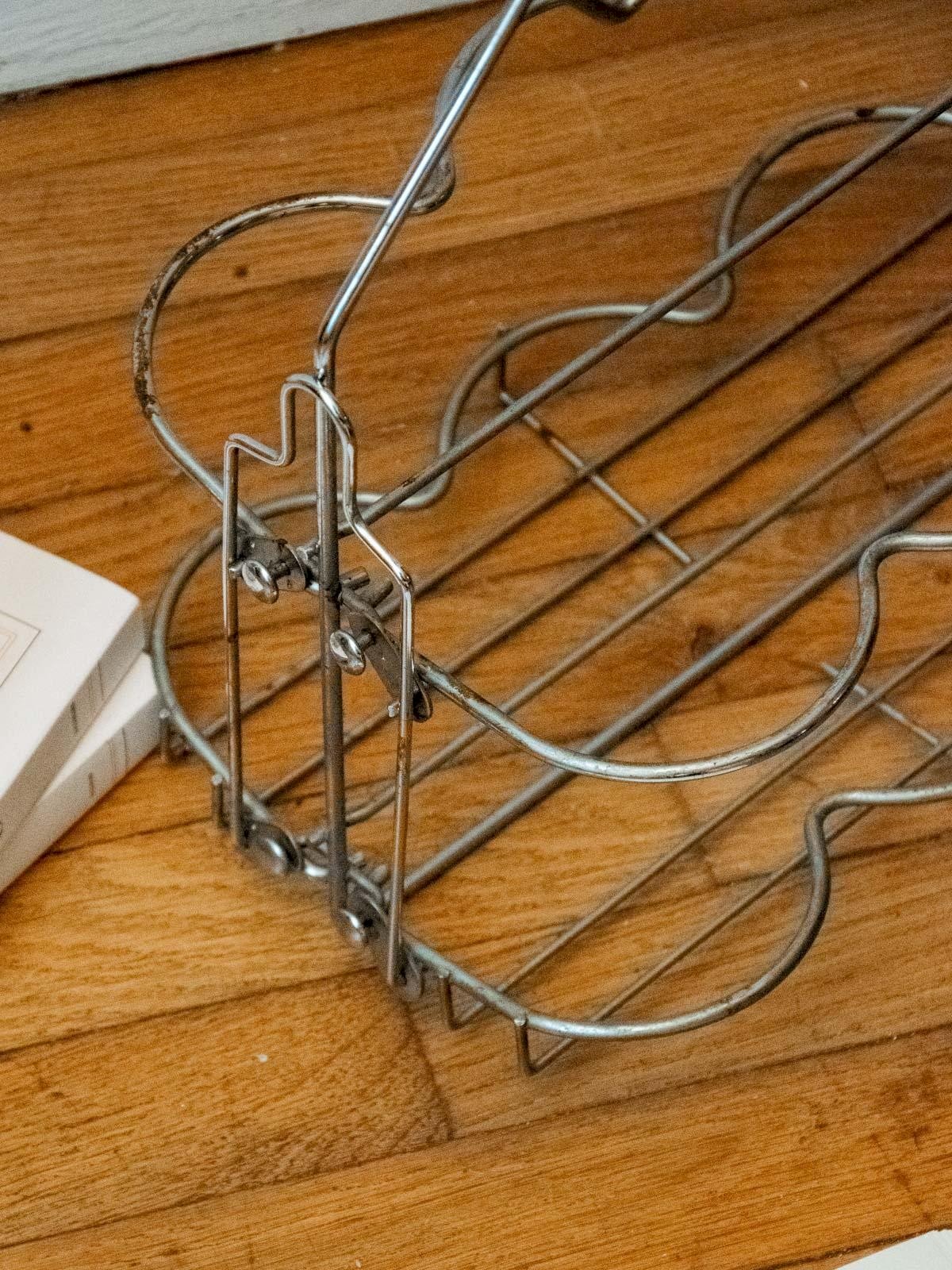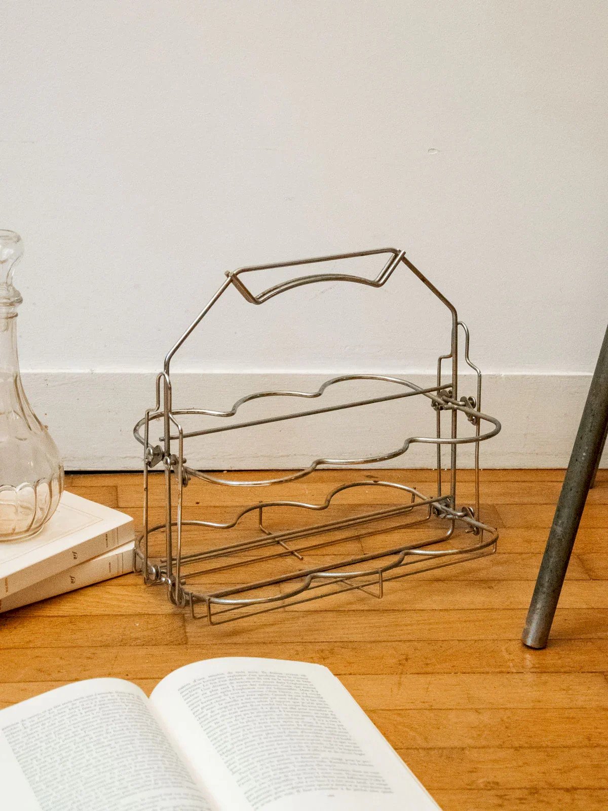 Bring a vintage touch with this foldable metal bottle holder that features industrial charm and airy lines. Designed to securely hold a few bottles, its compact size folds and stores easily, making it ideal for a picnic or for being carried to social gatherings. Its metal finish gives it a sleek and authentic look, perfect for a countertop, a small table, or in a bar corner for a warm and elegant display. Length: 33 cm Width: 21.5 cm Height: 30 cm Condition: Used: Item has been used. Item shows some signs of superficial wear... Used: Item has been used. Item shows some signs of superficial wear, fully operational and functioning correctly. It may be a demonstration model or an item returned to the store after a short period of use. Possible imperfections. Brand: Debongout Type: Vintage product Material: Metal Style: Country