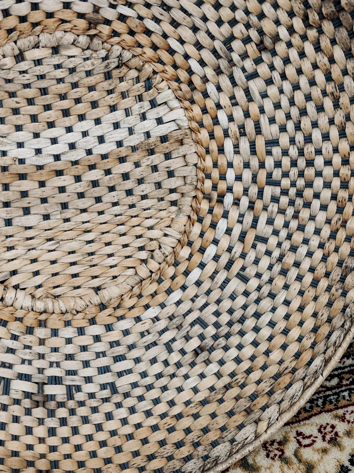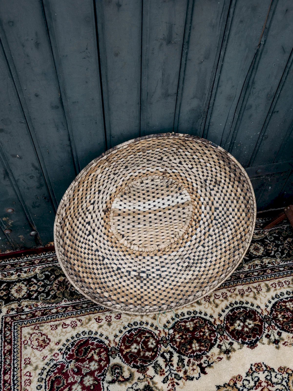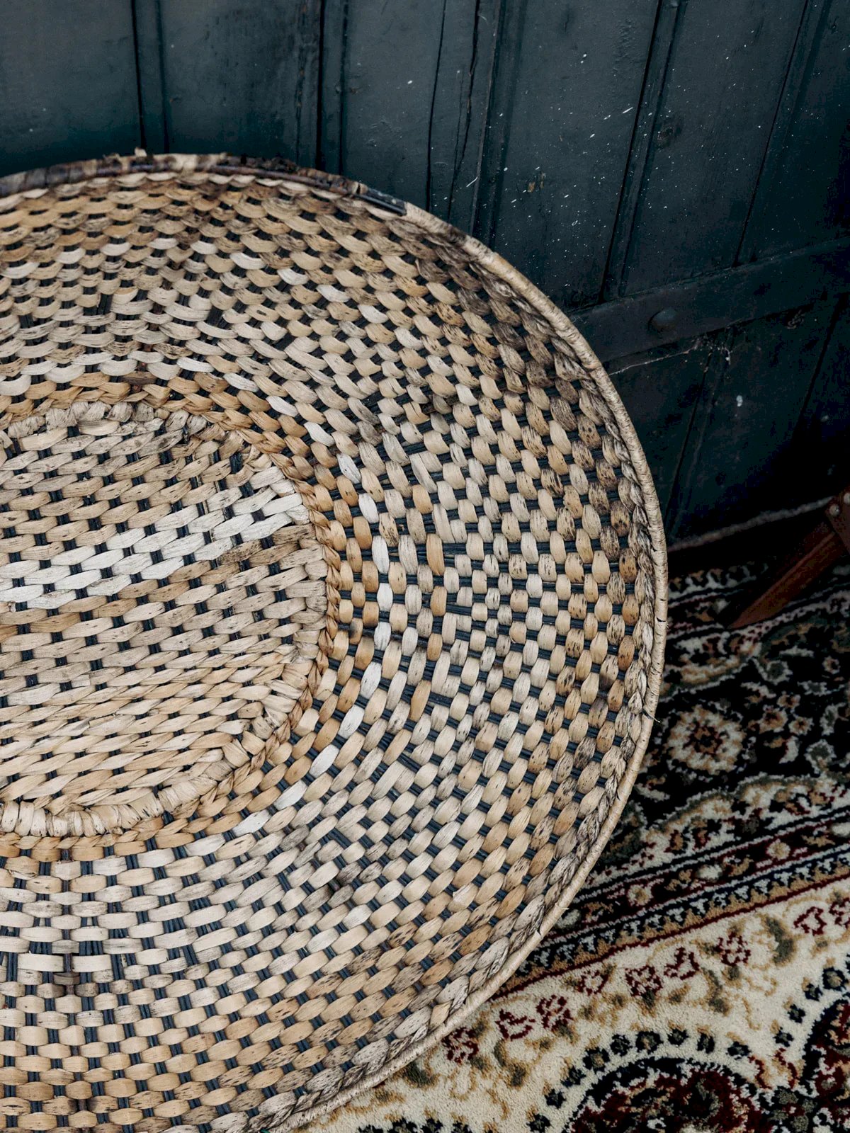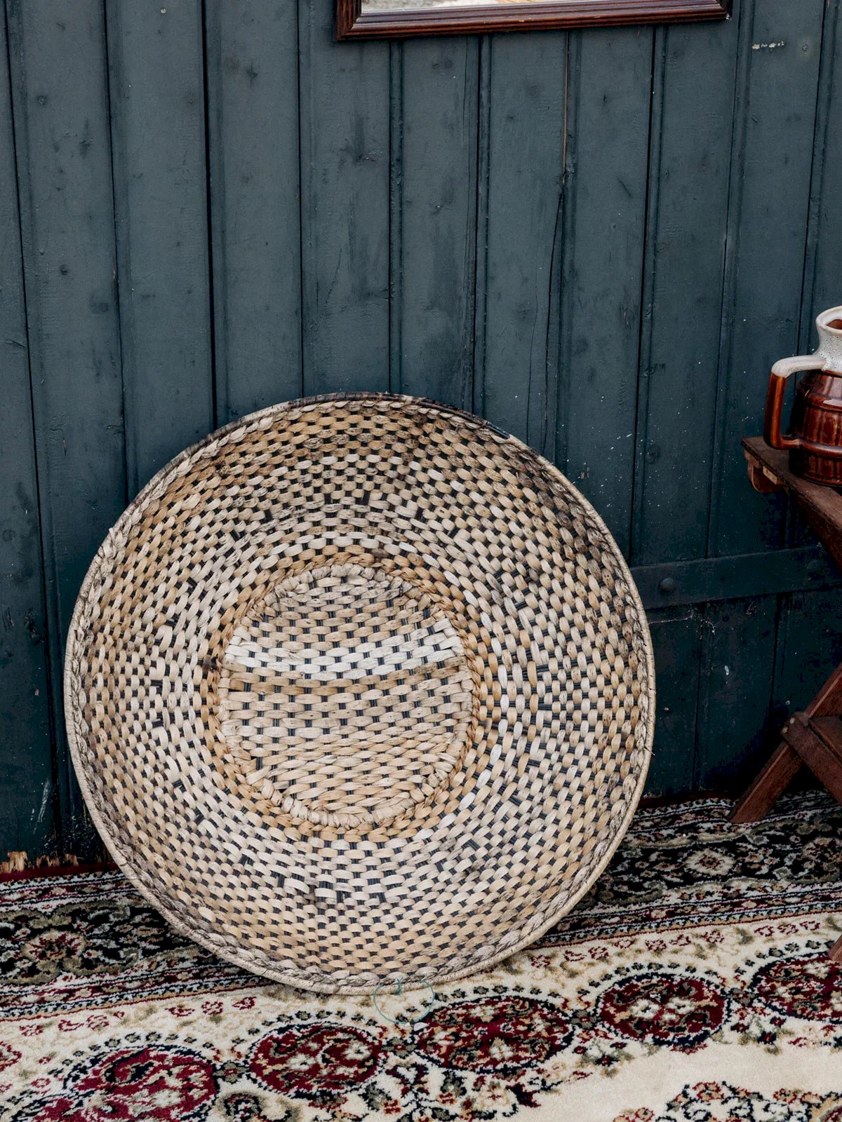 Add a touch of elegance to your interior with this large two-tone wicker basket in black and brown. Its careful weaving and time-worn appearance give it an authentic charm, ideal for enhancing a living space. Perfect for storage or as a decorative element, it naturally fits into any style of decor, from classic to contemporary. A piece that is both practical and full of character. Height: 13 cm Diameter: 60 cm Condition: Used: Item that has been used. Item showing some signs of superficial wear,... Used: Item that has been used. Item showing some signs of superficial wear, fully operational and working properly. It could be a display model or an item returned to the store after a short period of use. Any potential imperfections. Brand: Debongout Type: Vintage product Material: Wicker Style: Country