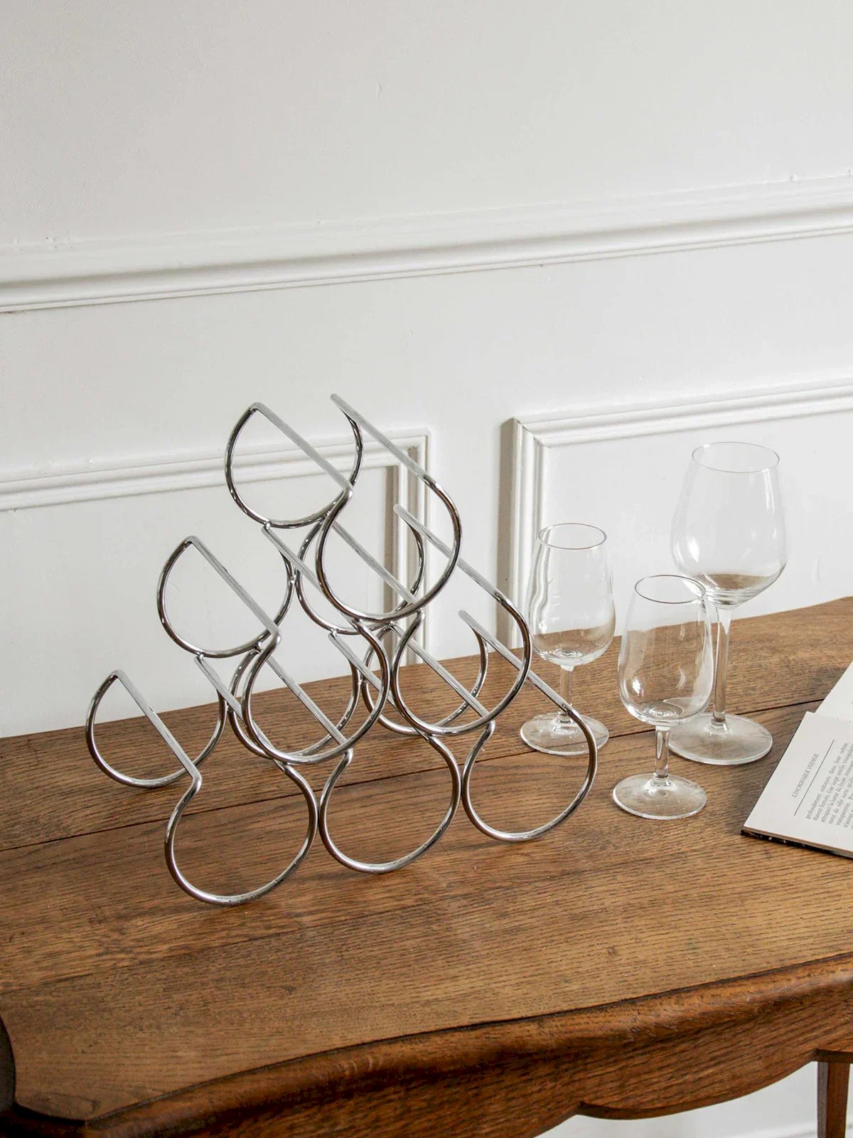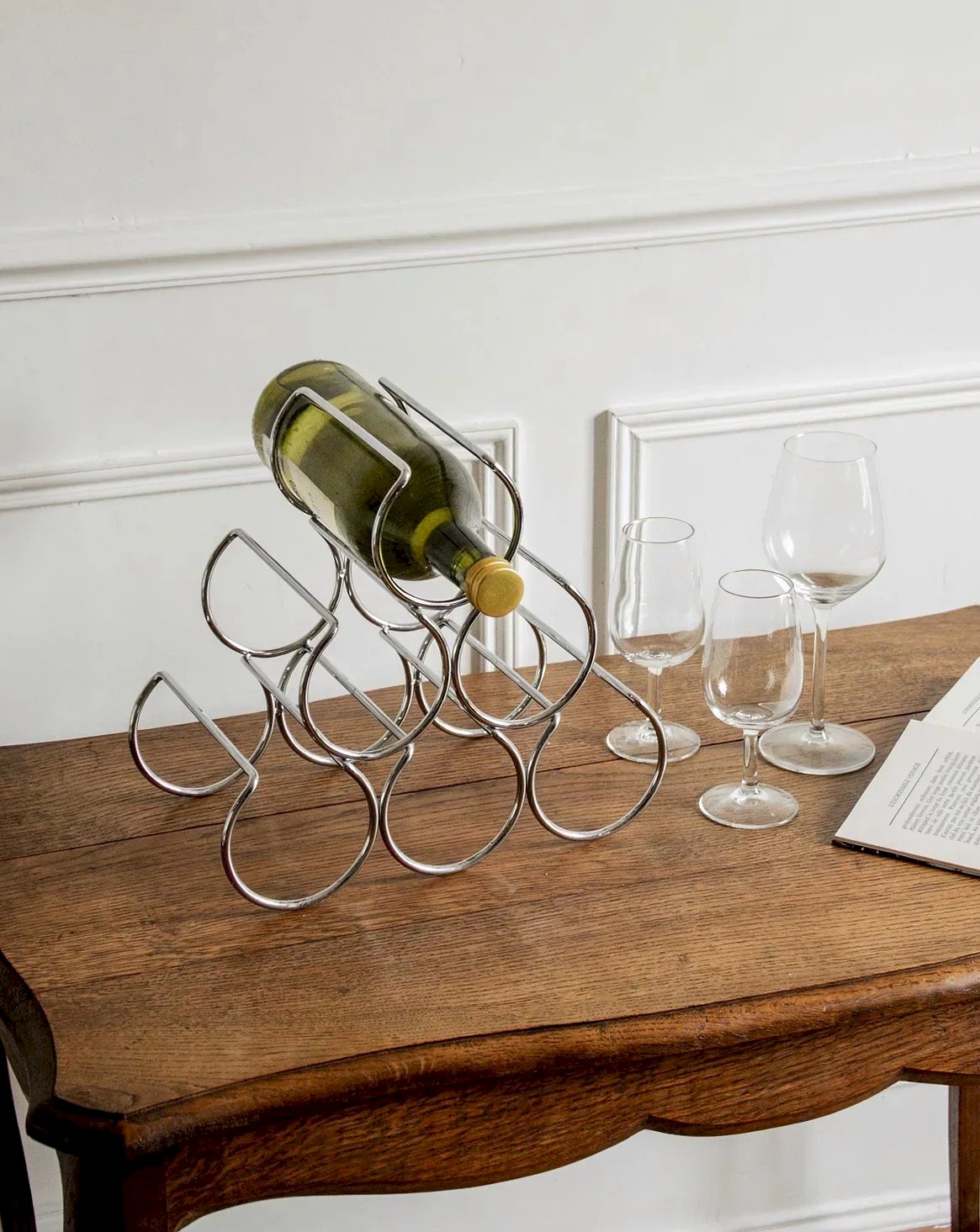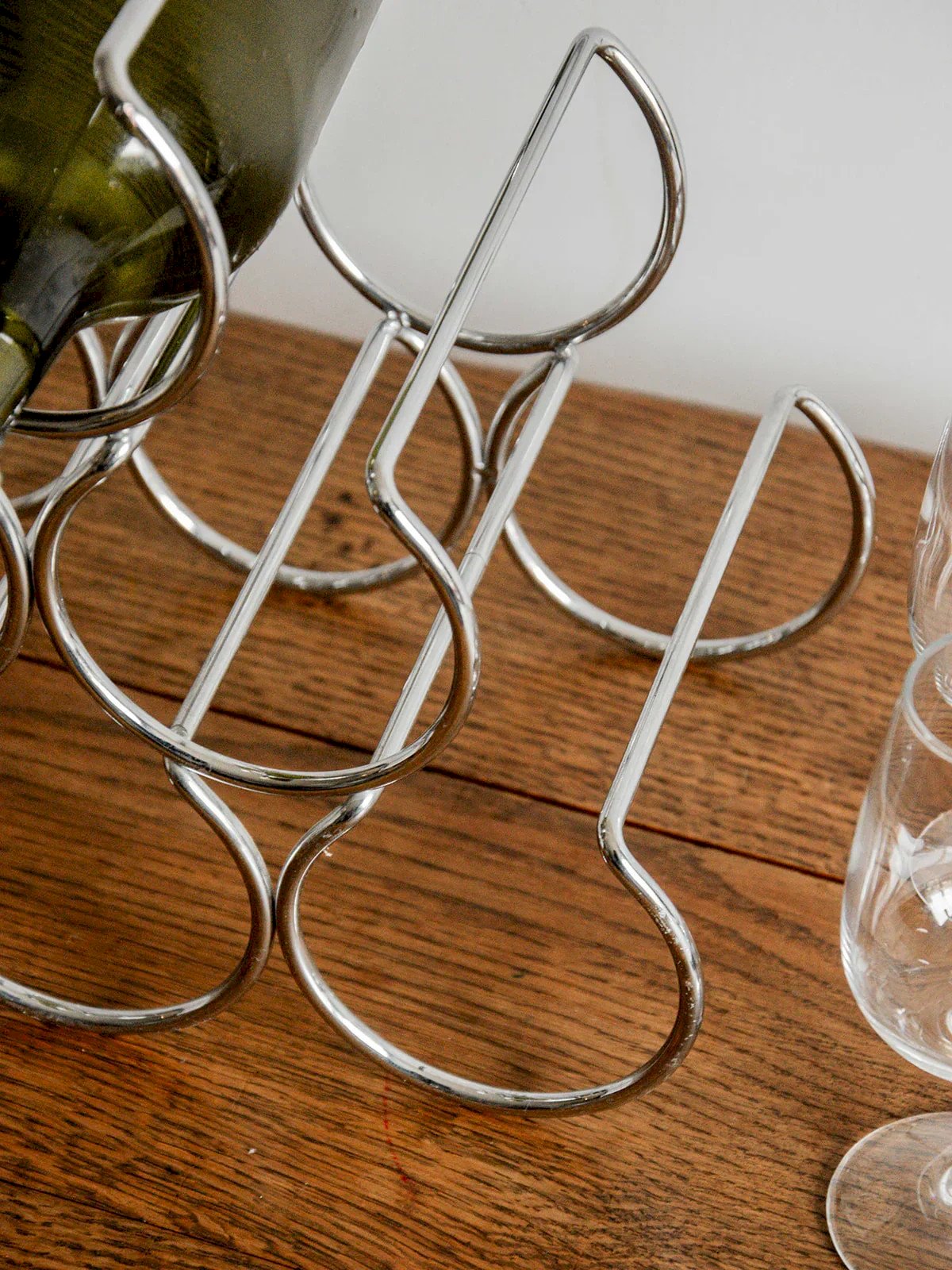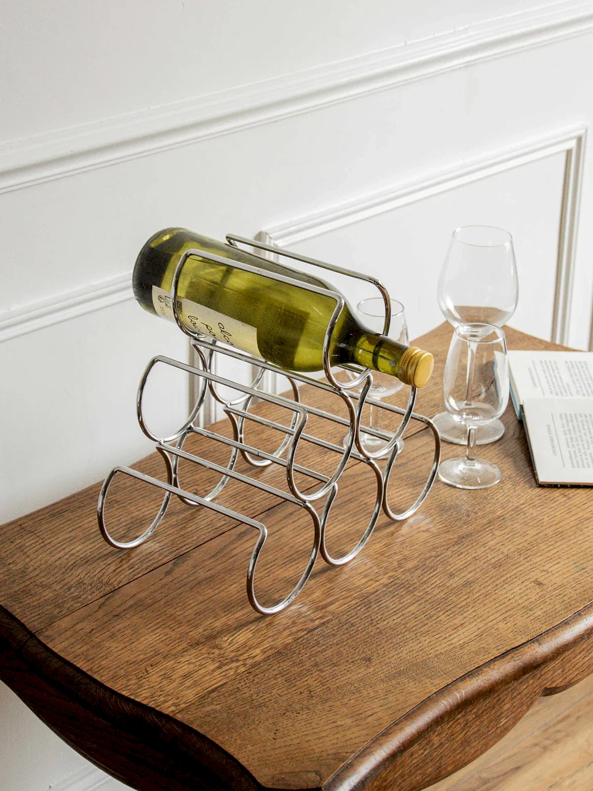 Add a touch of elegance to your interior with this chrome bottle holder, capable of holding up to 6 bottles. Its modern and sleek design harmoniously fits into all décors, while providing a practical solution to showcase your best bottles. Made from durable metal, it promises sturdiness and longevity while allowing easy access to your favorite wines. Ideal for dinners with friends or for everyday use, this bottle holder becomes a true decorative asset in your kitchen or dining room. Length: 30 cm Width: 17.6 cm Height: 27 cm Condition: Used: Item that has been used. Item shows some superficial signs of wear, ...Used: Item that has been used. Item shows some superficial signs of wear, fully operational and functioning correctly. It may be a demonstration model or an item returned to the store after a short period of use. any possible imperfections. Brand: Debongout Type: Thrifted product Material: Chrome Style: Countryside