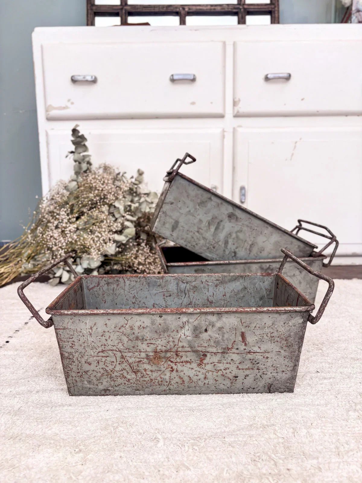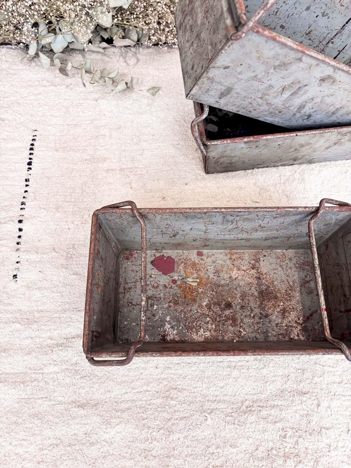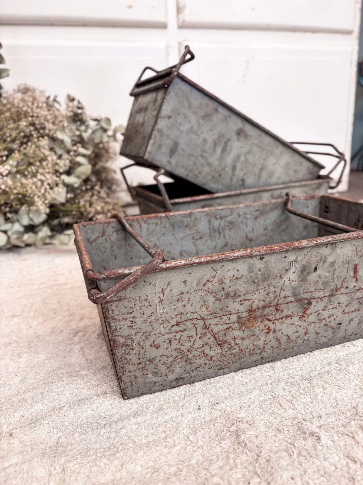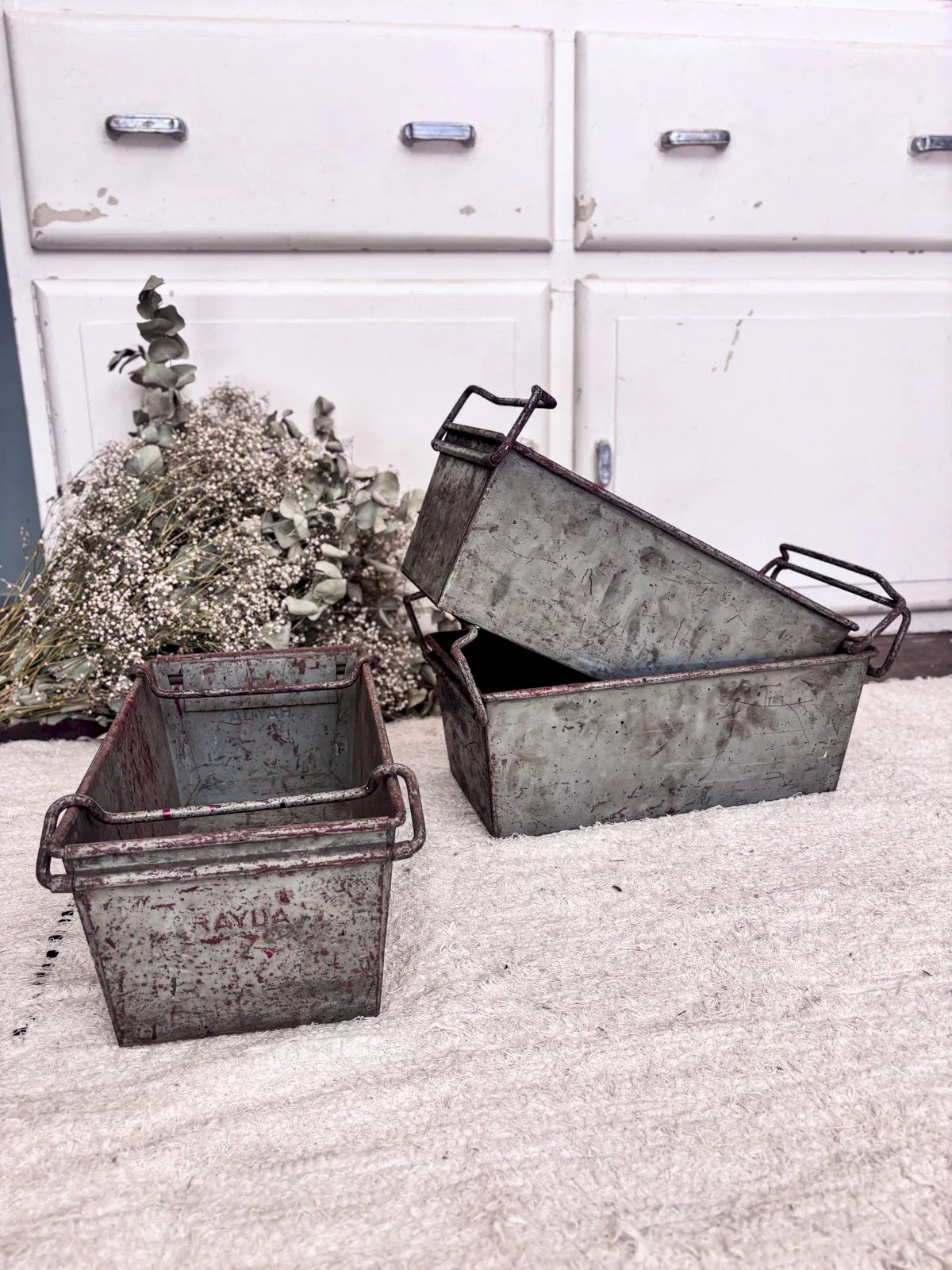 Discover our charming vintage galvanized steel box from the brand Rayda, adorned with two practical handles. Each piece bears the marks of time, adding a unique character to your decor. With three pieces available, these boxes lend themselves to various uses, whether for storage or as a decorative element. Bring a touch of authenticity to your interior with this lovely accessory in timeless style. Length: 42 cm Width: 22 cm Height: 16 cm Condition: Used: Item that has been used. Item showing some signs of superficial wear, fully operational and functioning correctly. It may be a demonstration model or a returned item after a short period of use, along with any possible imperfections. Brand: Debongout Type: Curated product Material: Metal Style: Country