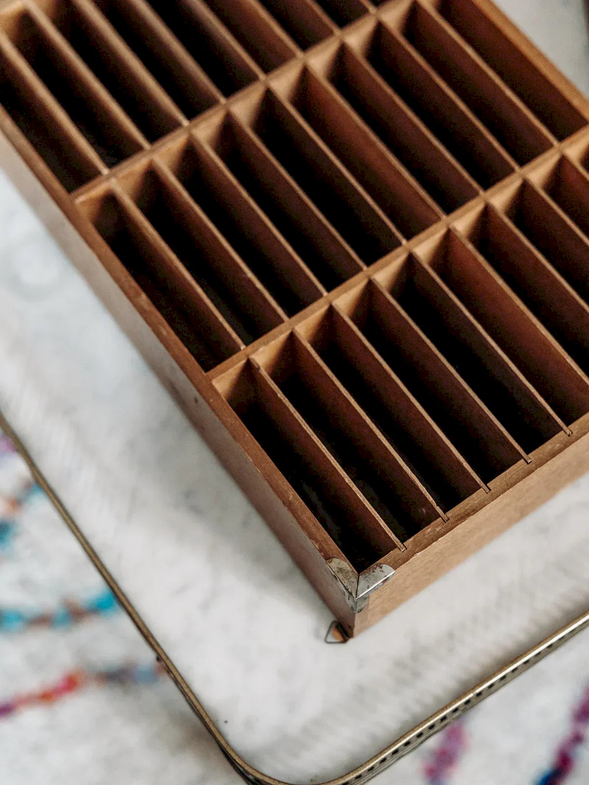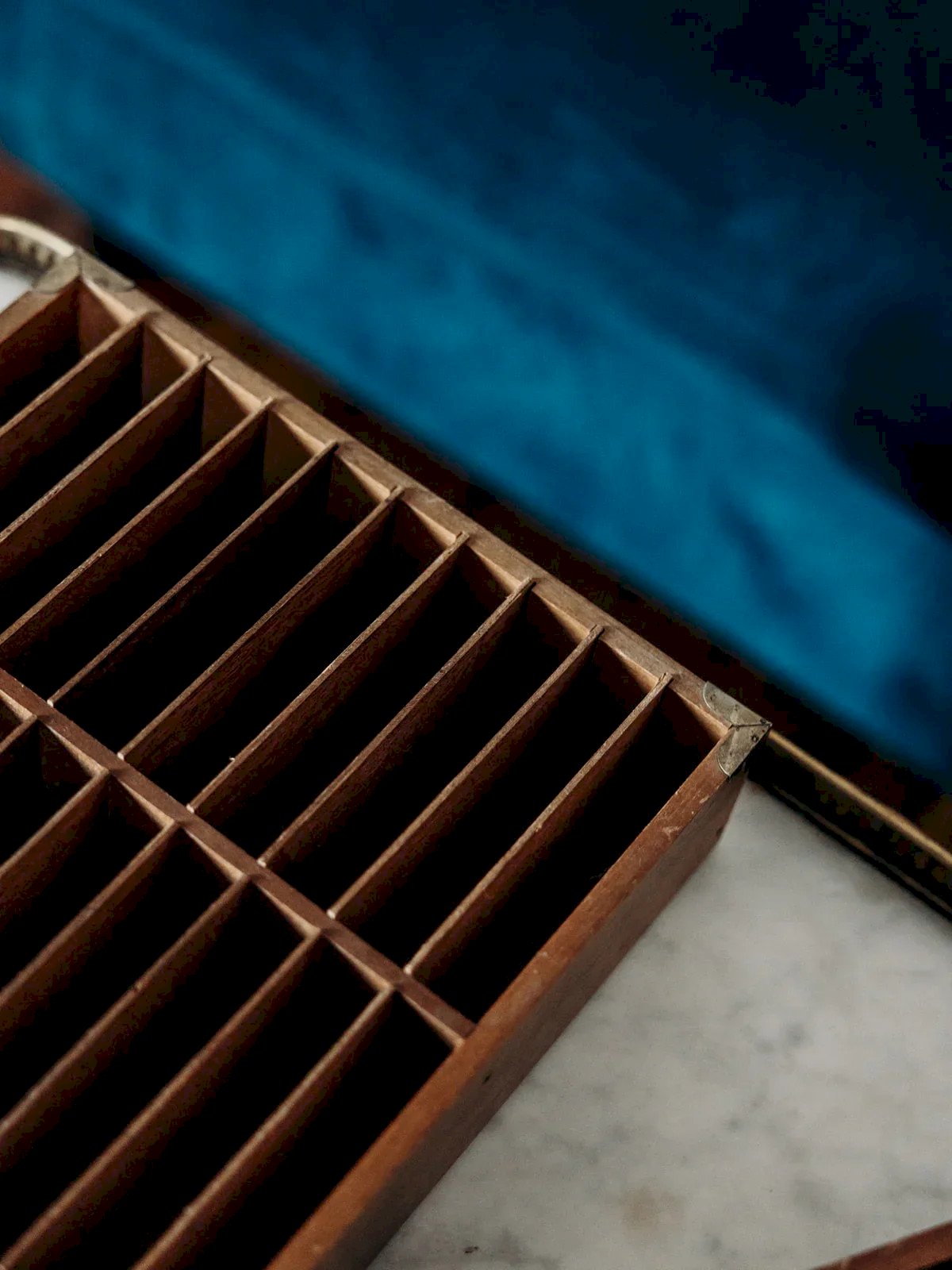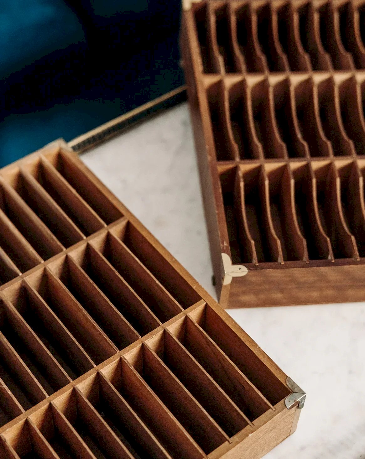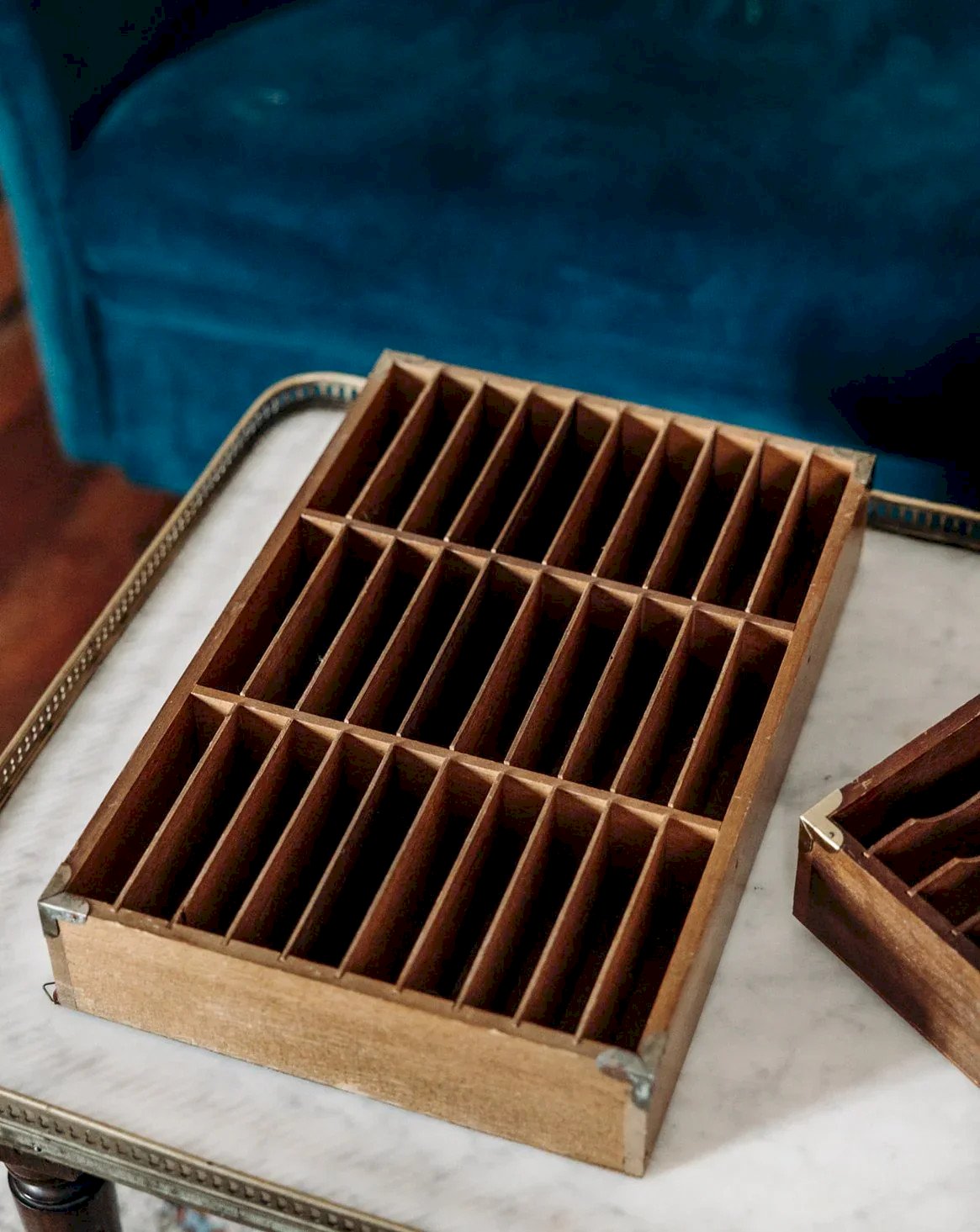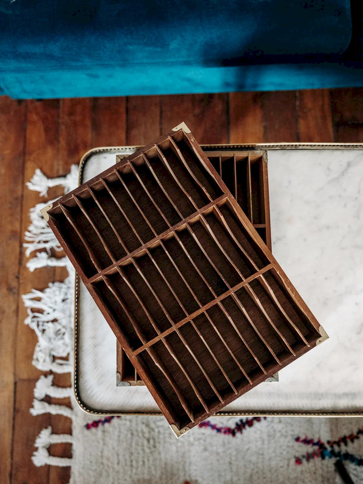 Add a vintage and authentic touch to your interior with this pair of wooden lockers. Although slightly different, both pieces are approximately the same size, offering an original and practical duo for storage or decoration. Perfect for a rustic or industrial style interior. Dimensions of the locker with silver metal corners: Length: 37 cm Width: 25 cm Dimensions of the compartments: Length: 11.5 cm Height: 2 cm Dimensions of the locker with gold metal corners: Length: 38 cm Width: 25.5 cm Dimensions of the compartments: Length: 11.5 cm Height: 2 cm Condition: Used: Item has been used. Item shows some superficial signs of wear, ...Used: Item has been used. Item shows some superficial signs of wear, fully operational and functioning correctly. It may be a demonstration model or an item returned to the store after a short period of use. Any potential imperfections. Brand: Debongout Type: Vintage product Material: Wood Style: Country