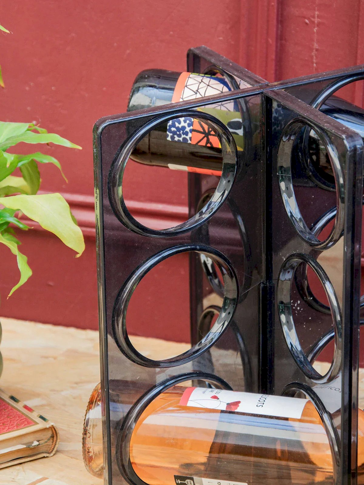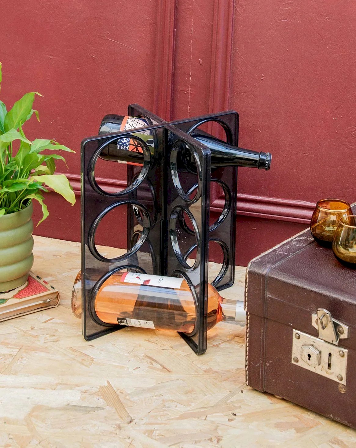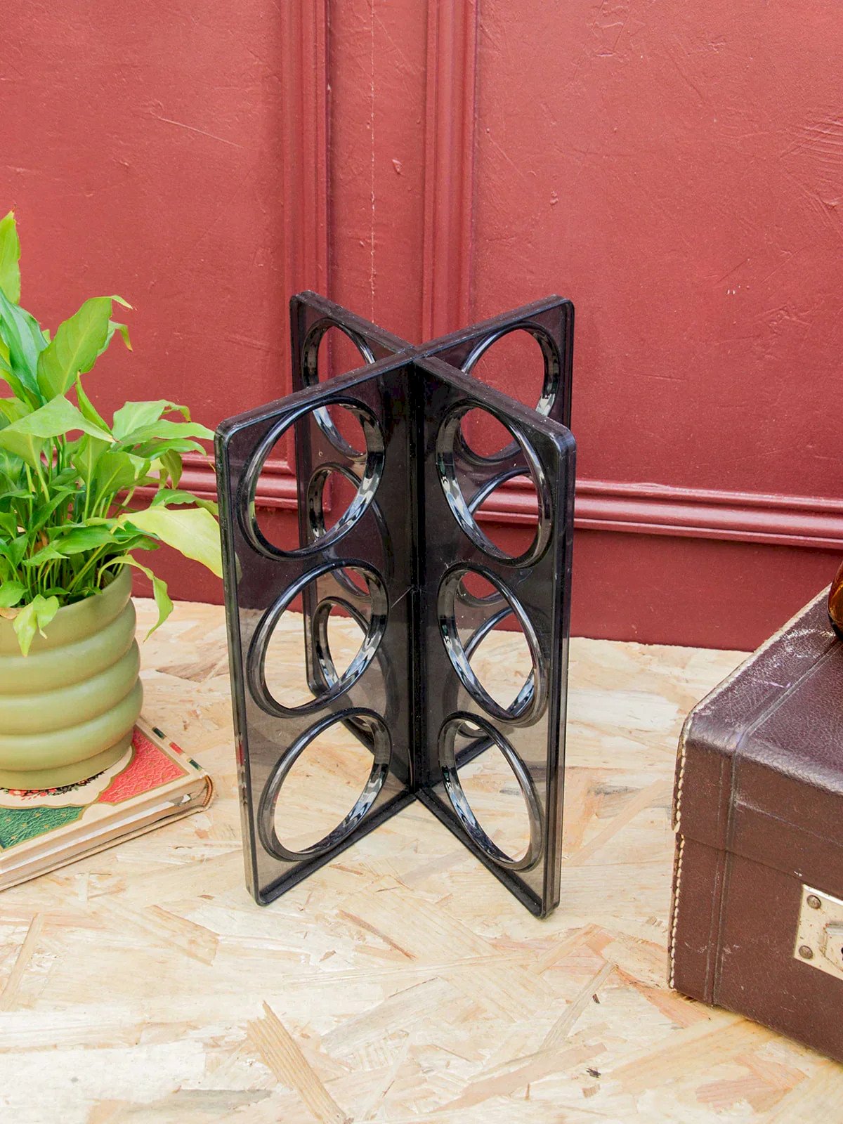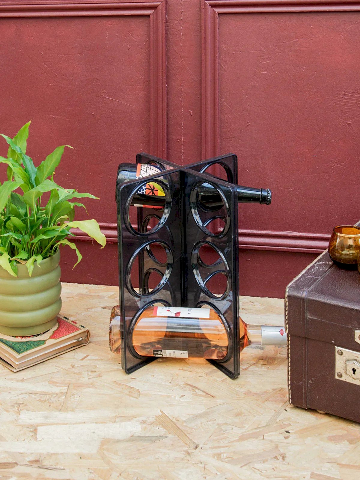 Discover this vintage bottle rack signed by Ikea, both practical and full of character. Made of molded smoky gray plastic, it can hold up to six bottles and stands out as a design piece with retro charm. A slight mark at the intersections bears witness to its history without harming its use. Perfect for adding an original touch to your wine corner or kitchen. Length: 26 cm Width: 18.5 cm Height: 31 cm Condition: Used: Item has been used. Item shows some signs of superficial wear, fully operational and working properly. It may be a demonstration model or a returned item after a short period of use. The possible imperfections. Brand: Debongout Type: Vintage Product Material: Plastic Style: Country