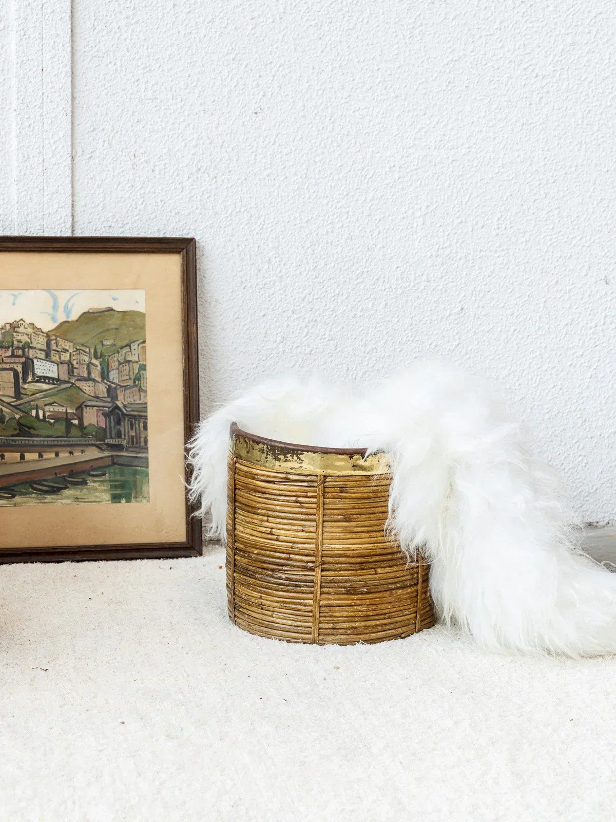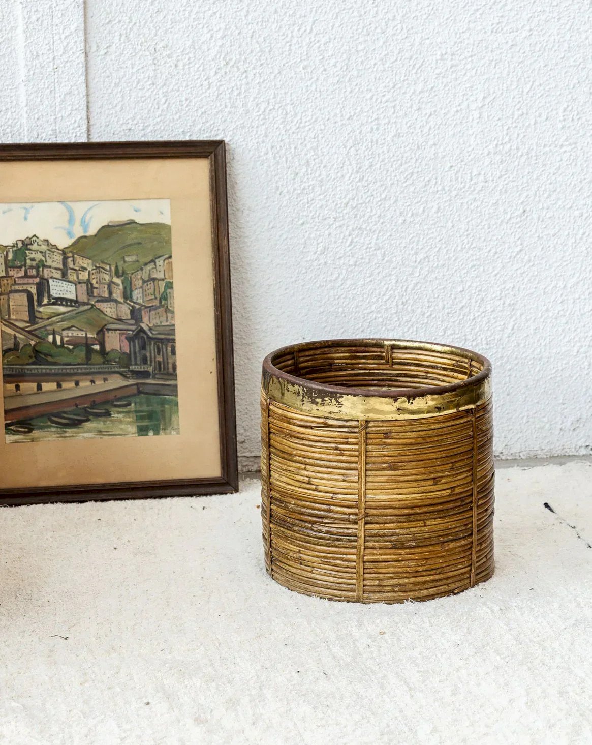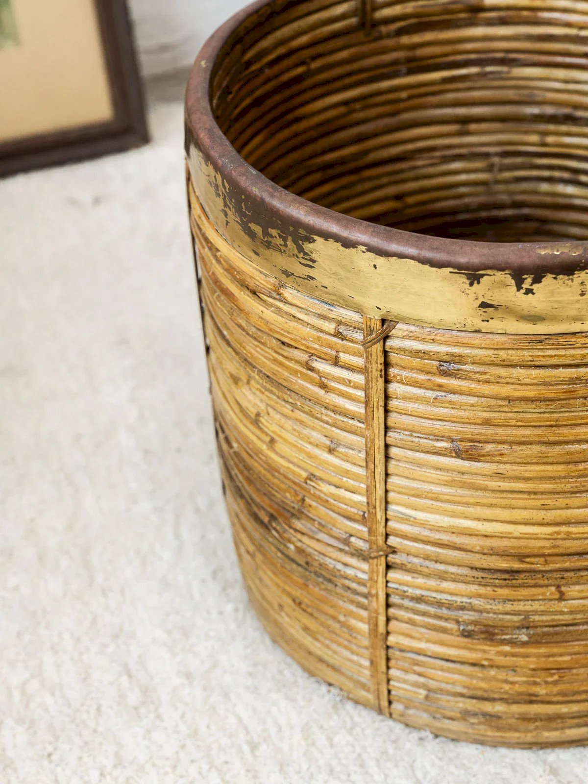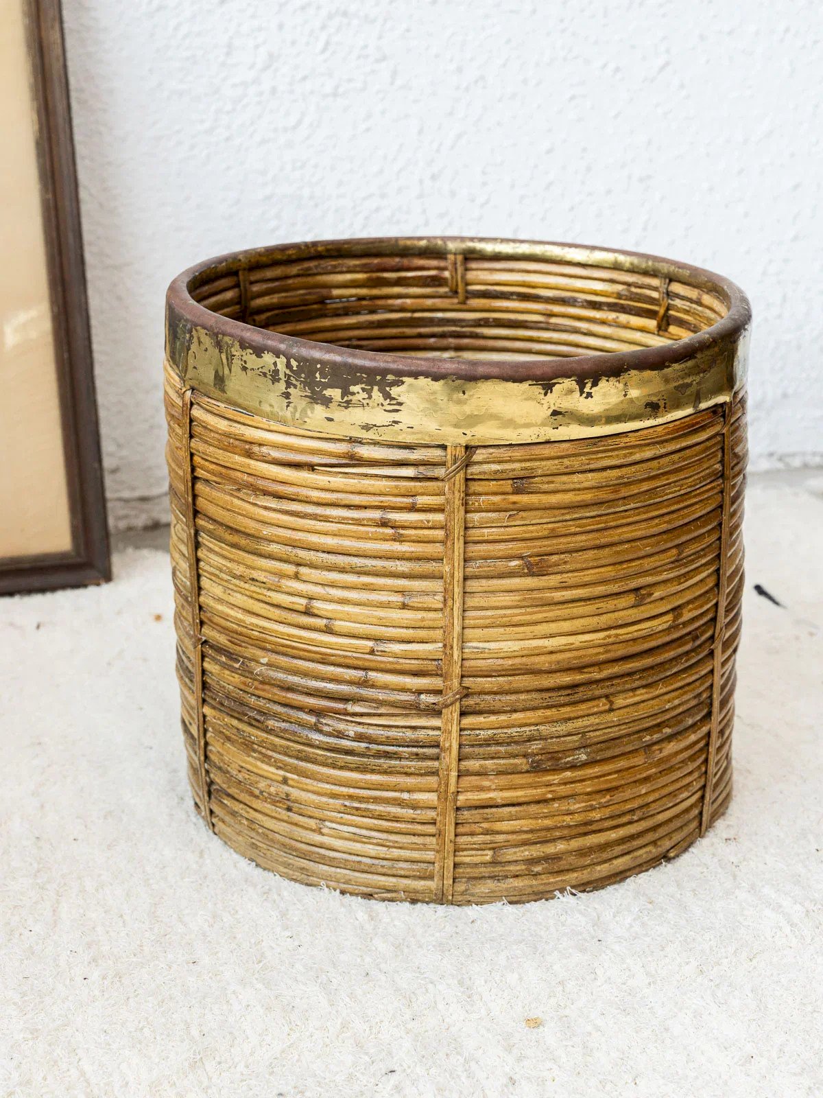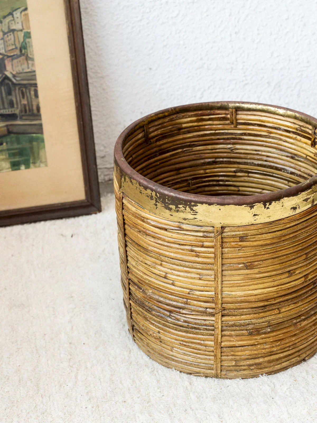 Add a touch of elegance to your interior with this vintage rattan basket, enhanced by a golden metal rim. Its refined design combines retro charm and modernity, making this accessory an essential decorative element. Perfect for use in the living room or bedroom, it will also blend effortlessly into a bohemian atmosphere. A unique piece that combines functionality and aesthetics to elevate all your spaces. Web exclusive, the meeting will take place at your home! Height: 36 cm Diameter: 36 cm Condition: Used item: An item that has been used. An item showing some superficial signs of wear... Used item: An item that has been used. An item showing some superficial signs of wear, fully operational and functioning correctly. It may be a demonstration model or an item returned to the store after a short period of use. possible imperfections. Brand: Debongout Type: Vintage product Material: Rattan, Metal Style: Country