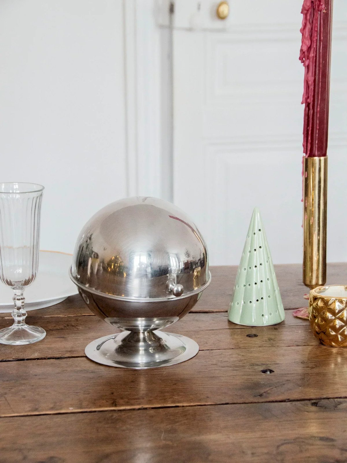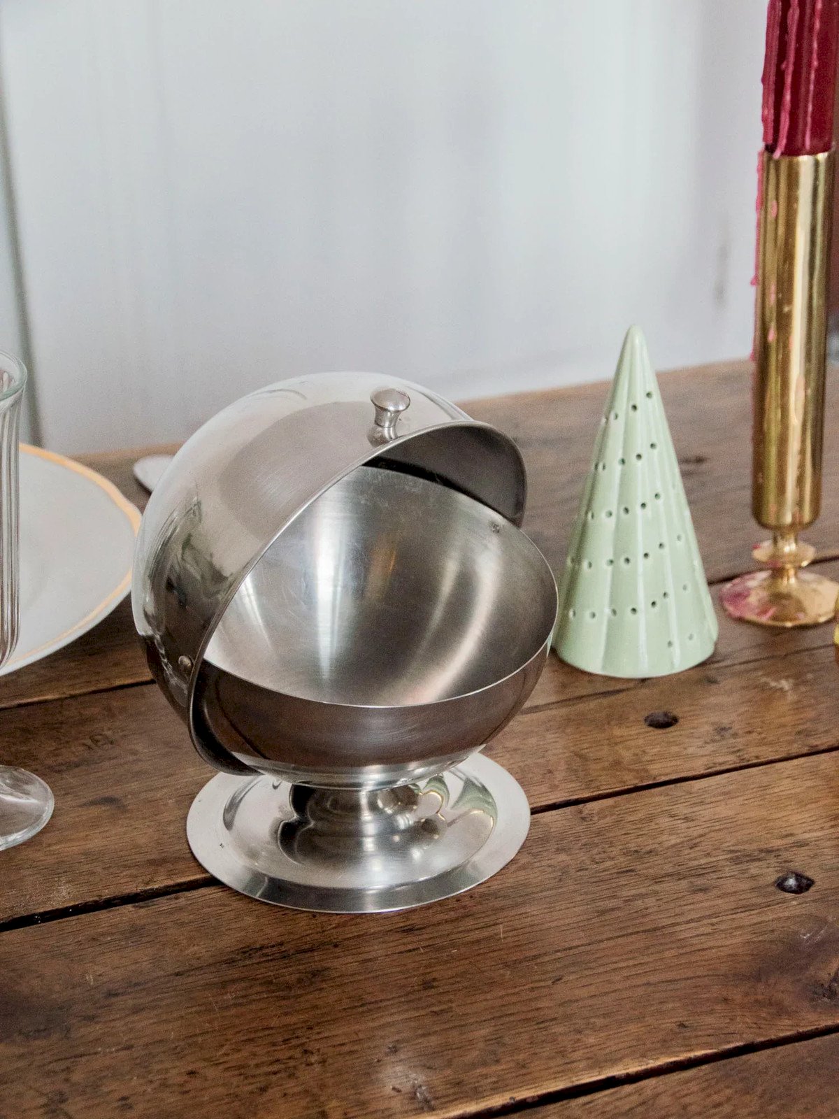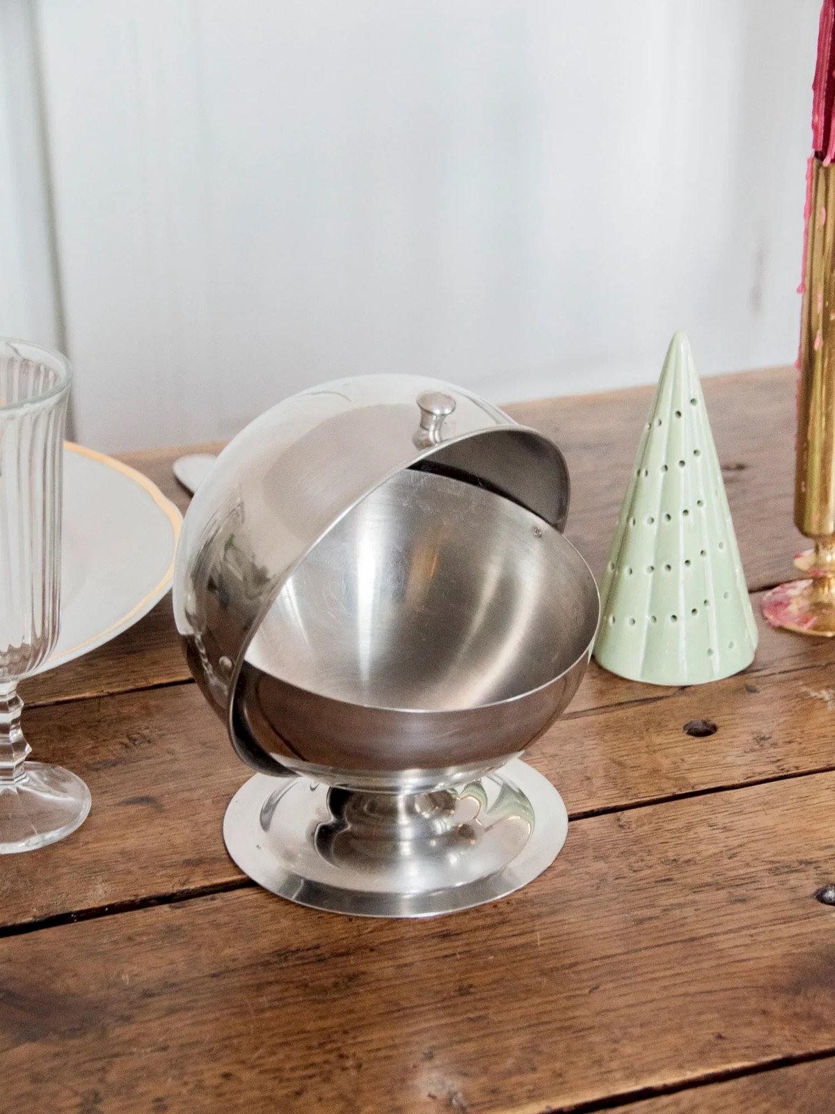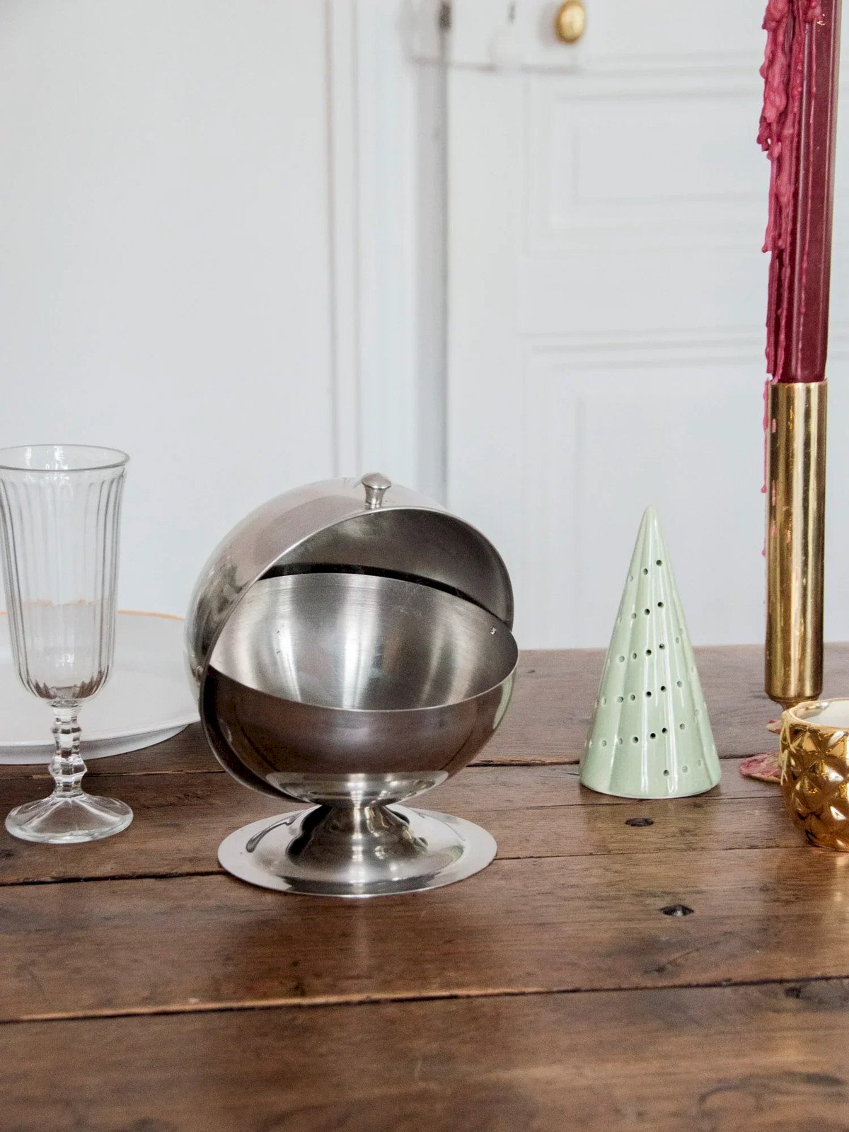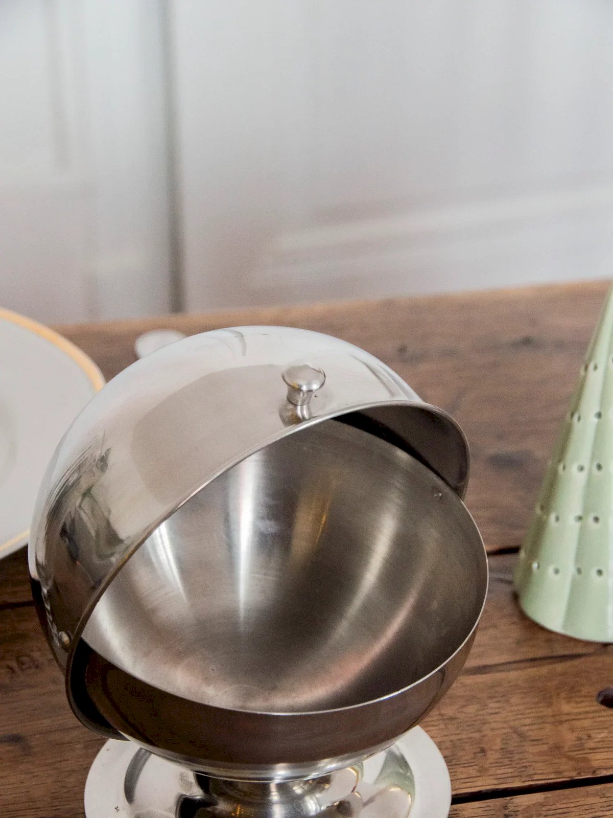 Adopt this metal sugar bowl with a spherical design that gently opens from the front, resting on an elegant round base. Its compact size makes it a perfect companion for serving tea or breakfast, providing discreet storage for sugar or condiments. The metallic finish adds a subtle and contemporary touch, ideal for a minimalist kitchen or an intimate table setting, where every detail contributes to a warm atmosphere. Height: 17 cm Diameter: 13 cm Condition: Used item; has been utilized. Item shows some signs of superficial wear. Fully operational and functioning correctly. It may be a demonstration model or a product returned to the store after a short period of use, with possible imperfections. Brand: Debongout Type: Vintage product Material: Stainless steel, Metal Style: Country.