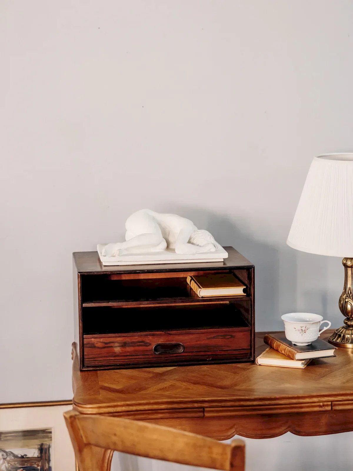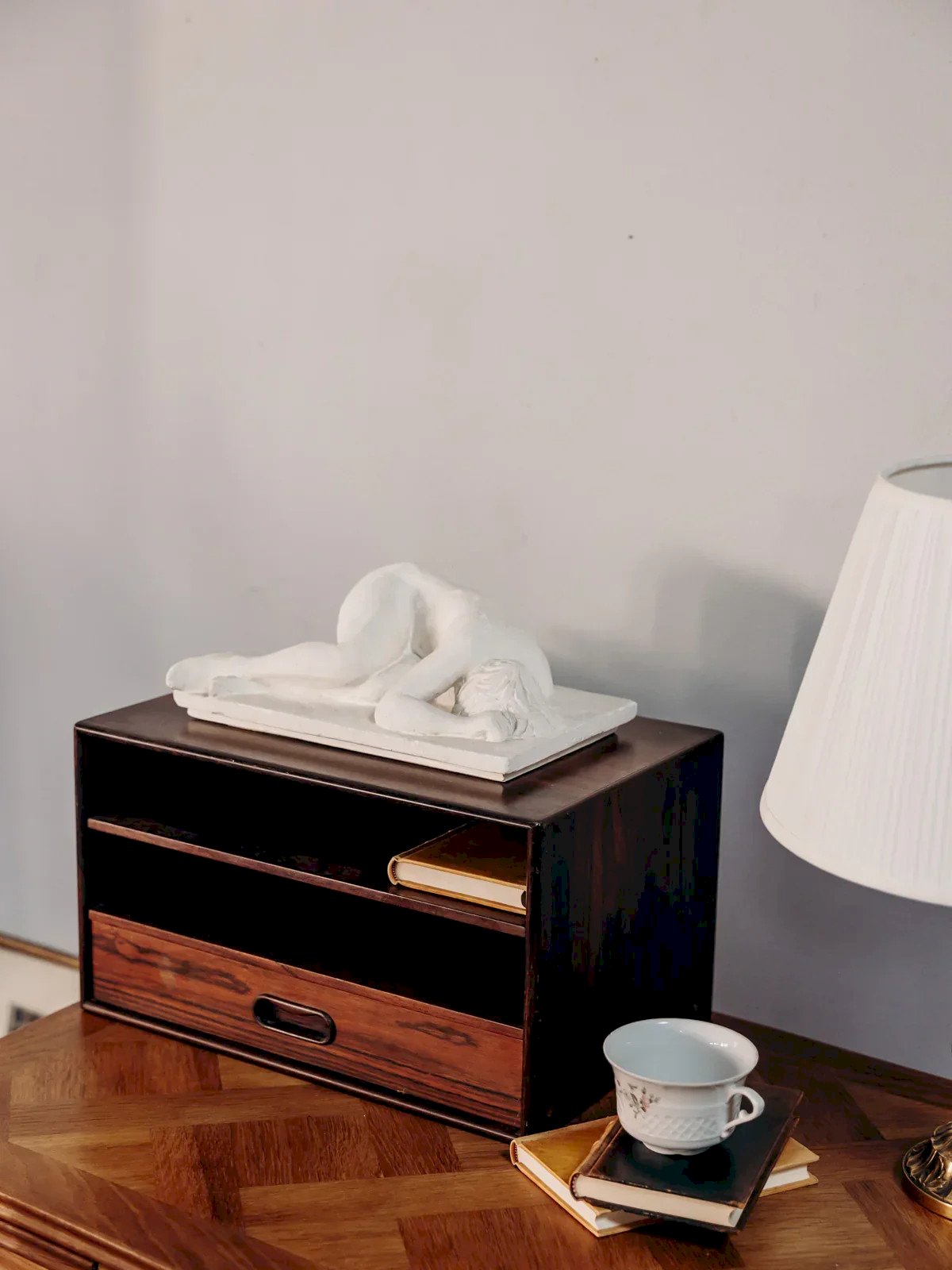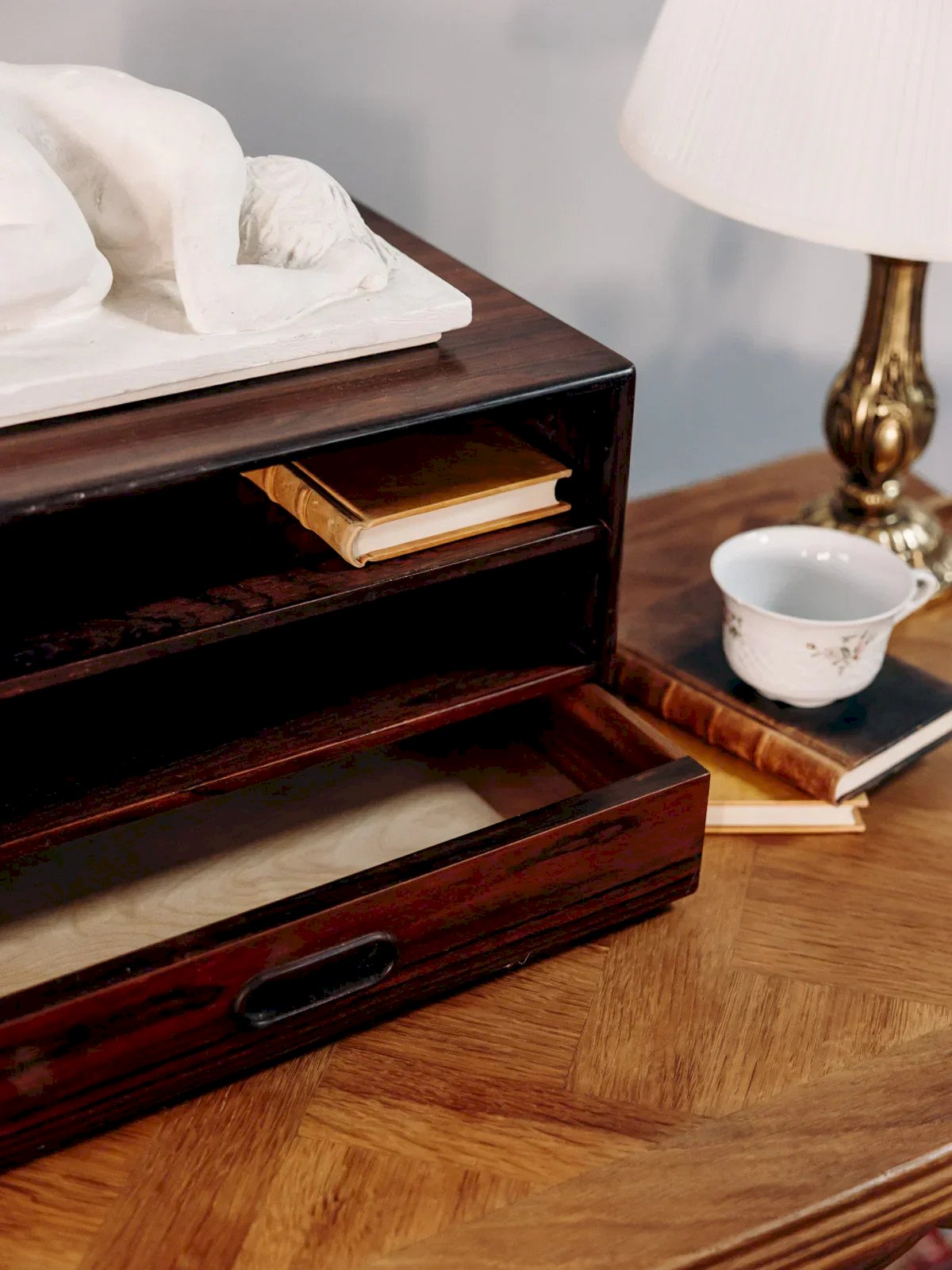 Adopt this dark wood Scandinavian storage unit with a rectangular profile, designed to organize an office with elegance. Its two open compartments and small drawer offer practical storage solutions for papers, notebooks, and small accessories, while the dark finish adds a warm and contemporary touch to a minimalist interior. Compact and proportionate, it fits easily on a work surface or low shelf. Light wear and scratches. Length: 45 cm Width: 30 cm Height: 26 cm Height of small drawer: 6 cm Condition: Used: Item that has been used. Item showing some superficial wear marks, fully operational and functioning properly. It may be a demonstration model or an item returned to the store after a short period of use. possible imperfections. Brand: Debongout Type: Curated product Material: Wood Style: Country