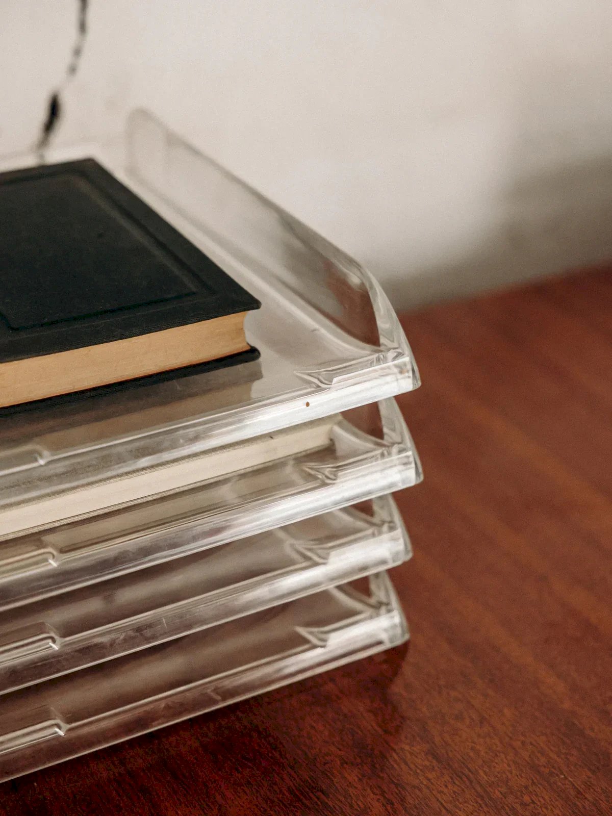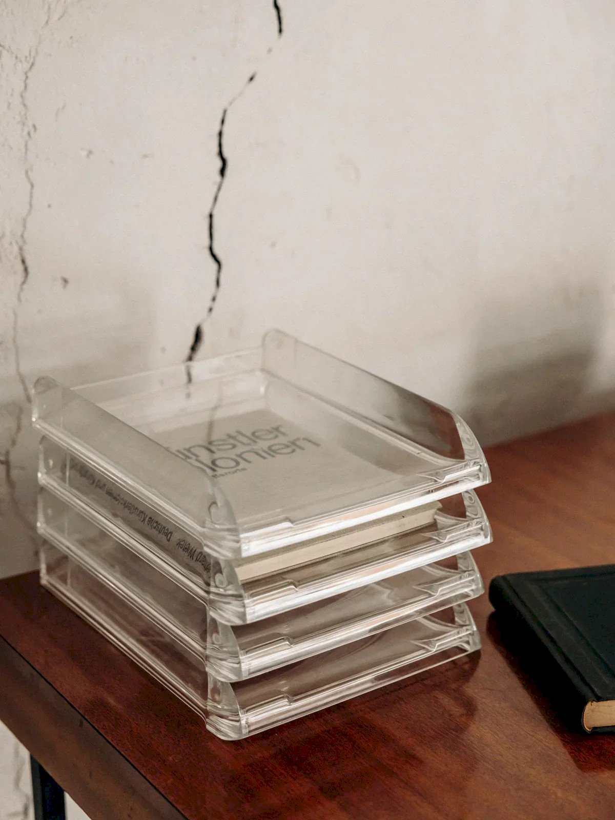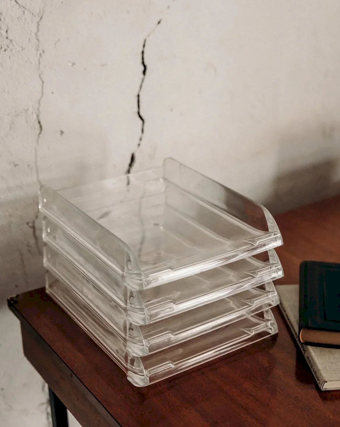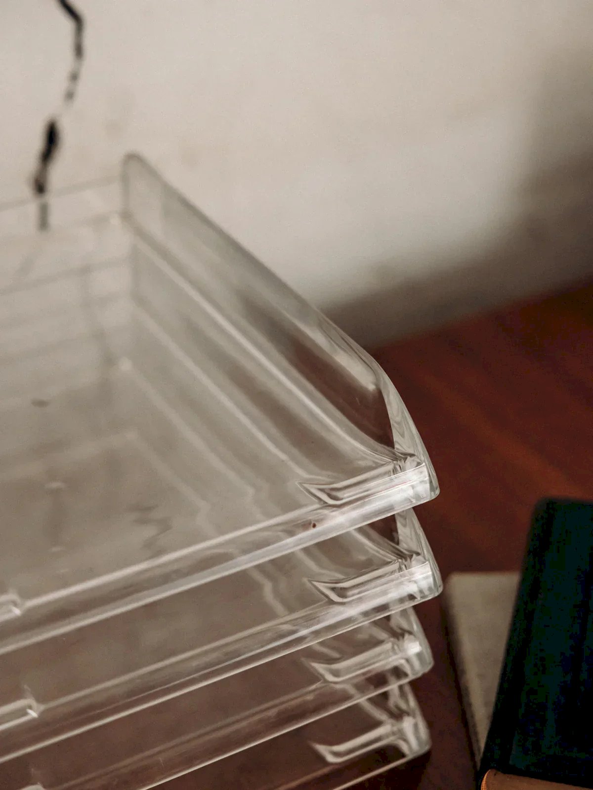 Discover this set of 4 transparent plexiglass letter trays, perfect for organizing your documents in 24 x 32 cm format. With their vintage design and clean lines, these high-end organizers combine practicality and elegance. Ideal for a refined office or a well-organized workspace, they integrate seamlessly into both modern and classic decor. Place them on a desk, a shelf, or in a storage unit to structure your files with style. An essential accessory for combining organization and aesthetics. Length: 33 cm Width: 27 cm Height: 5 cm Condition: Used: Item has been used. Item shows some superficial signs of wear... Used: Item has been used. Item shows some superficial signs of wear, fully operational and functioning correctly. It may be a demonstration model or an item returned to the store after a short period of use. any possible imperfections. Brand: Debongout Type: Thrifted product Material: Plexiglass Style: Country