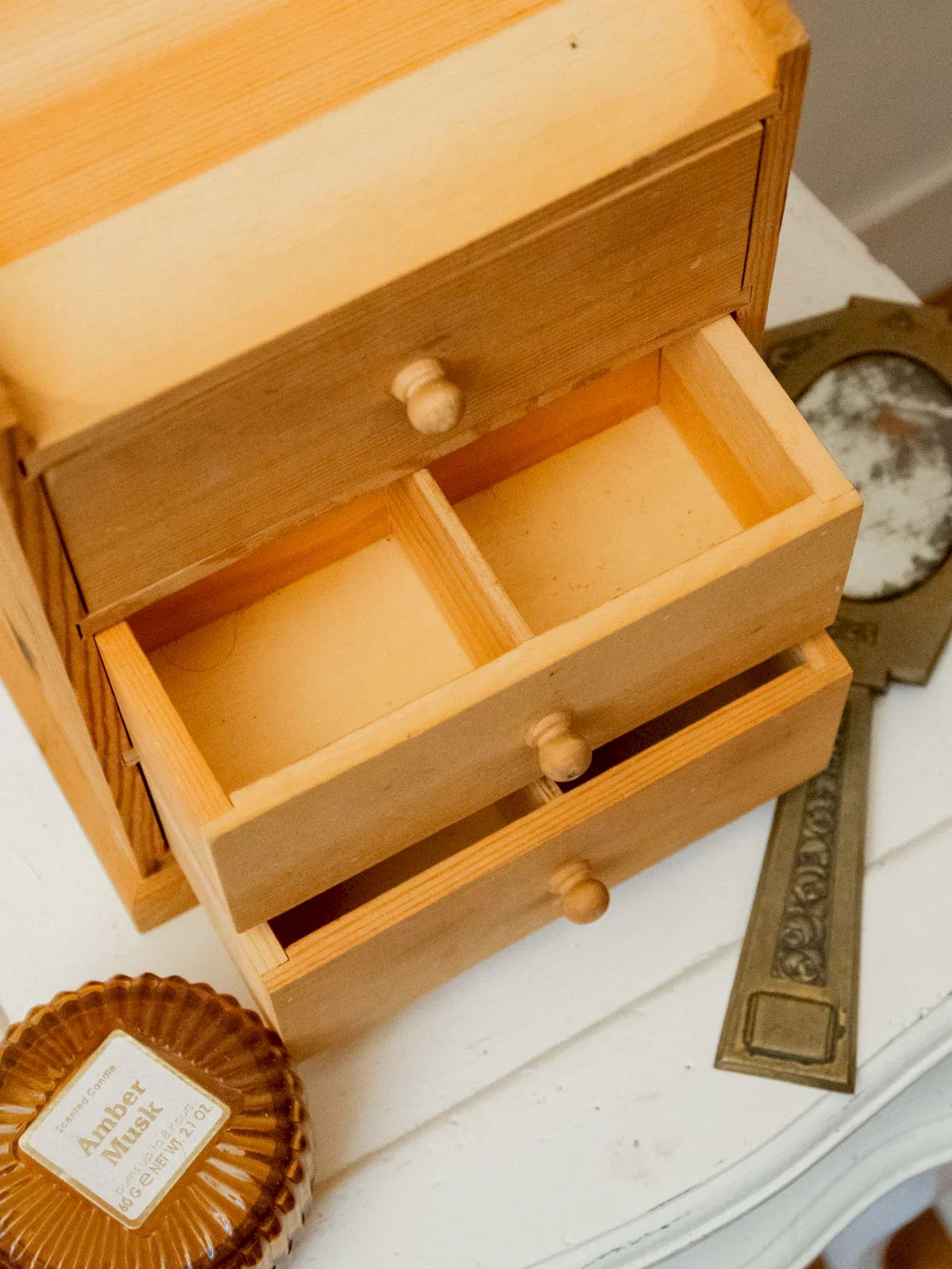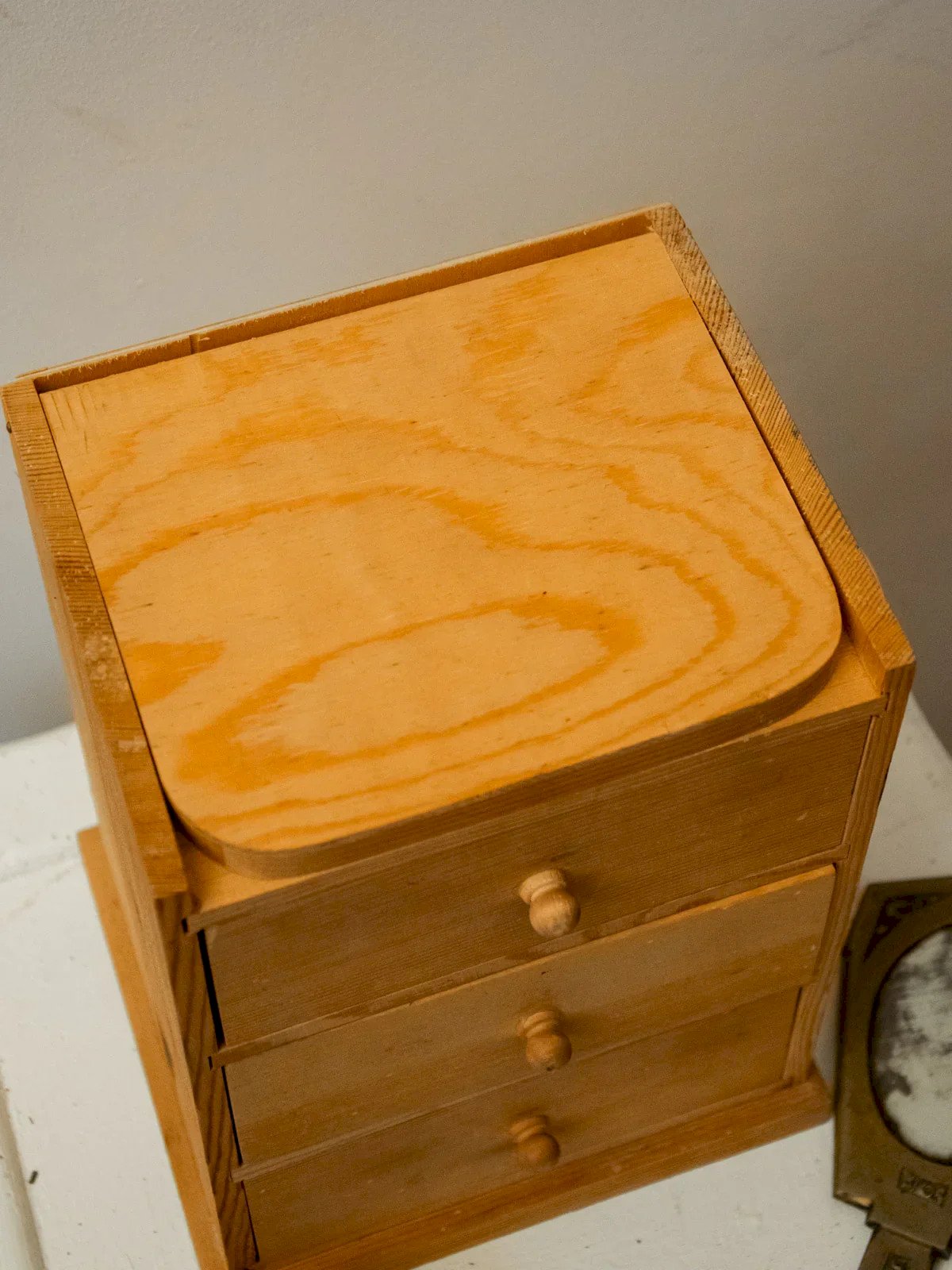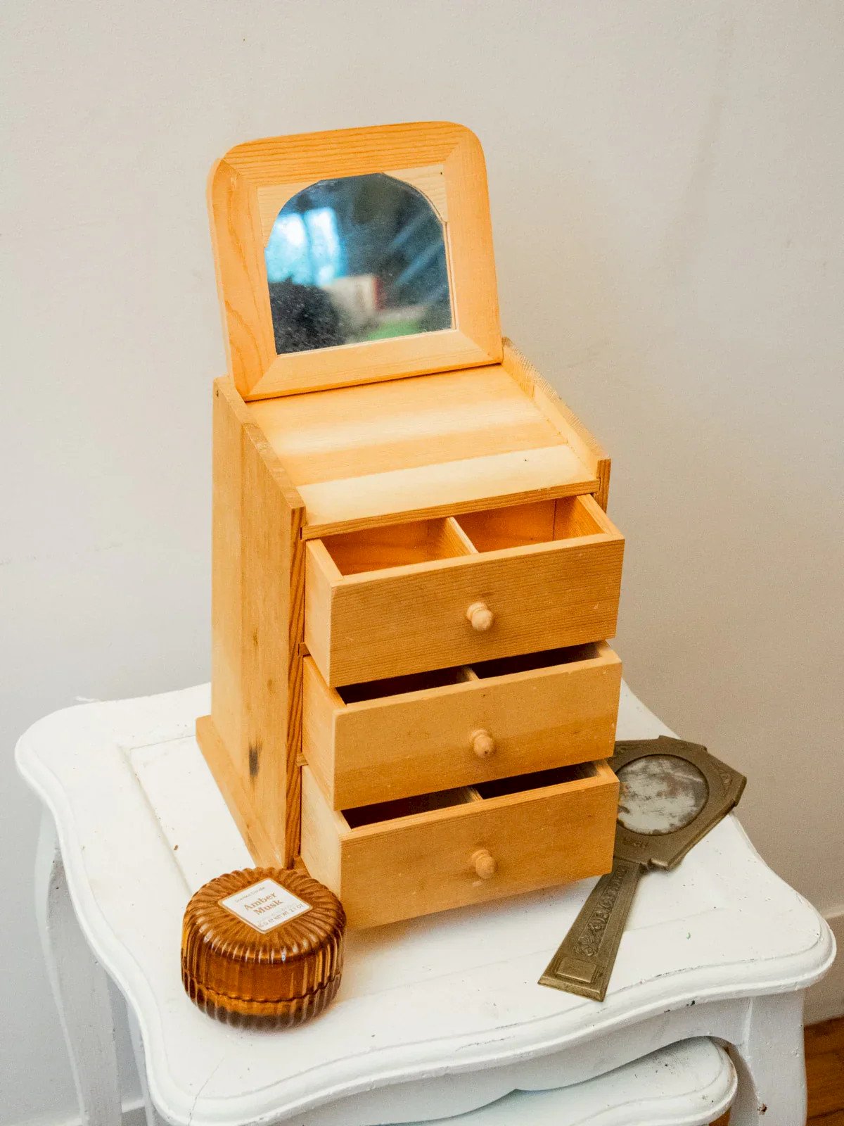 Discover this light wood storage box with a sleek and natural style, designed to delicately organize jewelry and small accessories. Its small flip-up mirror adds a practical touch for touch-ups and beauty routines, while its three drawers offer well-proportioned compartments to separate your essentials. Compact in size, it easily fits on a vanity, console, or bedside table, bringing a warm and understated ambiance to your interior. Length: 18 cm Width: 14.5 cm Height: 25 cm Condition: Used: Item has been used. Item shows some signs of superficial wear... Used: Item has been used. Item shows some signs of superficial wear, fully operational and functioning properly. It may be a demonstration model or an item returned to the store after a short period of use. Any possible imperfections. Brand: Debongout Type: Vintage product Material: Wood Style: Country