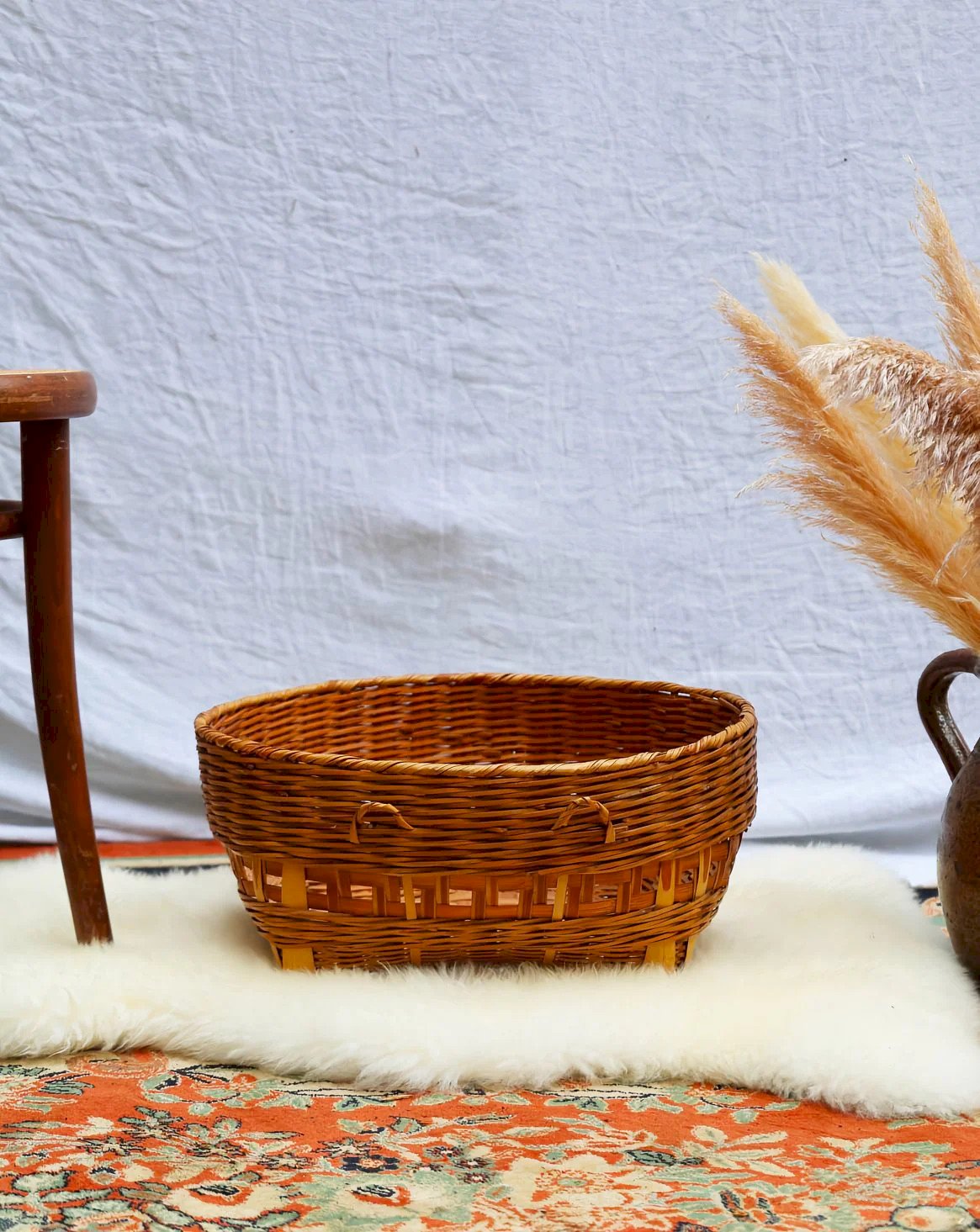 Add this wicker and bamboo basket with careful weaving, whose square base opens into a circular silhouette with balanced proportions. Its wide opening easily accommodates blankets, magazines, or fruits, while its lightweight and stable structure facilitates movement as needed. Its natural and artisanal aesthetic brings a warm and elegant touch to the living room, entryway, or bathroom, creating a friendly and calming atmosphere. Base length: 26 cm Base width: 26 cm Height: 20 cm Top diameter: 40 cm Condition: Used: Item that has been used. Item showing some superficial signs of wear, fully operational and functioning properly. It may be a display model or an item returned to the store after a short period of use, with possible imperfections. Brand: Debongout Type: Thrifted product Material: Wicker, Bamboo Style: Country