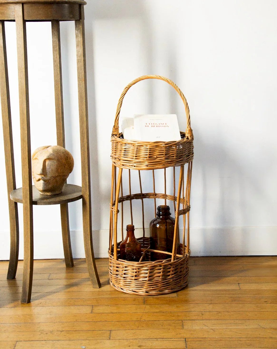 Discover our wicker bottle basket, a piece that combines rustic charm and practicality. Perfect for holding your precious bottles, it adds a natural and warm touch to the kitchen or dining room. Its authentic spirit harmonizes easily with all interior styles, from the most classic to the most contemporary. Height: 68 cm Diameter: 27 cm Height of the niche: 38 cm Height of the high niche: 24 cm Condition: Second hand: Item that has been used. Item showing some signs of superficial wear, fully operational and functioning correctly. It may be a demonstration model or an item returned to the store after a short period of use. Any possible imperfections. Brand: Debongout Type: Thrifted product Material: Wicker Style: Country