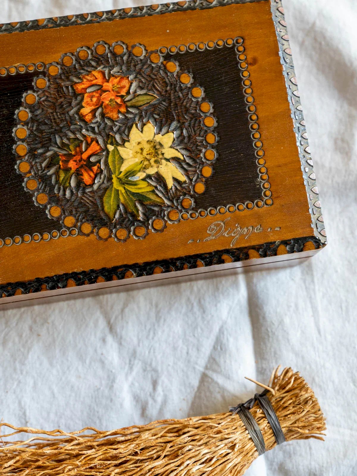 Discover this elegant vintage decorative wooden box, signed Digne, dating from the 1960s. With its timeless design and meticulous finishes, it adds a retro touch to your interior decor. Ideal for storing your small treasures or as a centerpiece on a piece of furniture, this box combines art and functionality. A must-have for vintage lovers! Length: 18 cm Width: 12.5 cm Height: 6 cm Condition: Pre-owned: Item has been used. Item shows some signs of superficial wear, fully operational and functioning properly. It may be a demonstration model or an item returned to the store after a short period of use. Potential imperfections. Brand: Debongout Type: Thrifted Product Material: Wood Style: Country