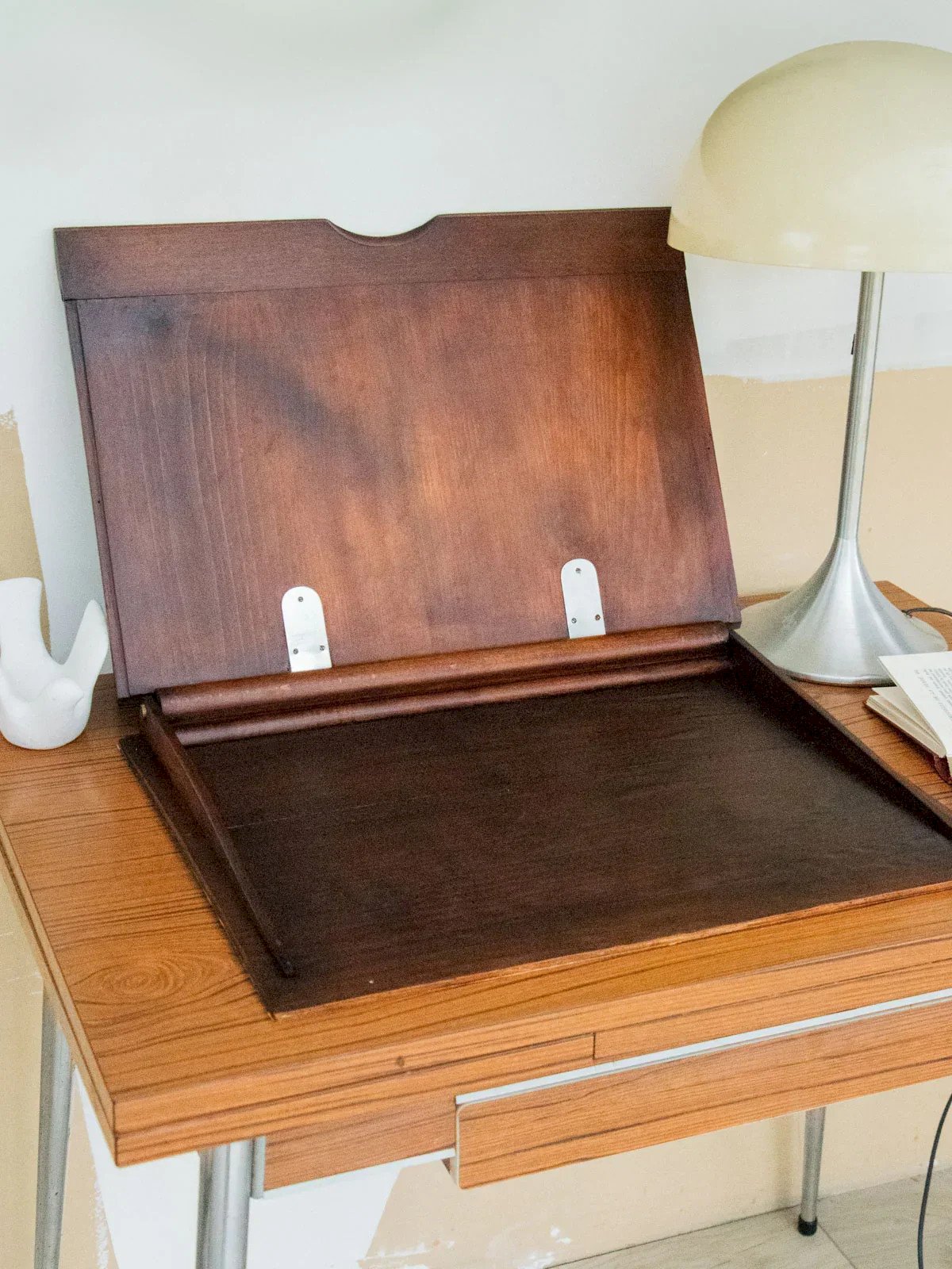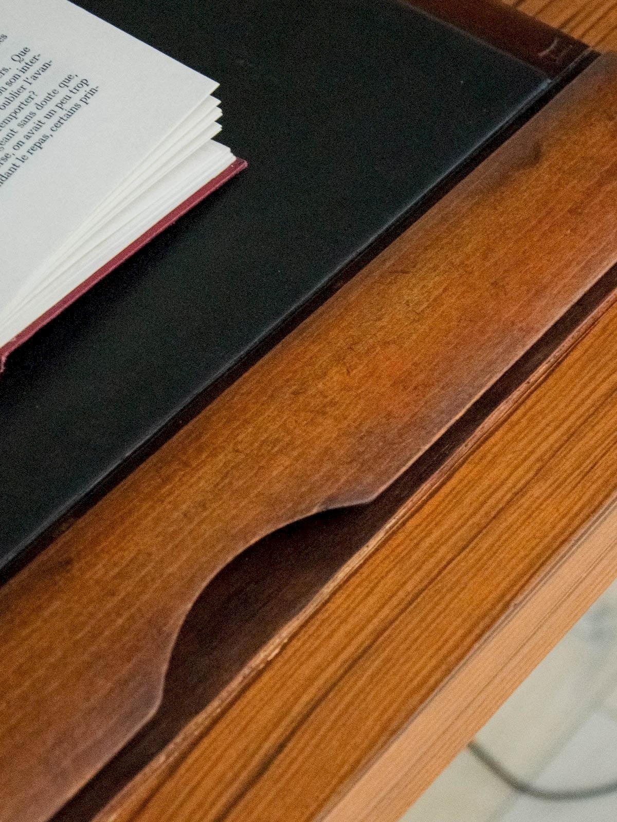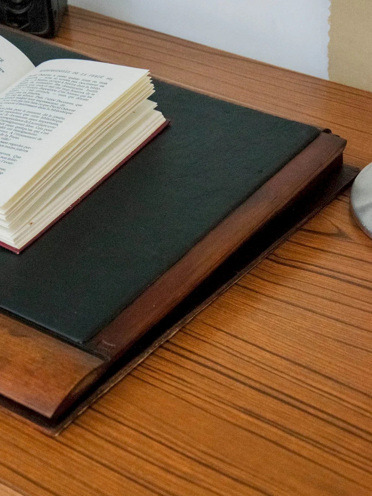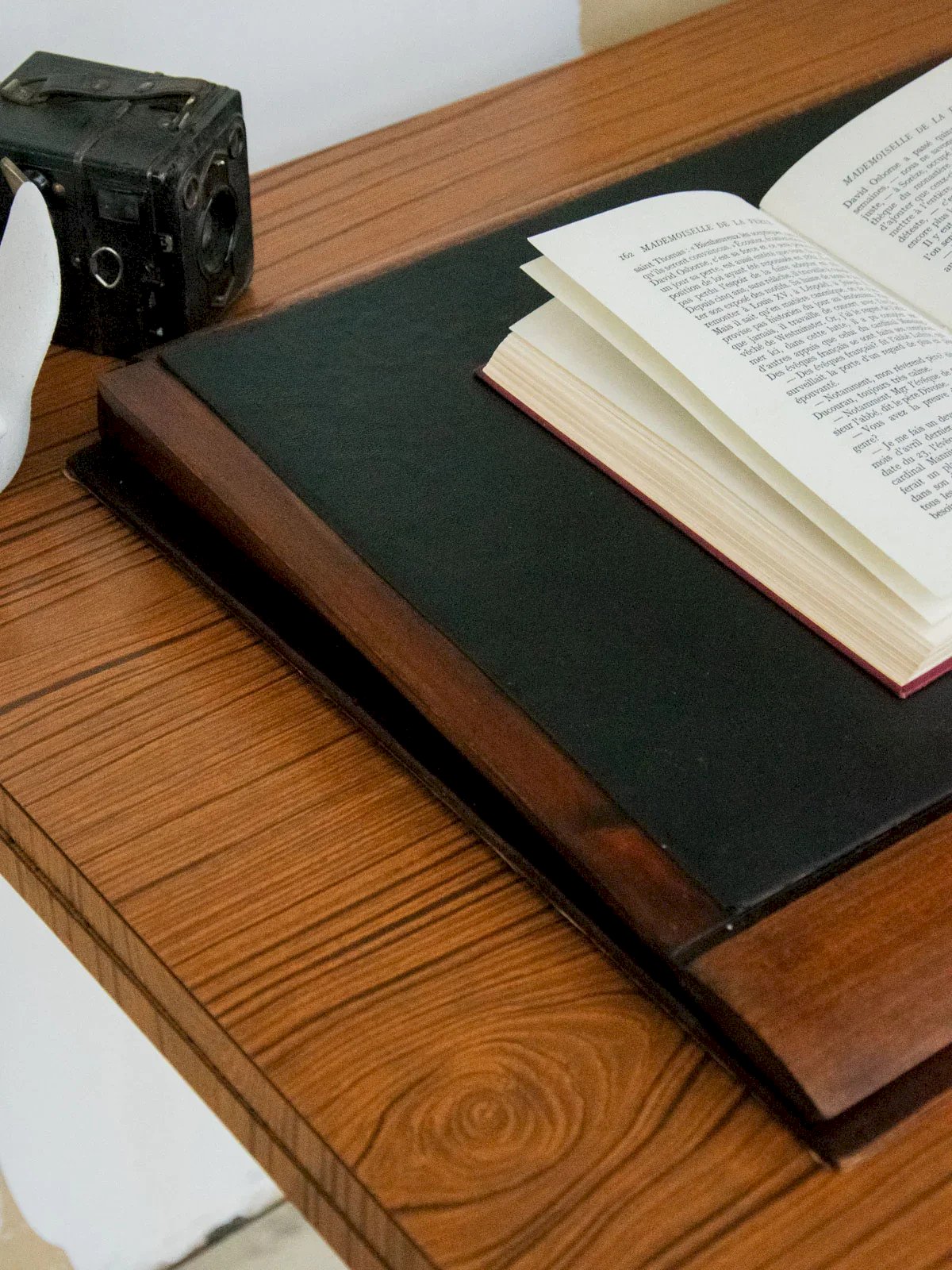 Bring to the office this dark wood and black leather desk pad, featuring a convenient flap for storing documents and everyday papers. The combination of smooth leather and deep-toned wood creates a sleek and elegant silhouette, designed to complement a workspace or reception area with distinction. The format offers a structured and protective work surface, blending the tactile comfort of leather and the sturdiness of wood. Some signs of wear on the inside, slightly warped wood. Length: 55 cm Width: 41.5 cm Height: 5.5 cm Total length when unfolded: 77 cm Condition: Used: An item that has been used. The item shows some superficial signs of wear, ...Used: An item that has been used. The item shows some superficial signs of wear, fully operational and functioning correctly. It may be a display model or a returned item after a short period of use. Possible imperfections. Brand: Debongout Type: Thrifted Product Material: Wood, Leather Style: Country