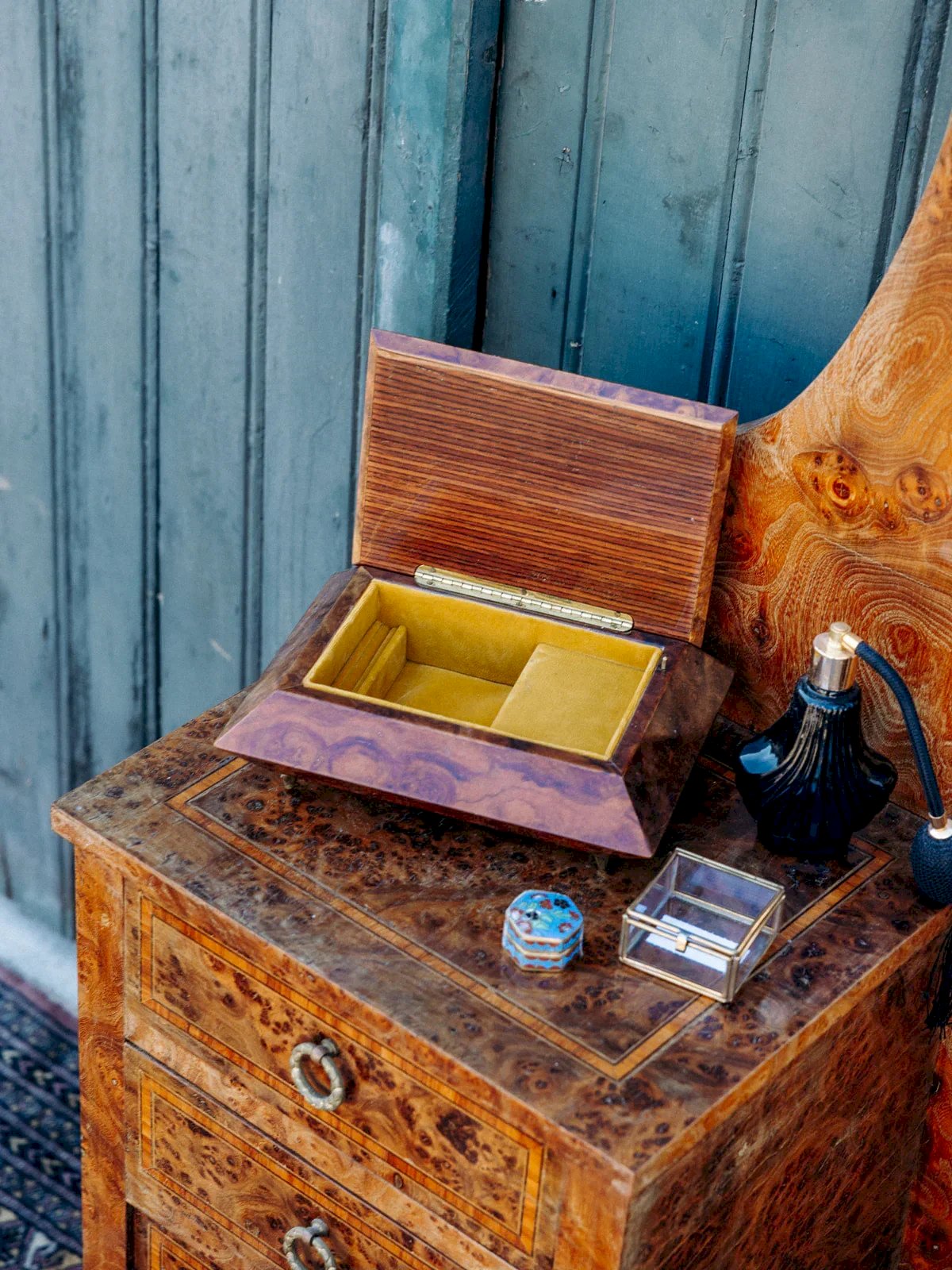 Discover our elegant lacquered wooden jewelry box, a refined accessory to organize and protect your treasures. Its yellow velvet interior adds a touch of softness and luxury, while its mini metal feet provide a contemporary note. Its charming feature? A musical function that will accompany your moments of nostalgia with a delicate melody. A true gem to enhance your space and showcase your precious collections. Length: 21 cm Height: 8 cm Depth: 17 cm Condition: Used: Item has been used. Item shows some superficial signs of wear, ...Used: Item has been used. Item shows some superficial signs of wear, fully operational and functioning correctly. It may be a demonstration model or an item returned to the store after a short period of use. any imperfections. Brand: Debongout Type: Thrifted Product Material: Wood, Metal Style: Country