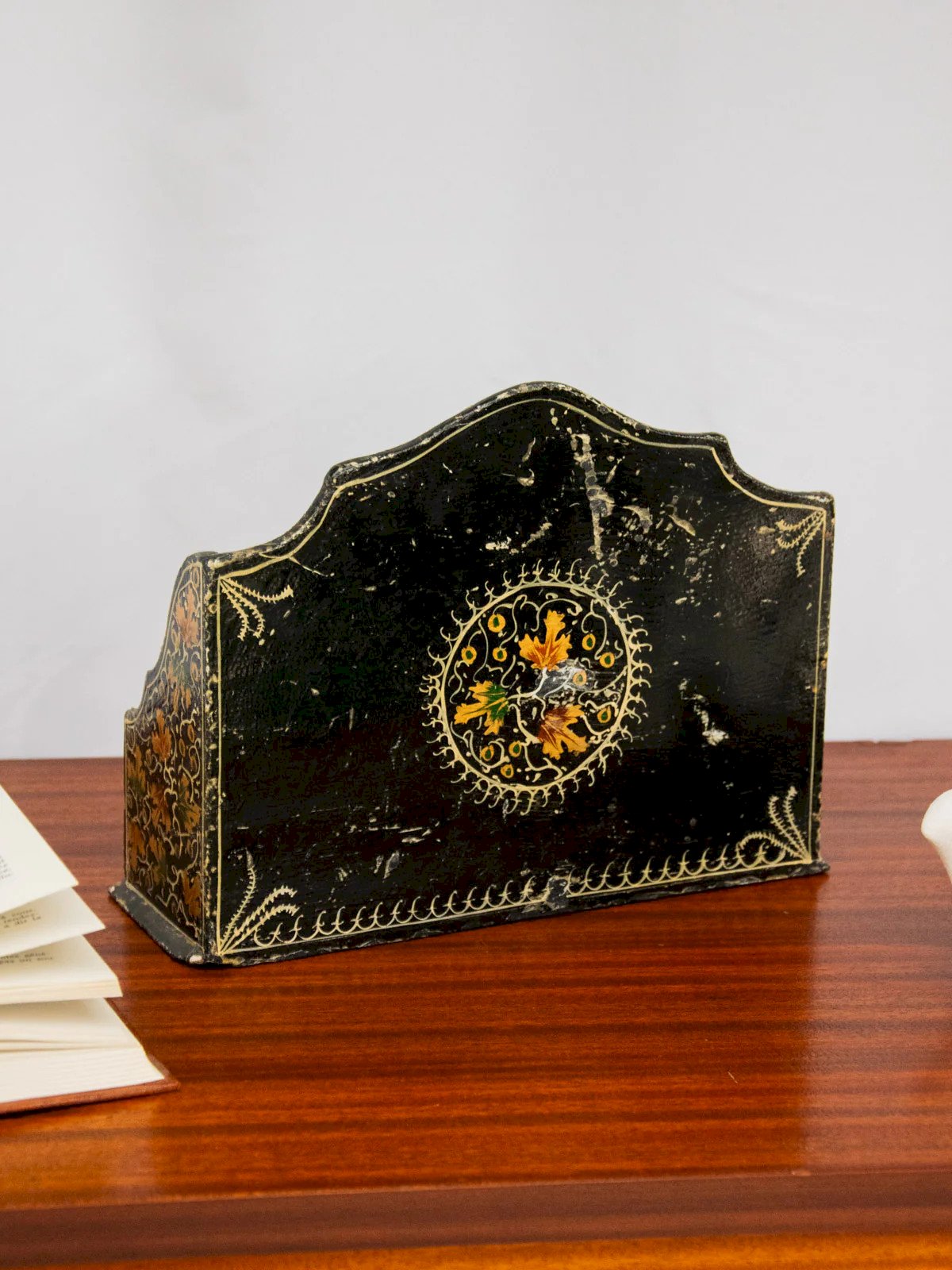 Bring a touch of vintage elegance to your office with this wooden letter organizer adorned with a delicate floral pattern and fine gilding; designed to organize letters, papers, and small items, it combines functionality and aesthetics, with proportions allowing for easy storage without weighing down the space. Its patina tells a story and sets up a refined retro atmosphere, ideal for an entryway or placed on a desk. Chipped paint, small nicks, and signs of time. Length: 26 cm Width: 9 cm Height: 20 cm Compartment gaps: 2 and 4.5 cm Condition: Used: Item that has been used. Item showing some signs of superficial wear, fully operational and functioning correctly. It may be a demonstration model or an item returned to the store after a short period of use. any possible imperfections. Brand: Debongout Type: Vintage product Material: Wood Style: Country.