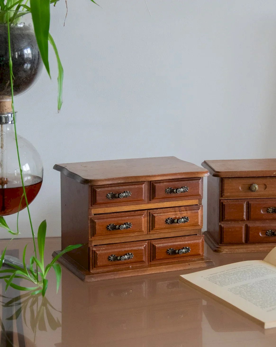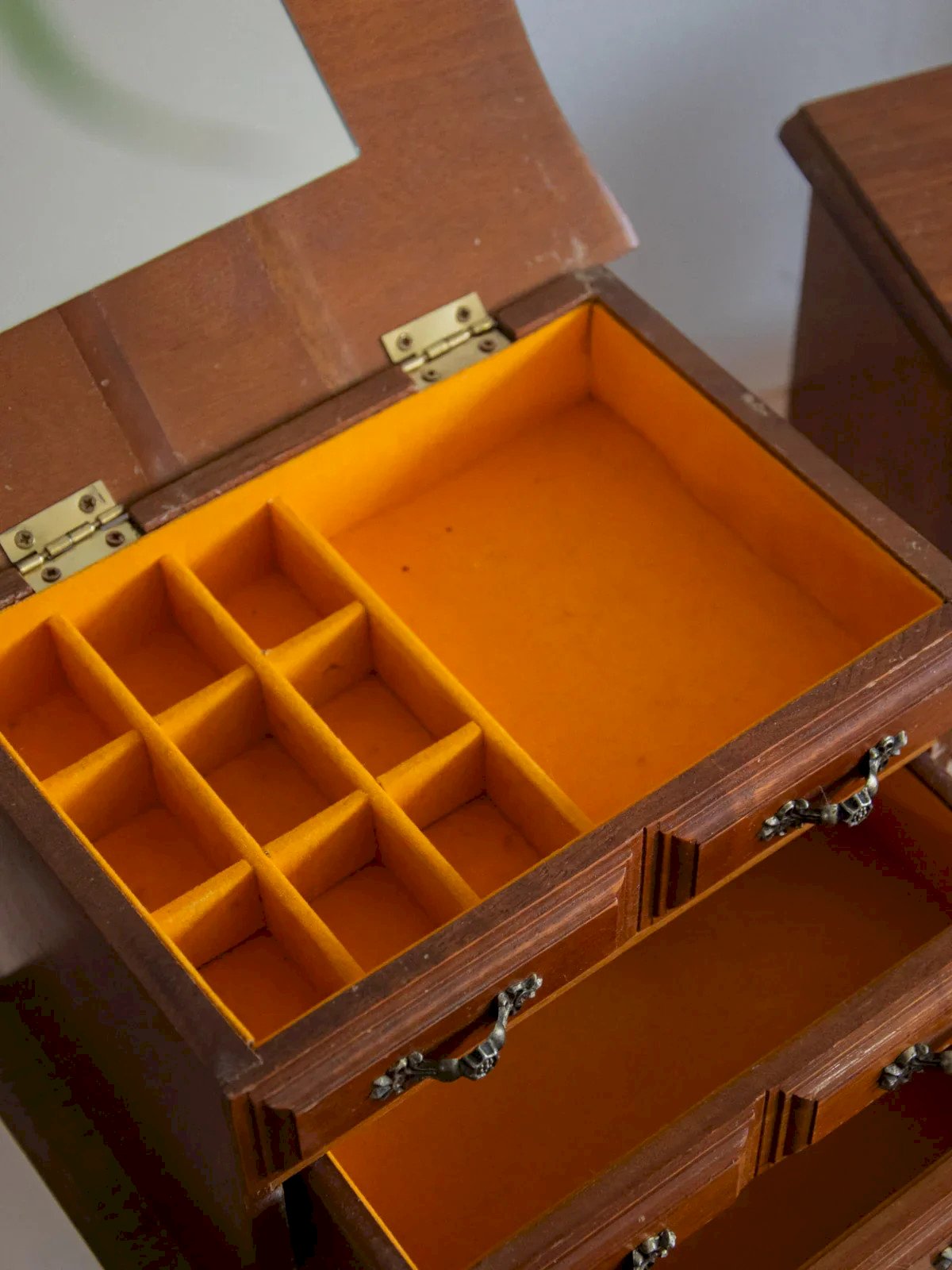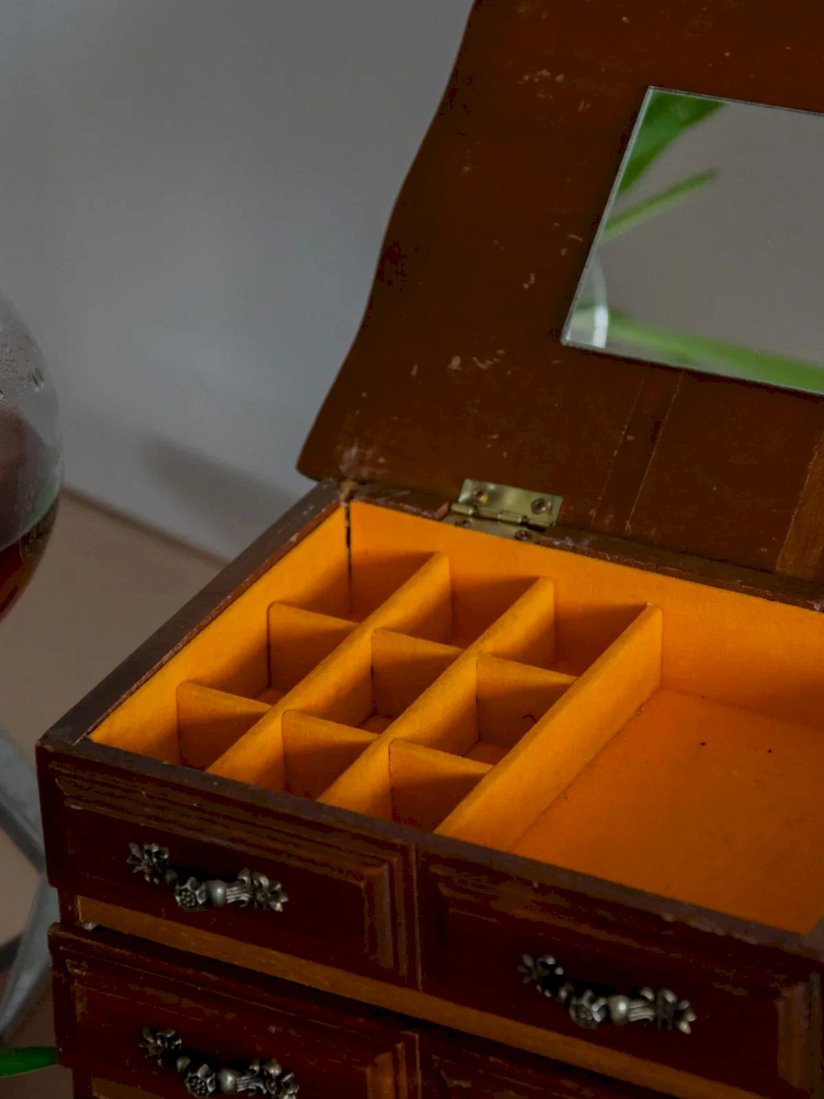 Discover this charming little storage box, perfect for elegantly keeping your jewelry. Its pretty details with metallic handles add a touch of sophistication, while the flap-opening tray, featuring a small integrated mirror, makes accessing your precious treasures easy. With a dedicated compartment for jewelry and two practical drawers, this box offers both style and functionality. The signs of time give it a unique character and exceptional charm. Length: 22 cm Width: 15.5 cm Height: 15.5 cm Drawer height: 3 cm Condition: Used item with some superficial wear marks, fully operational and functioning correctly. It may be a display model or an item returned to the store after a short period of use, with possible imperfections. Brand: Debongout Type: Vintage product Material: Wood, Metal, Glass Style: Country