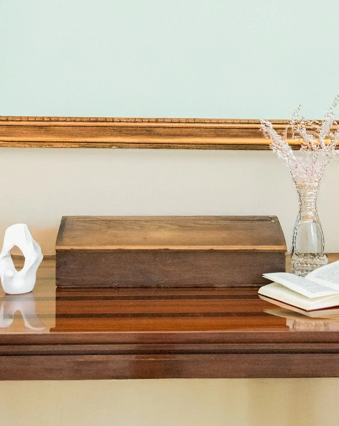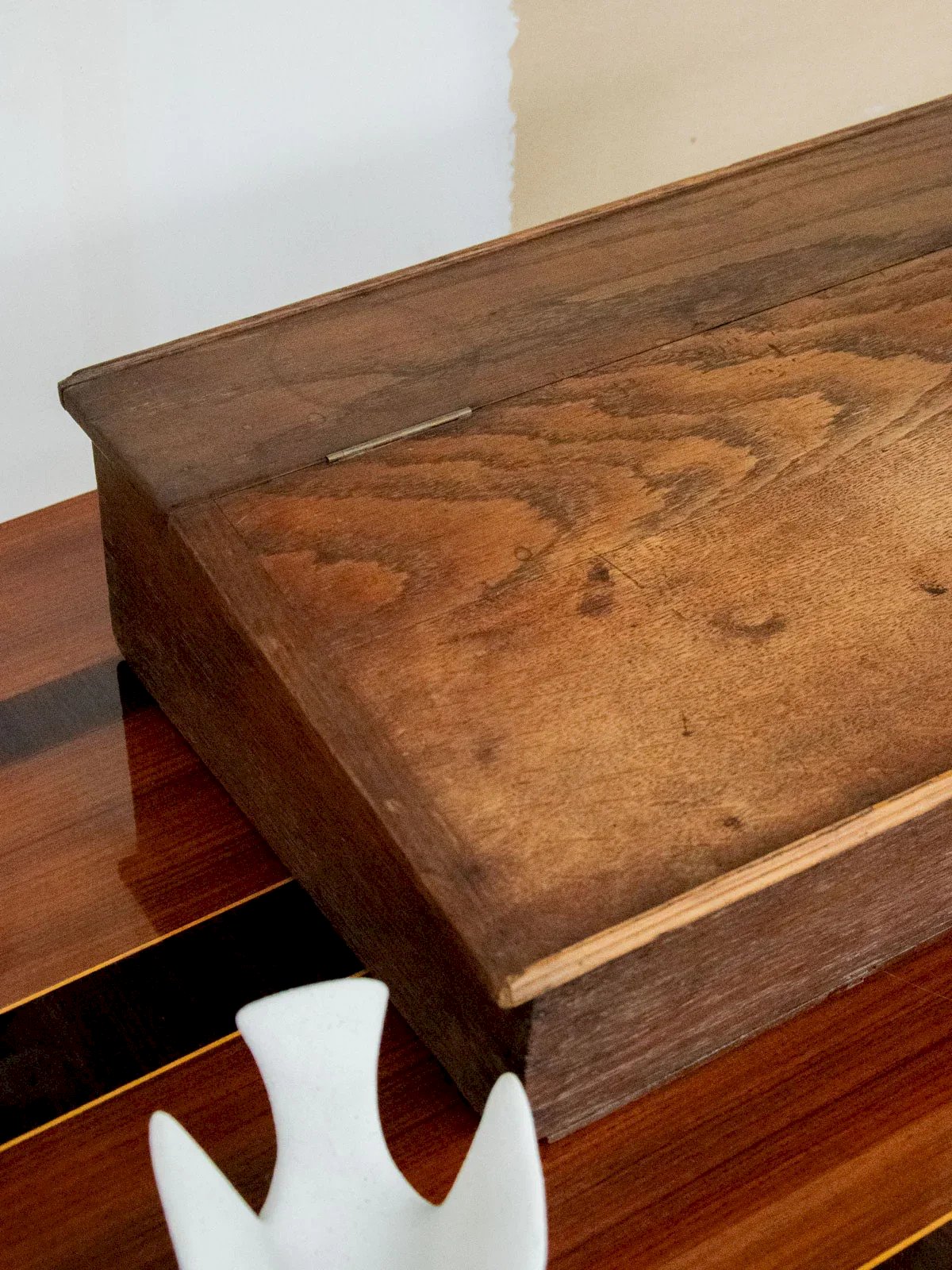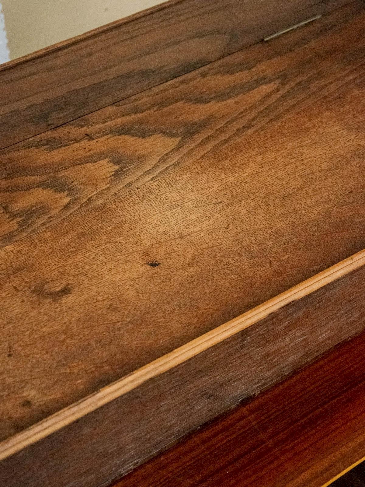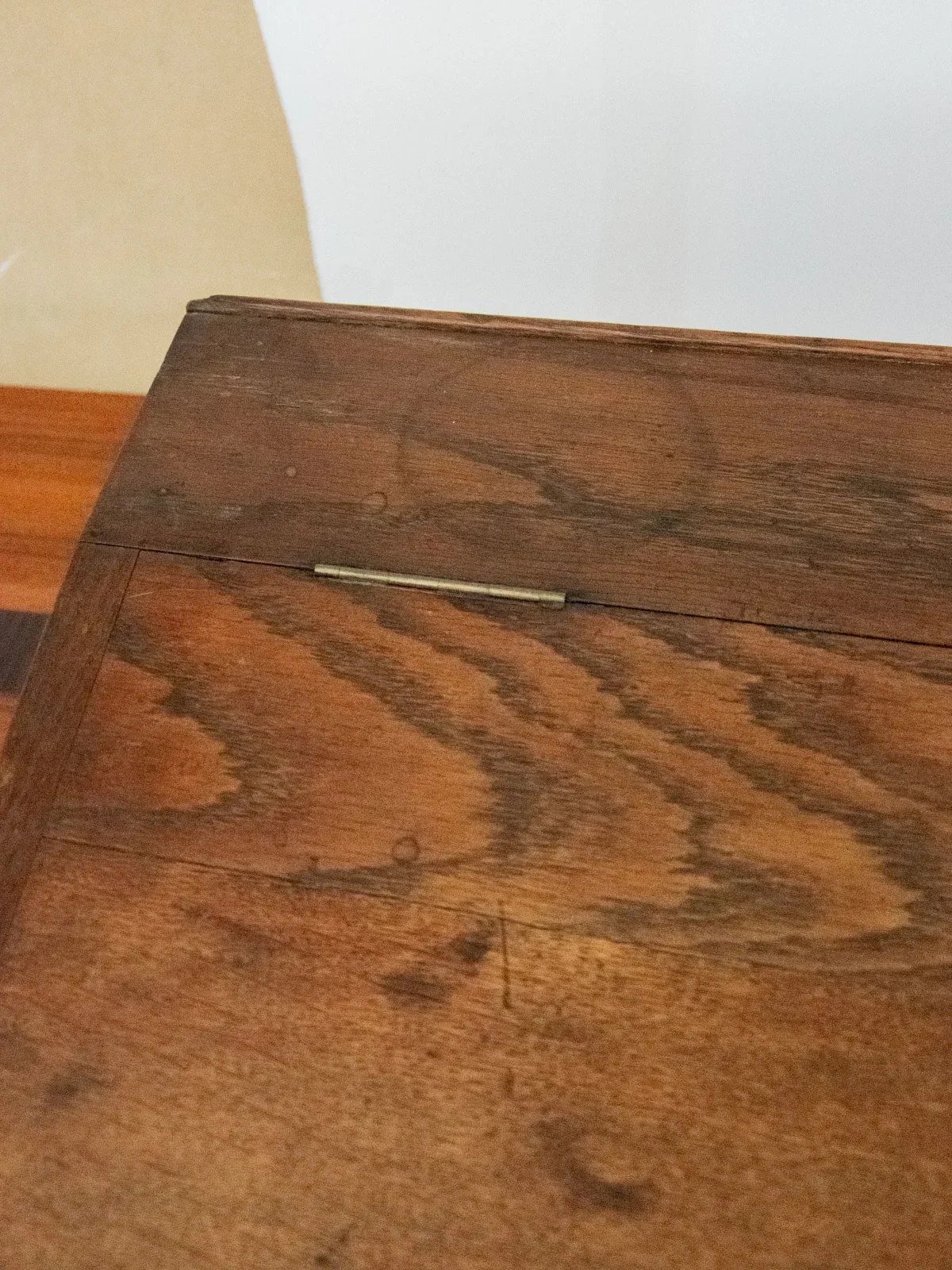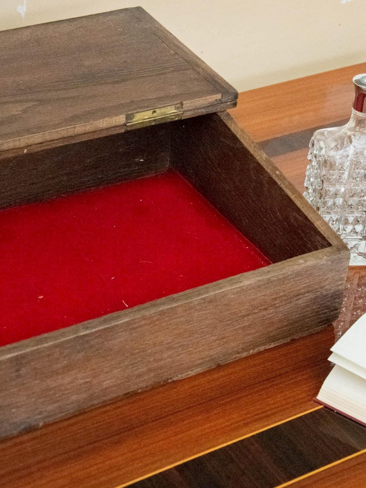 Enhance your office with this dark wood writing desk, a mini flap desk with discreet charm and compact lines; it stands out with a sober and elegant presence. Its flap opens to reveal a red fabric interior, providing a neat space to store documents and correspondence while adding a warm touch. With contained proportions, it easily fits into a corner office or an entryway, combining practicality with a refined atmosphere. Some signs of wear are present. Length: 62 cm Width: 34.5 cm Height: 15.5 cm Interior dimensions: Height: 8.5 cm Interior width: 30.5 cm Interior length: 57 cm Condition: Used: Item has been used. Item shows some superficial signs of wear, fully operational and functioning correctly. It may be a demonstration model or a returned item after a short period of use. any imperfections. Brand: Debongout Type: Curated product Material: Wood, Fabric Style: Country