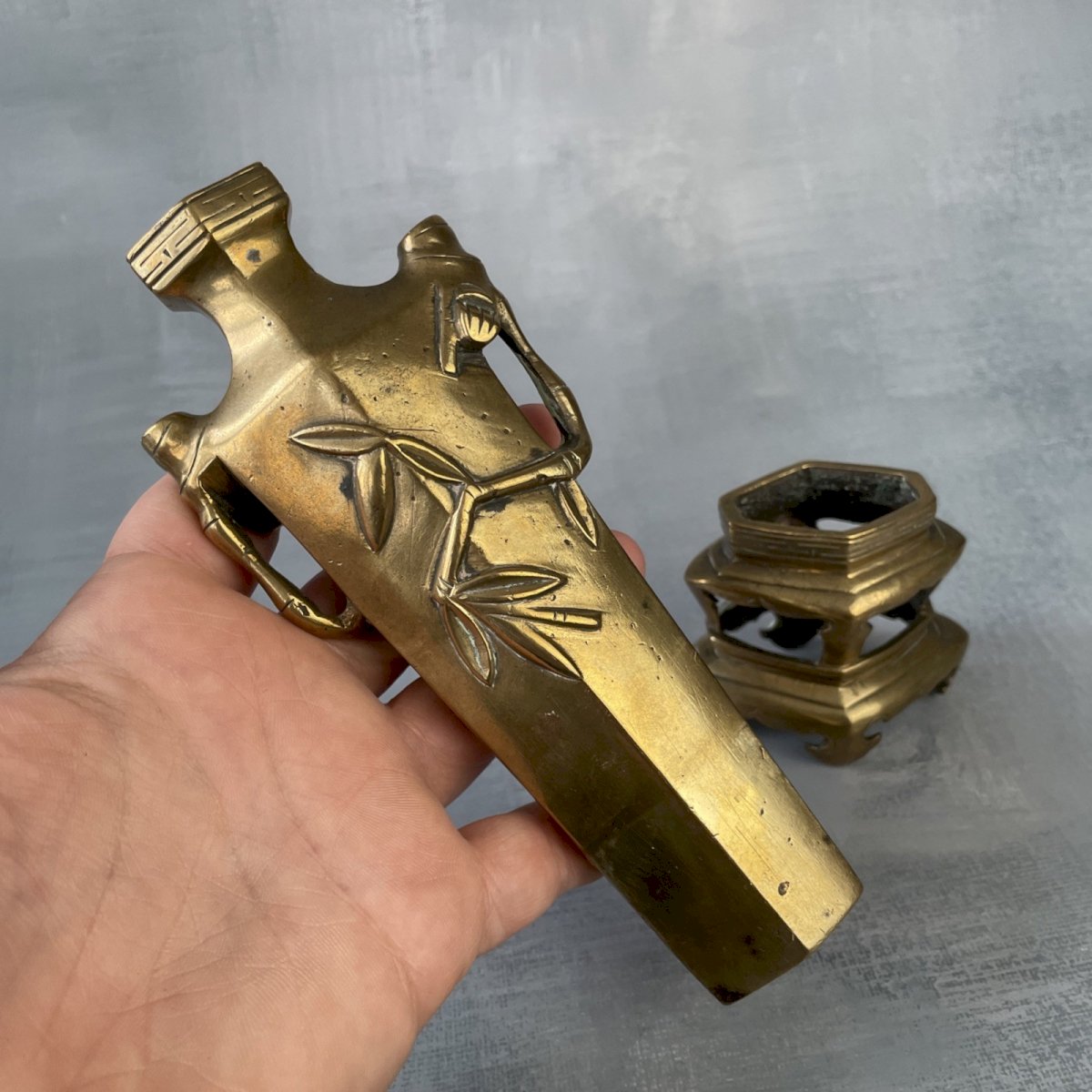 Asian art, Japanese? Chinese? Antique small bronze vase with bamboo decoration, removable base, 19th 20th? ~18cm Height with base ~ 18 cm Height of base ~ 6 cm Height of vase ~ 16 cm Weight ~ 0.33 kg A manufacturing defect on the vase, see photos. Consider grouping your purchases to reduce shipping costs! Origin: Asia Subtype: Vase Material: Bronze Country of origin: China