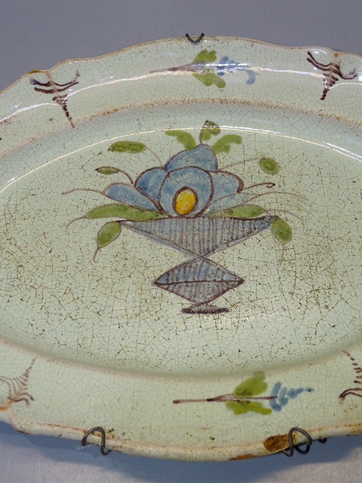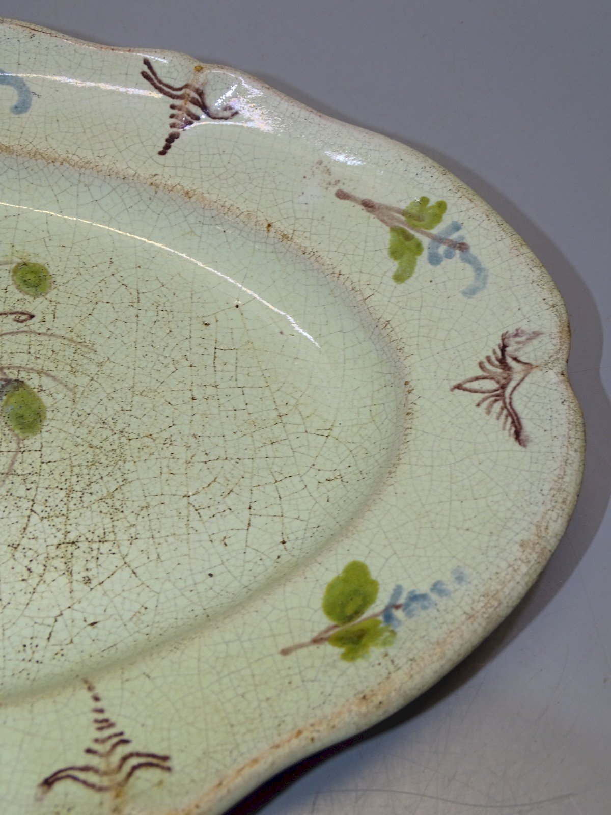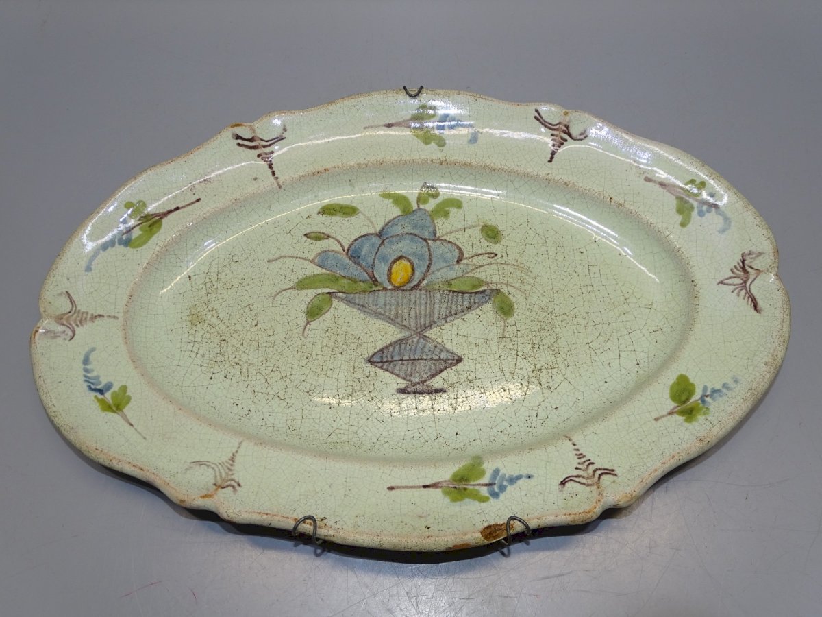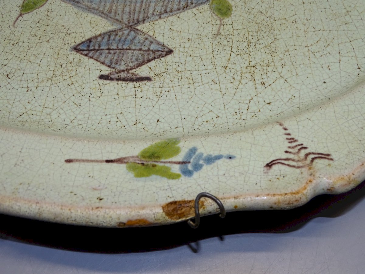 Antique black-bottomed plate from the 18th/19th century - with a chip on the edge, small enamel flakes on the back, signs of use and blackened crazing - not flat when laid down (see photos) - In good usable condition, found in an attic - Ref: 1V251219/40 - 35.3 x 23.5 cm - Weight 1.119 kg - For any questions: SHIPPING POSSIBLE VIA MONDIAL RELAY or COLISSIMO upon request, VERY GOOD PACKAGING GUARANTEED. THANK YOU for CAREFULLY LOOKING AT ALL the PHOTOS as THEY ARE AN INTEGRAL PART of the DESCRIPTION and ALLOW YOU TO SEE the ITEM BEST with ITS SMALL POSSIBLE DEFECTS.