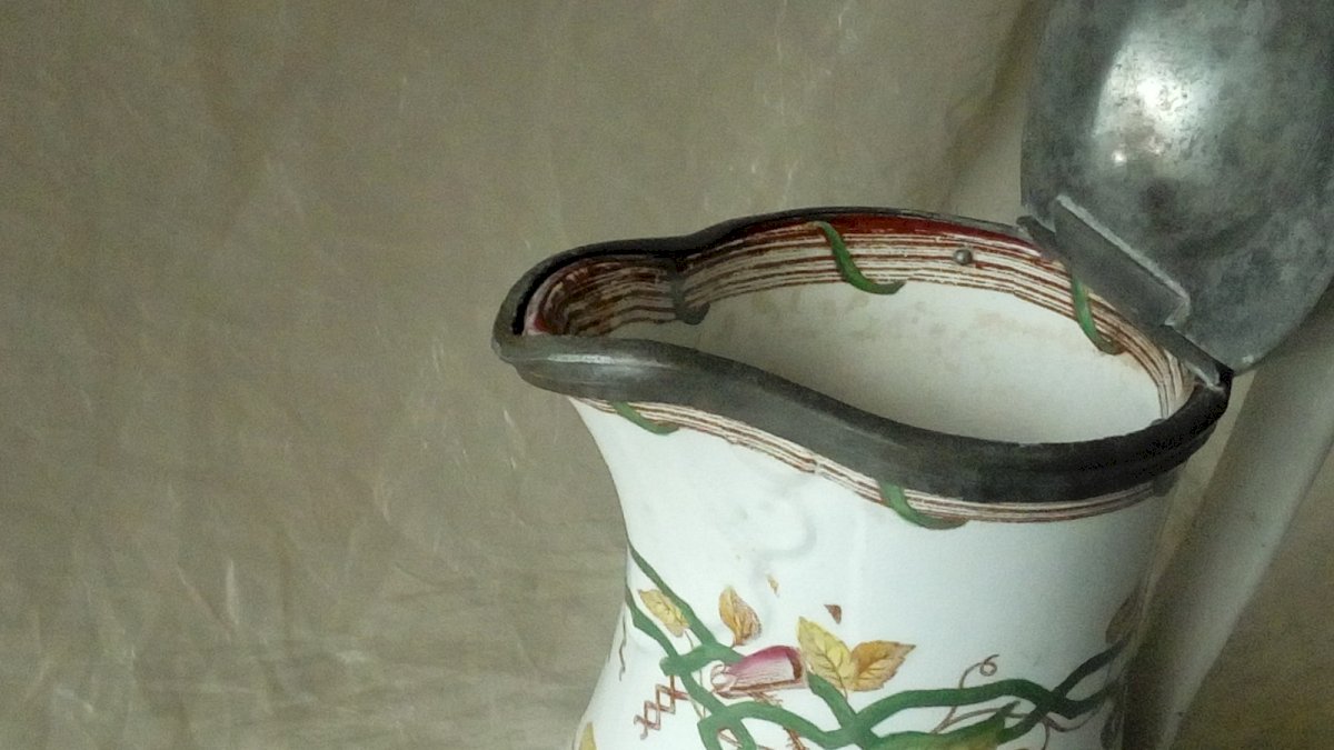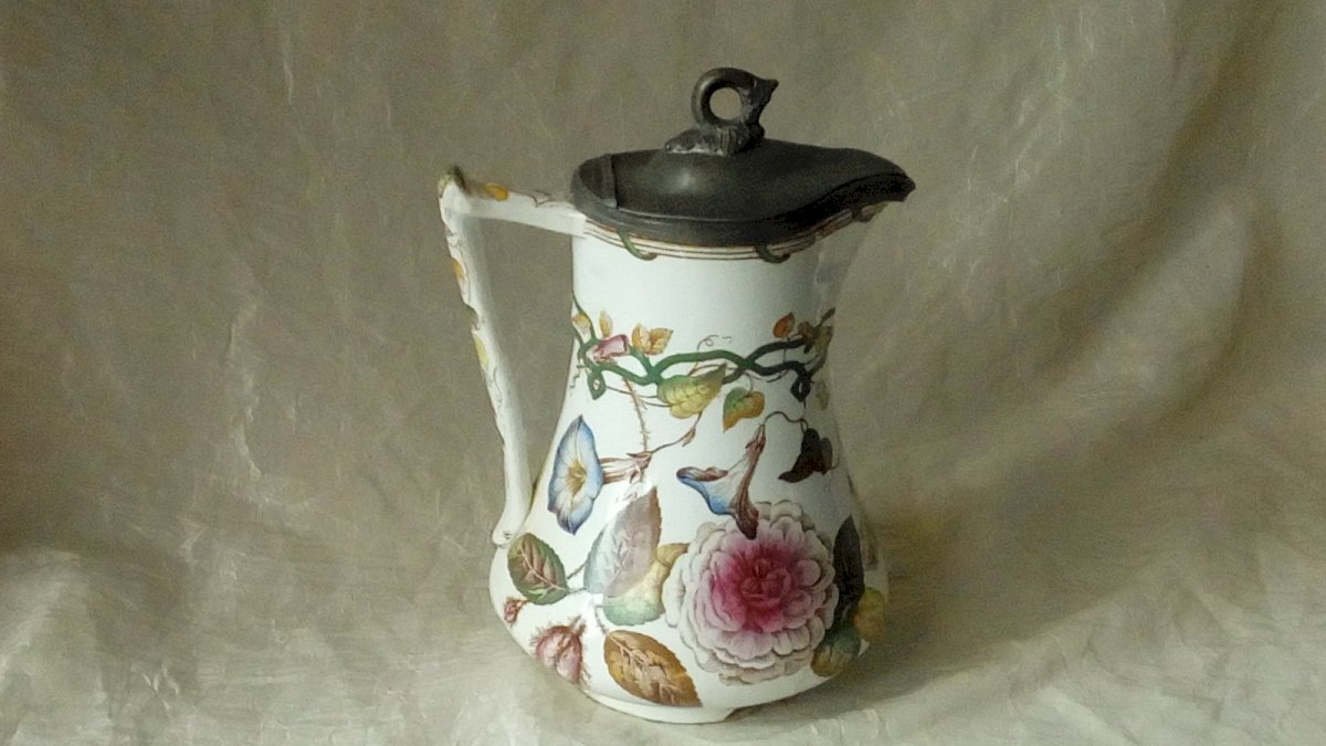 ANCIENT CERAMIC PITCHER WITH FLORAL DECORATION WHITE METAL OR TIN LID SIGNED CHISWICK ORIGIN ENGLAND LATE 19TH CENTURY HEIGHT 18 cm WIDTH 12 cm DIAMETER 7 cm CHIPS ON THE BASE VISIBLE IN PHOTOS NO CRACK Authenticity: Original Type: Tableware, Kitchen Brand: CHISWICK Origin: England Sub-type: Pitcher Material: Ceramics Style: Napoleon III