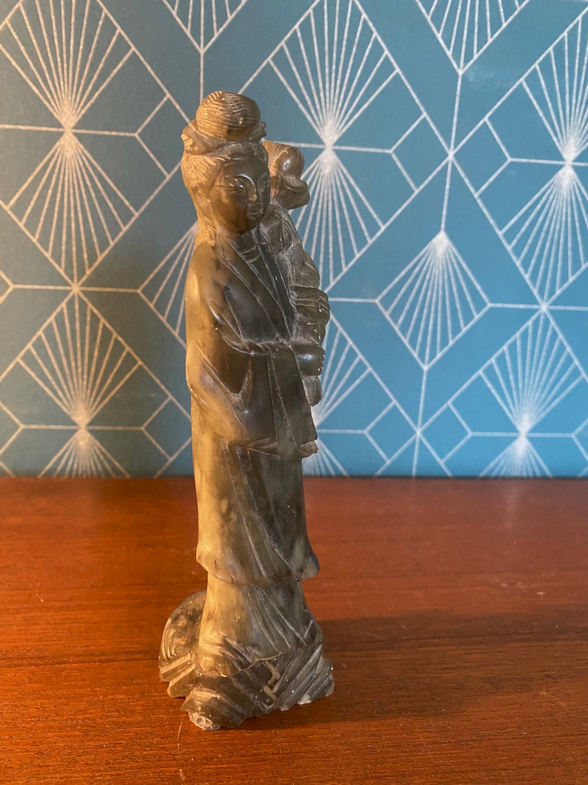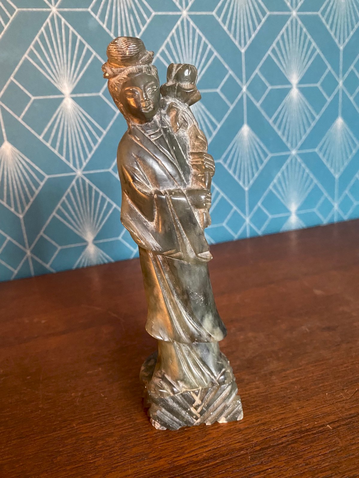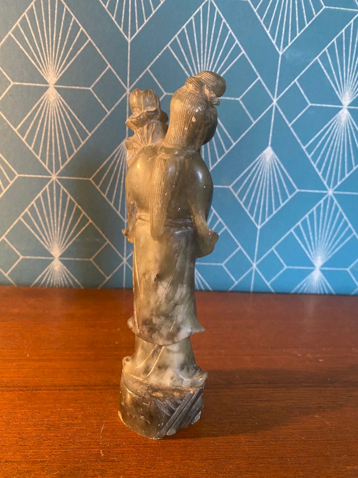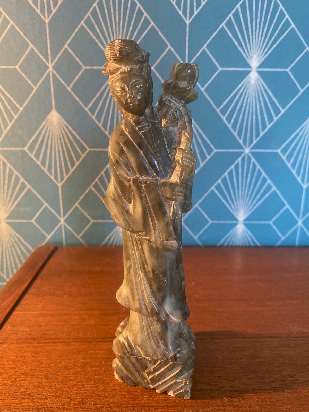 Subject made of hard green stone, carved, depicting a goddess on a pedestal holding flowers. Early 20th century, it stands 18cm tall. Very good condition. Great deal.