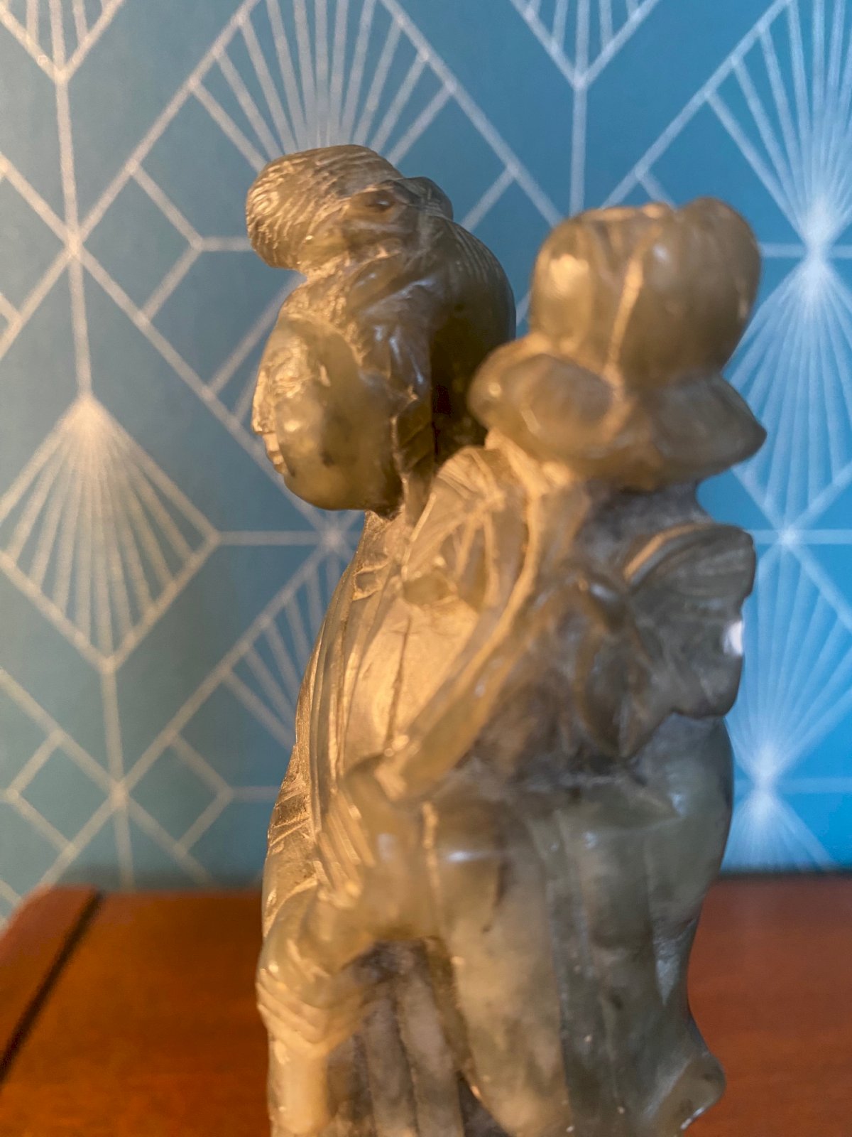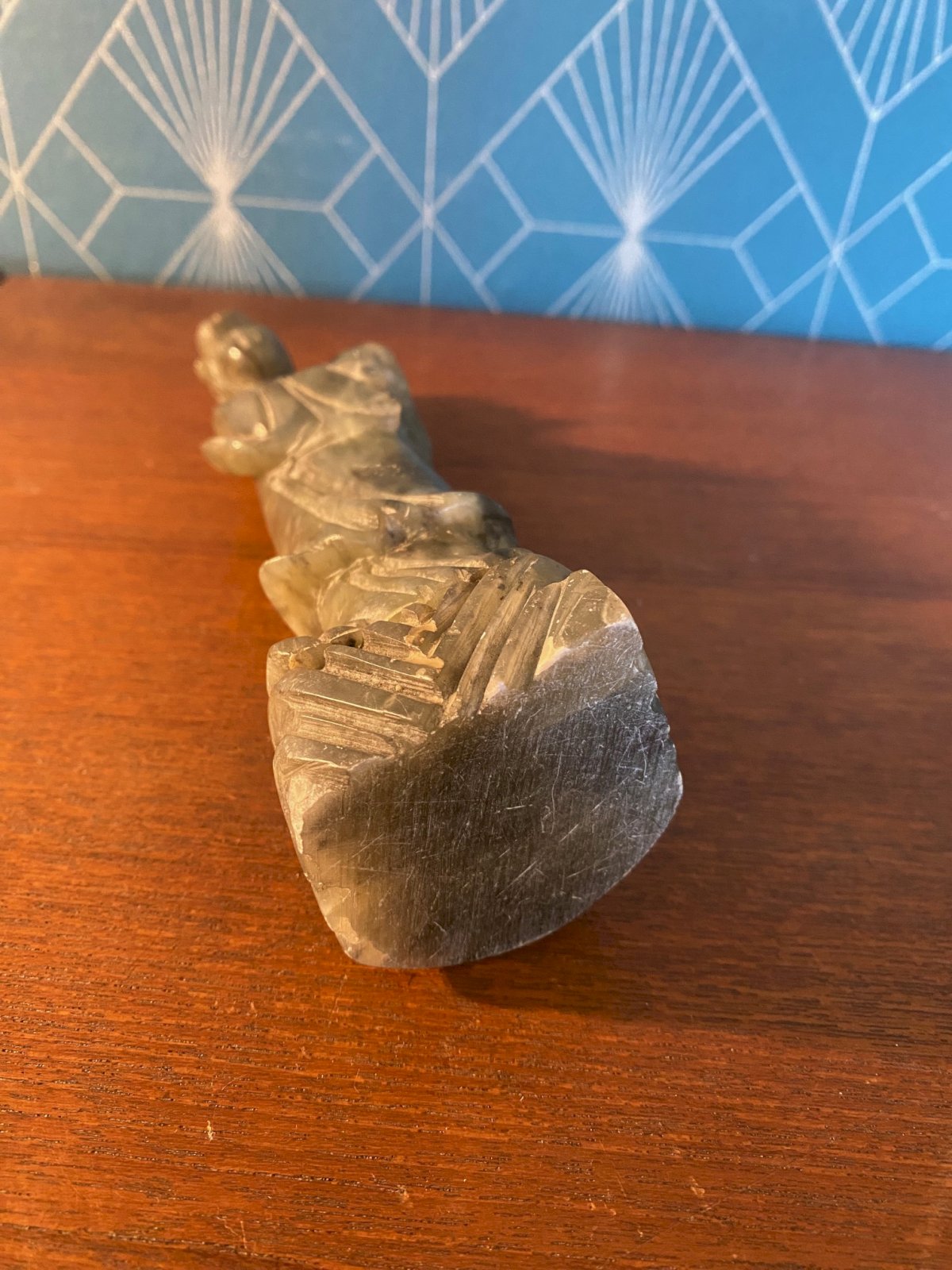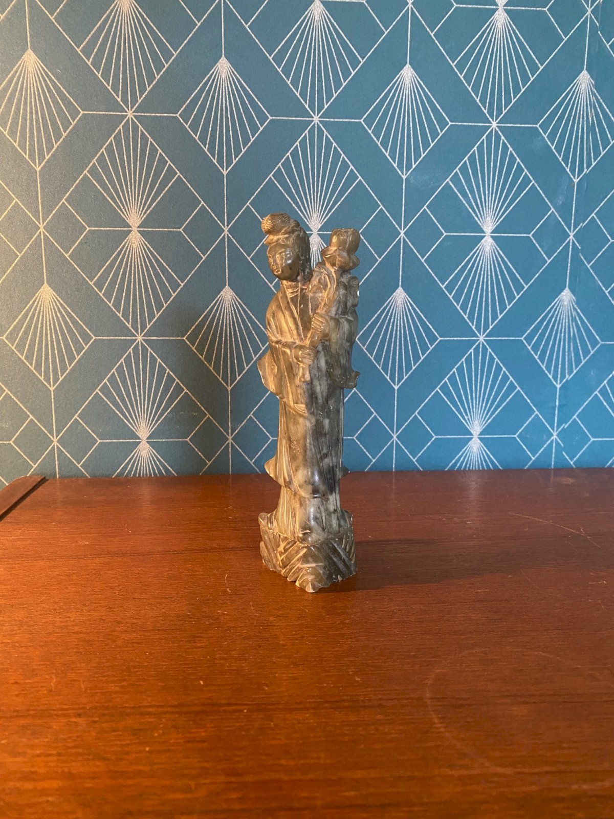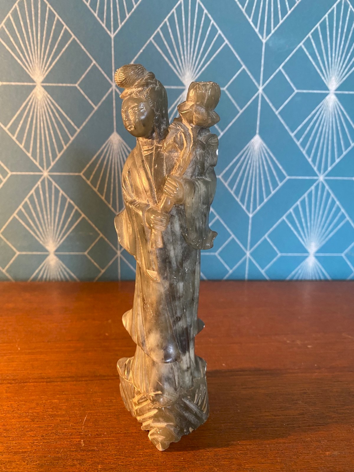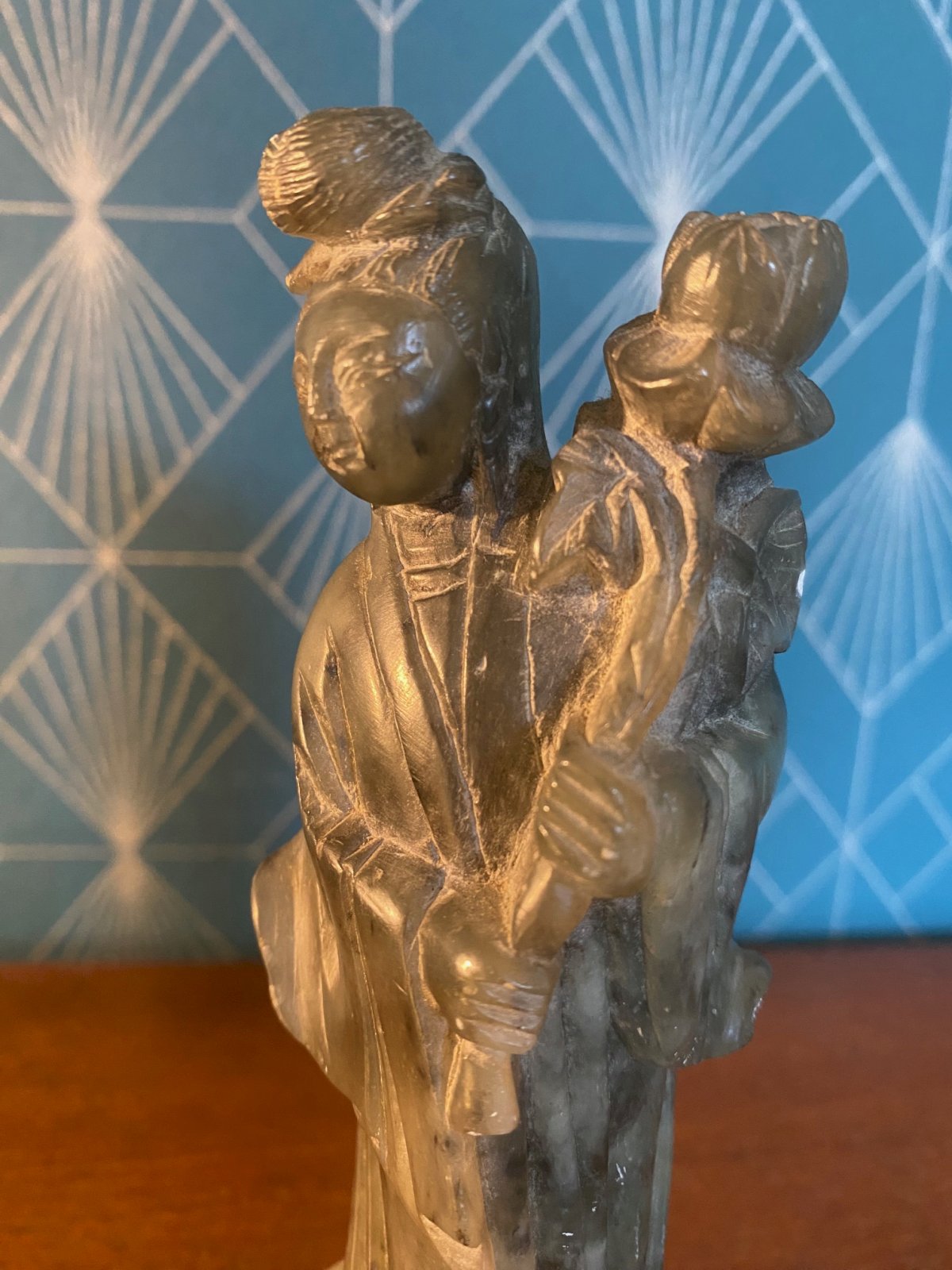 Subject made of hard green stone, carved, depicting a goddess on a pedestal holding flowers. Early 20th century, it stands 18cm tall. Very good condition. Great deal.