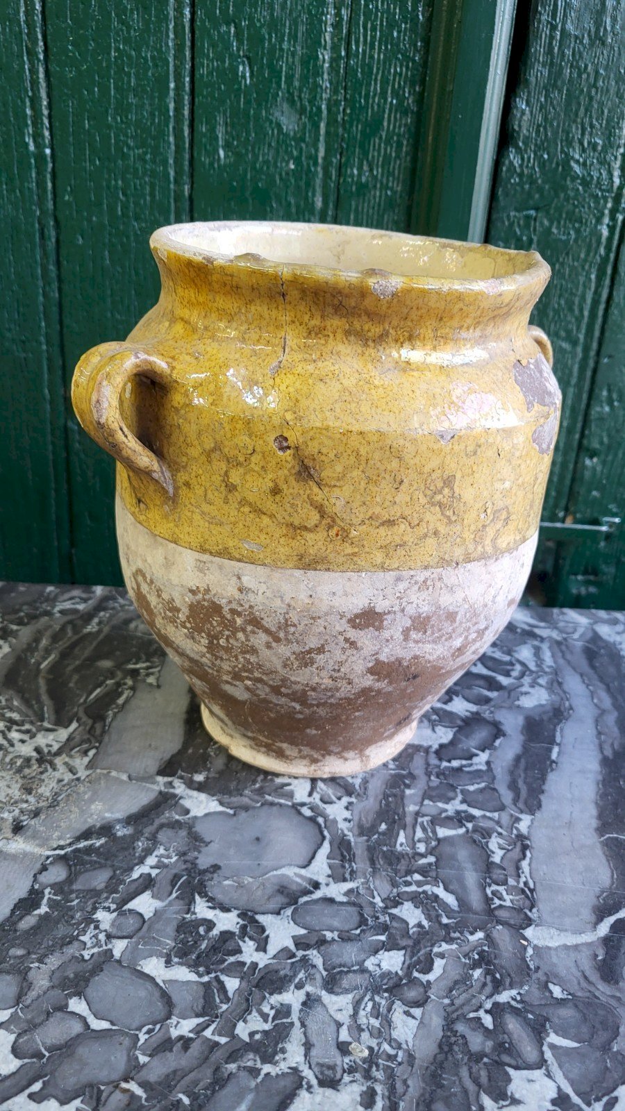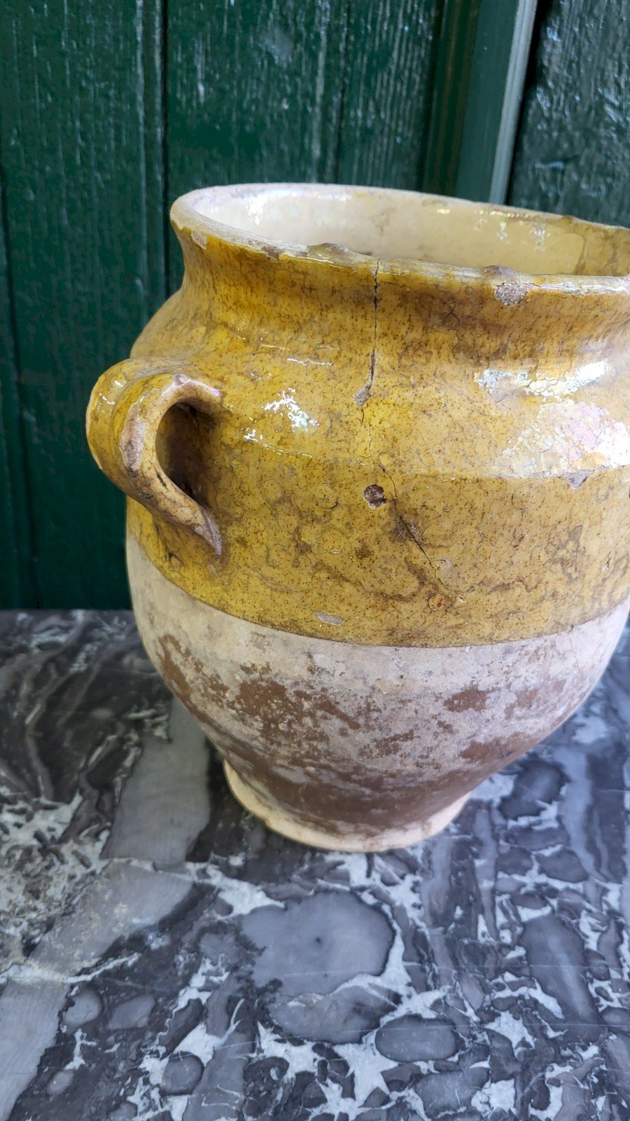 beautiful and antique yellow glazed earthenware confit or fat pot it is in good condition it has a crack on the edge see the photos it measures 22 cm high by 22 cm wide with the handles and 17.5 cm deep Country of origin: Metropolitan France