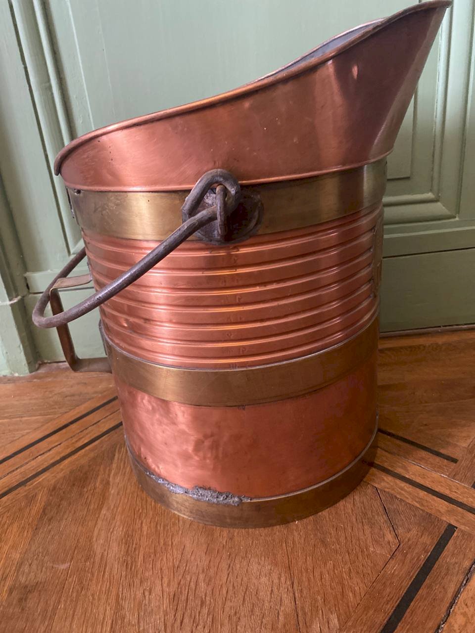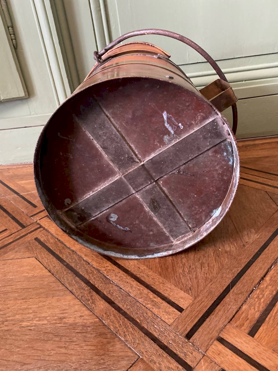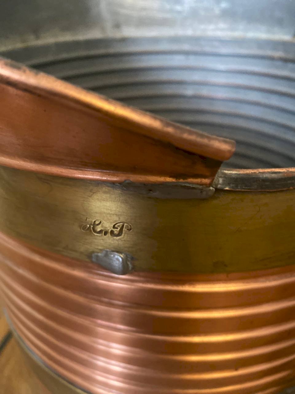 The piece features a robust and utilitarian construction: copper body, brass fittings, riveted iron handle, and a cross-assembled base.