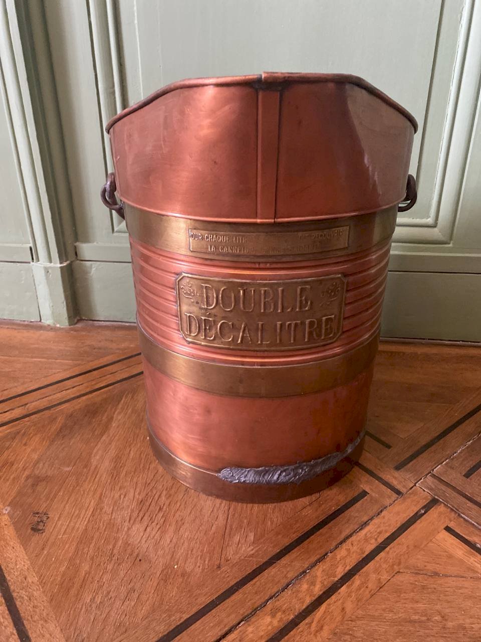 An old measure of capacity in copper, of the double deciliter type, identifiable by the inscription stamped on a brass plate.