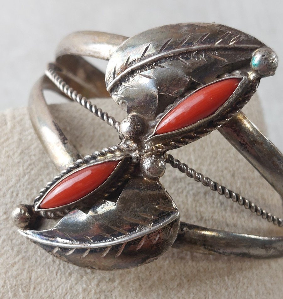 Vintage rigid bracelet / Navajo, leaf and coral decoration, made of silver in good condition, some wear, hallmark stamped head dimensions of leaf decoration 4.5 cm X 2.3 cm, interior dimensions 5.6 cm X 5.2 cm, total weight 26.49 g see photos Check my other items! shipping discount for bulk purchase Condition:Used Item has been worn. possible imperfections. Dominant stone: Coral Metal: silver