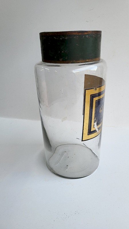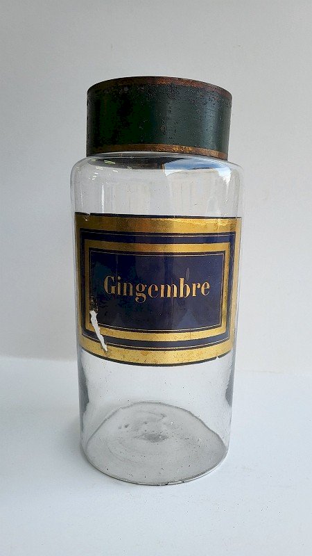 pretty and old glass pharmacy jar "Ginger" it is in average condition the label is damaged and the bottom of the jar has a crack (see photo) it measures 25.7 cm high and 12.5 cm in diameter Type: OLD PHARMACY JAR Country of origin: Metropolitan France