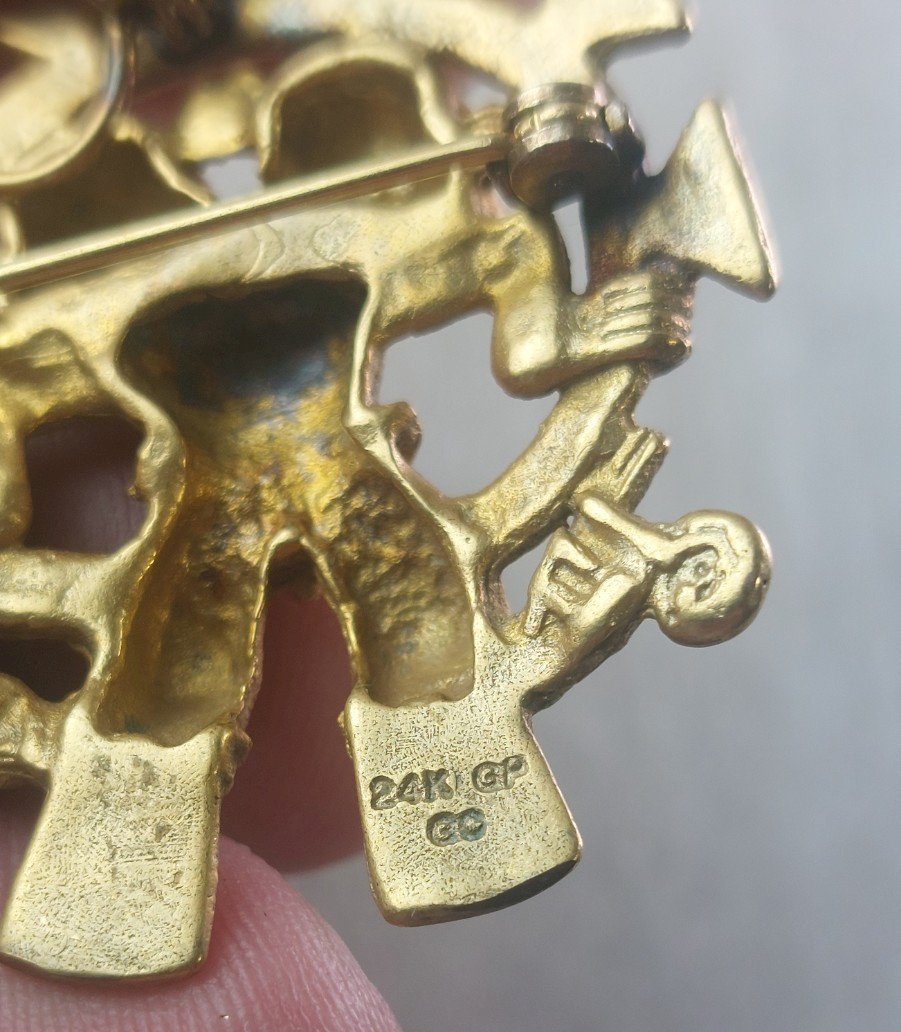 Antique Inca/Aztec/Pre-Columbian decorative brooch/pendant, made of gold-plated metal in good condition marked 24K GP CO, dimensions 3.9 cm X 3.5 cm. See photos. Check out my other items! Reduced shipping fees for combined purchases. Condition: Pre-owned item that has been worn. Possible imperfections.