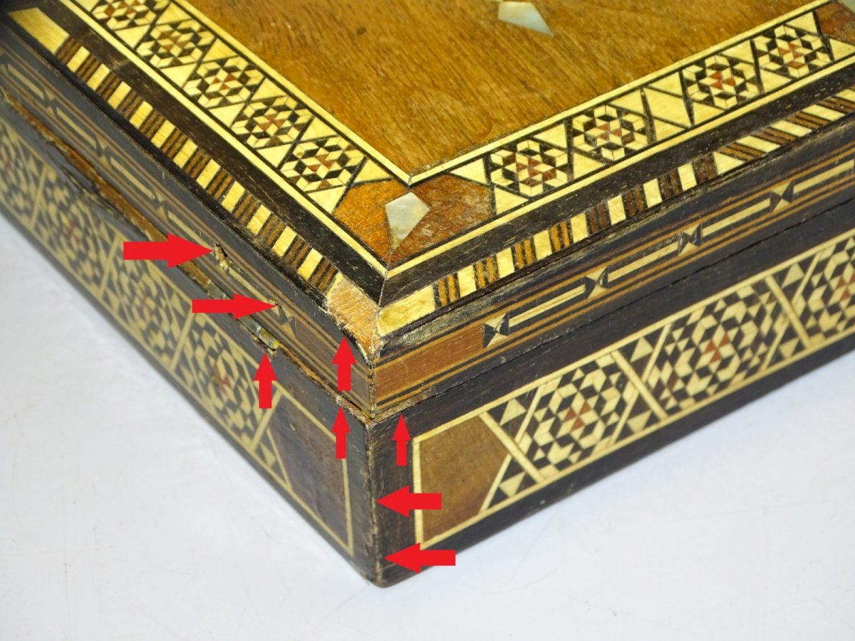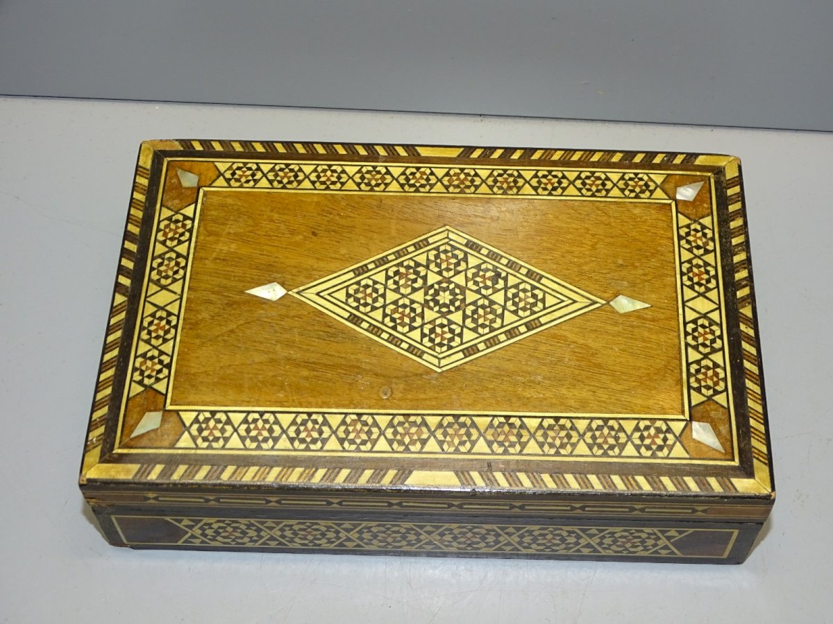 Antique box set, jewelry box with oriental marquetry - with wear on the corners visible in the photos - inner wood edges deformed and red fabric with stains (see photos) - found in an attic - Ref. 1V240718/307 18.3 x 11.8 cm - Height 5 cm - Weight 0.301 kg - SHIPPING POSSIBLE VIA MONDIAL RELAY or COLISSIMO upon request VERY GOOD PACKING GUARANTEED PLEASE take a GOOD LOOK at ALL the PHOTOS as THEY ARE INTEGRAL PART of the DESCRIPTION and ALLOW YOU TO SEE the ITEM BEST with ITS POSSIBLE SMALL DEFECTS -