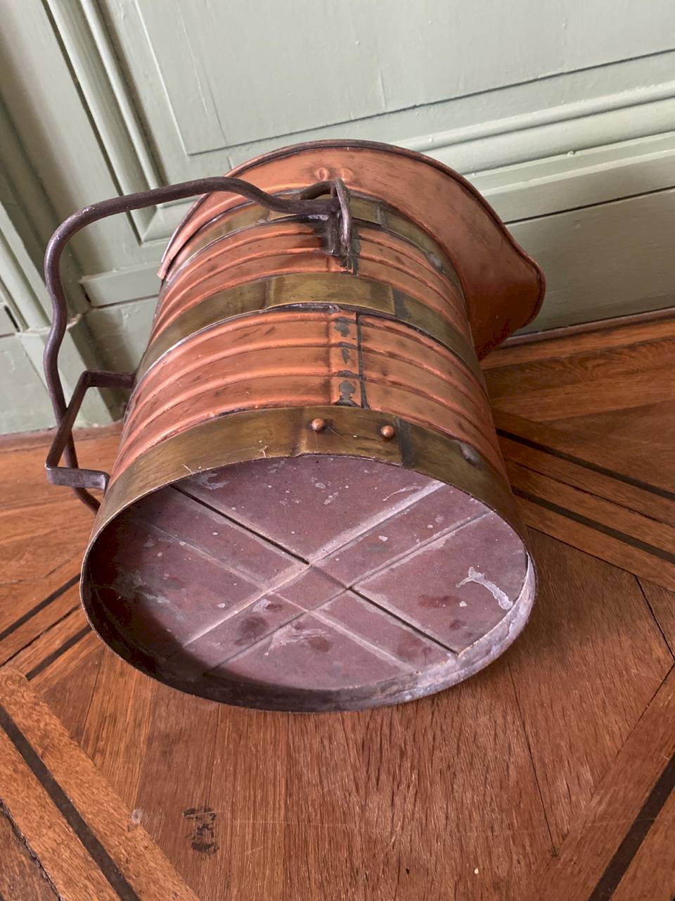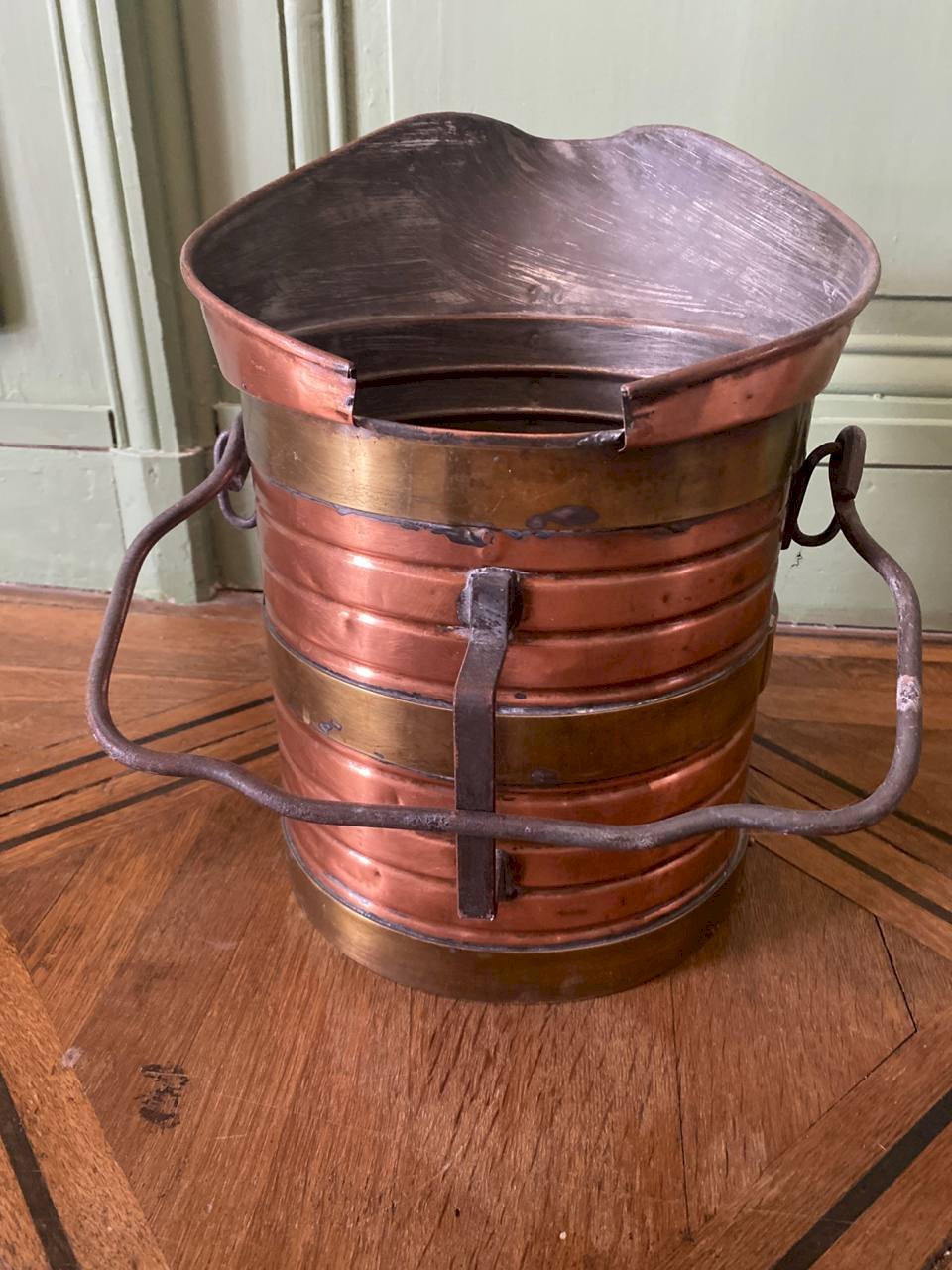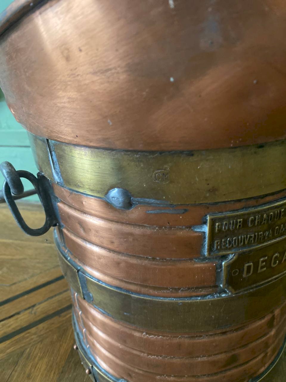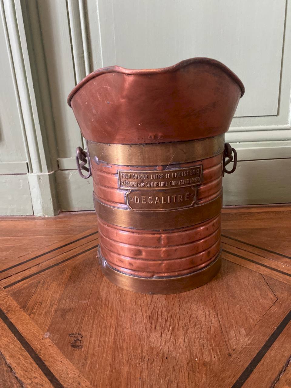 An old capacity measure in copper, of the decalitre type, identifiable by the engraved plaque and visible markings on the body. The piece features a utilitarian and robust construction: copper body, riveted brass bands, iron side handles, and a cross-assembled bottom. The shape with a spout corresponds to the measuring instruments used in a professional context, for repeated and controlled use. The interior is tinned, still visible, indicating a use intended for liquids or goods, in accordance with the practices of the time. The inscriptions and markings attest to a regulated measuring object. The patina is old, marked by time and use, without recent cleaning or intervention. The visible traces are an integral part of the object and testify to its past function.