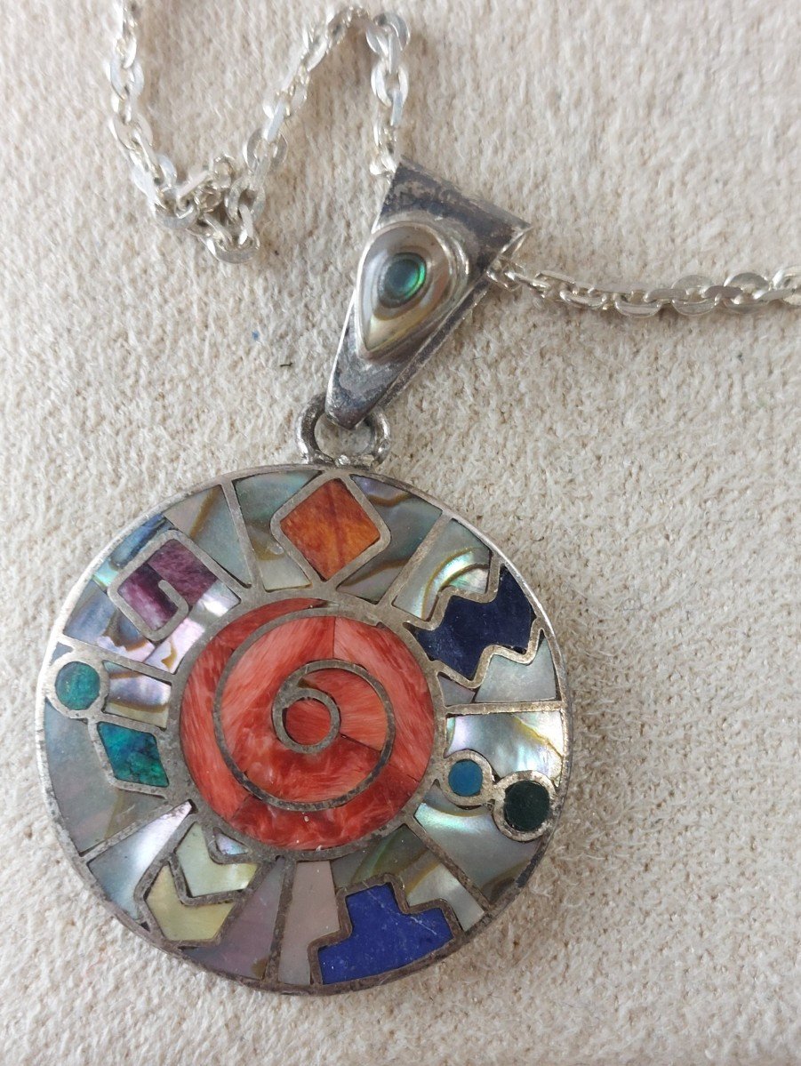 Old necklace with pendant, Peruvian/Inca calendar, silver in good condition pendant marked 950, necklace marked 925 pendant diameter 2.4 cm necklace length 44 cm weight 9.96 g see photos Check my other items! discount on shipping costs for combined purchases Condition:Used Item has been worn. any imperfections. Metal purity:950 parts per 1000 Metal:Solid silver Country of origin:Peru