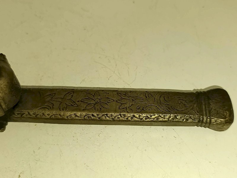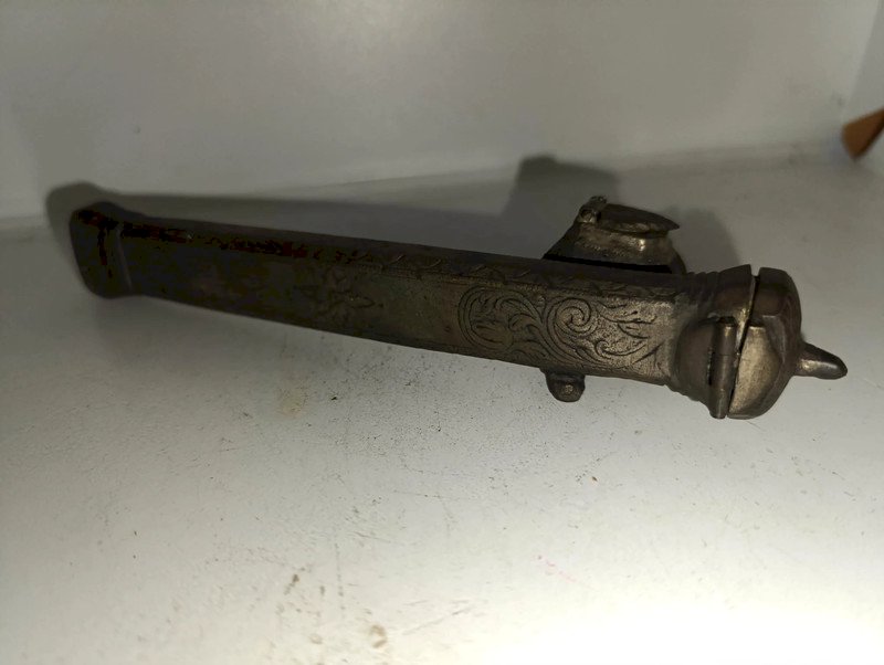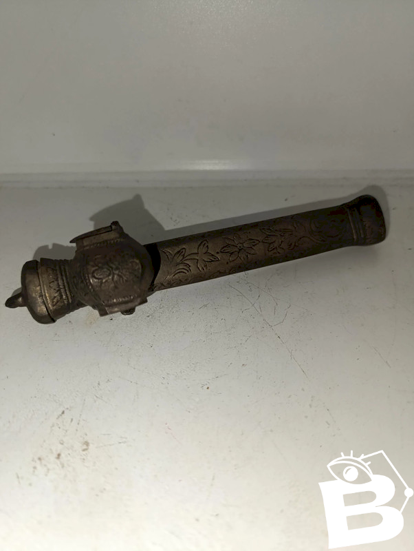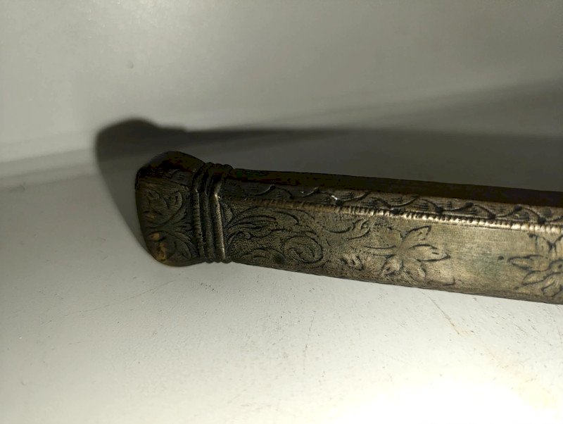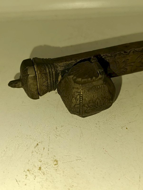 antique Ottoman inkwell made of bronze or brass with floral decoration, in good condition with signs of wear from time, partially faded decoration in some areas, length 18.5 cm...