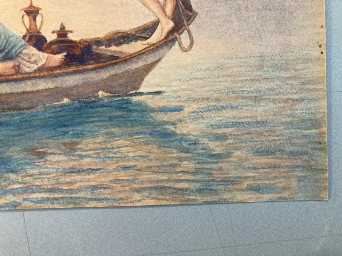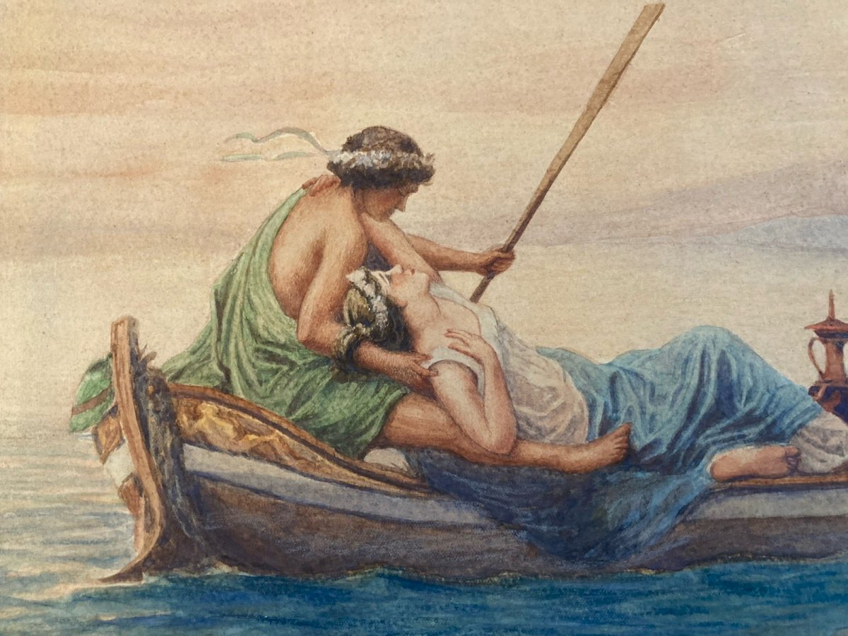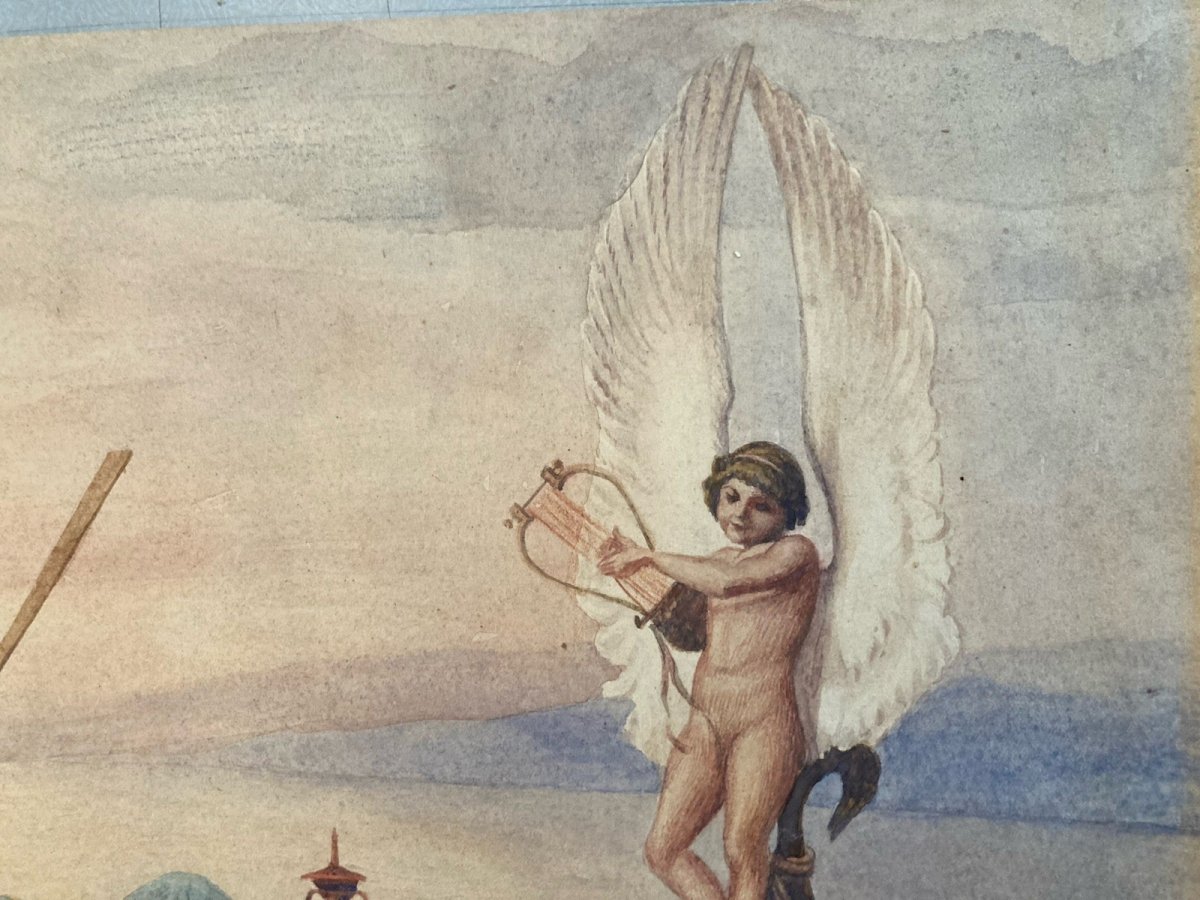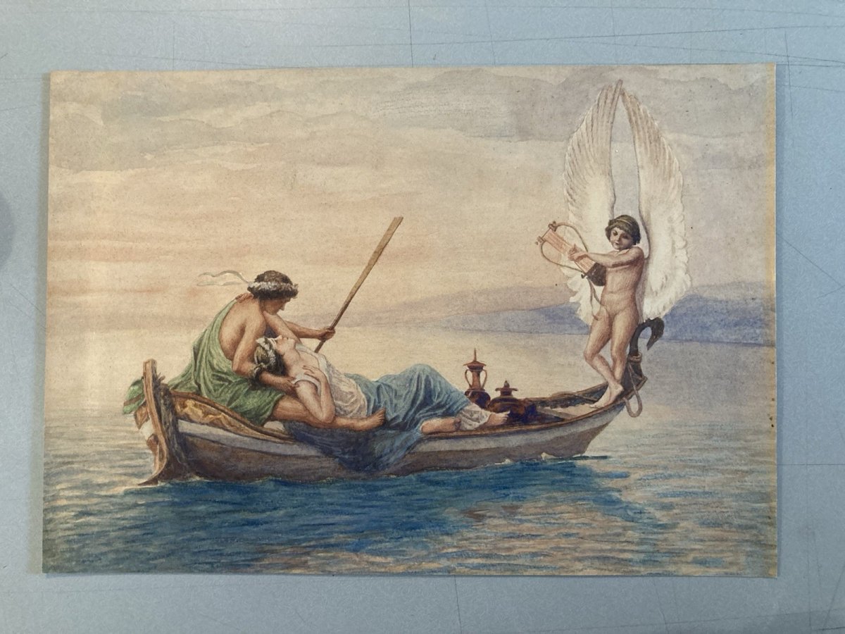 Ancient drawing enhanced with watercolor or gouache, depicting a romantic and poetic scene between two women embraced on a gondola, guided by a Cupid. This work, likely inspired by mythology or classical literature, evokes a timeless and dreamlike atmosphere. The style and subject make it a unique piece, likely to interest lovers of classic art, collectors of romantic scenes, or those in search of works with an LGBT+ theme. The drawing is meticulously crafted, and the details (such as the drapery, the gondola accessories, and Cupid's posture) add a narrative and symbolic dimension to the composition Recommended products Provided by Recommended products Provided by Beautiful 19th Century Painting Gouache Paper Gallant Scene Ancient Romanticism Romantic See the product Painting Gouache Paper 1970 Art Car 2cv Two Horses Landscape 20th Century See the product Painting Watercolor Paper 19th Century Castle Ruin Romantic Landscape See the product Genre: Romanticism